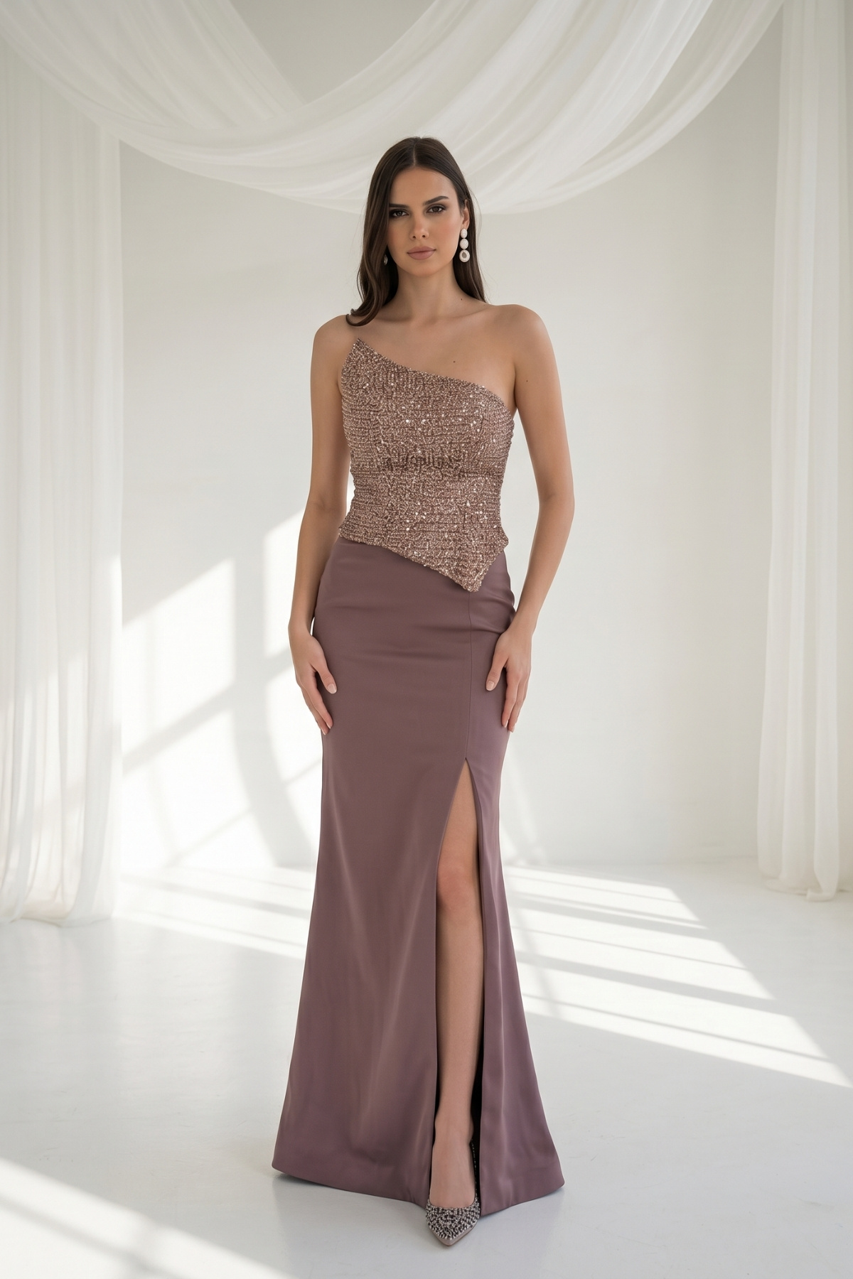 Bakır Asimetrik Yaka Gepiyerli İşlemeli Balık Abiye Elbise 27