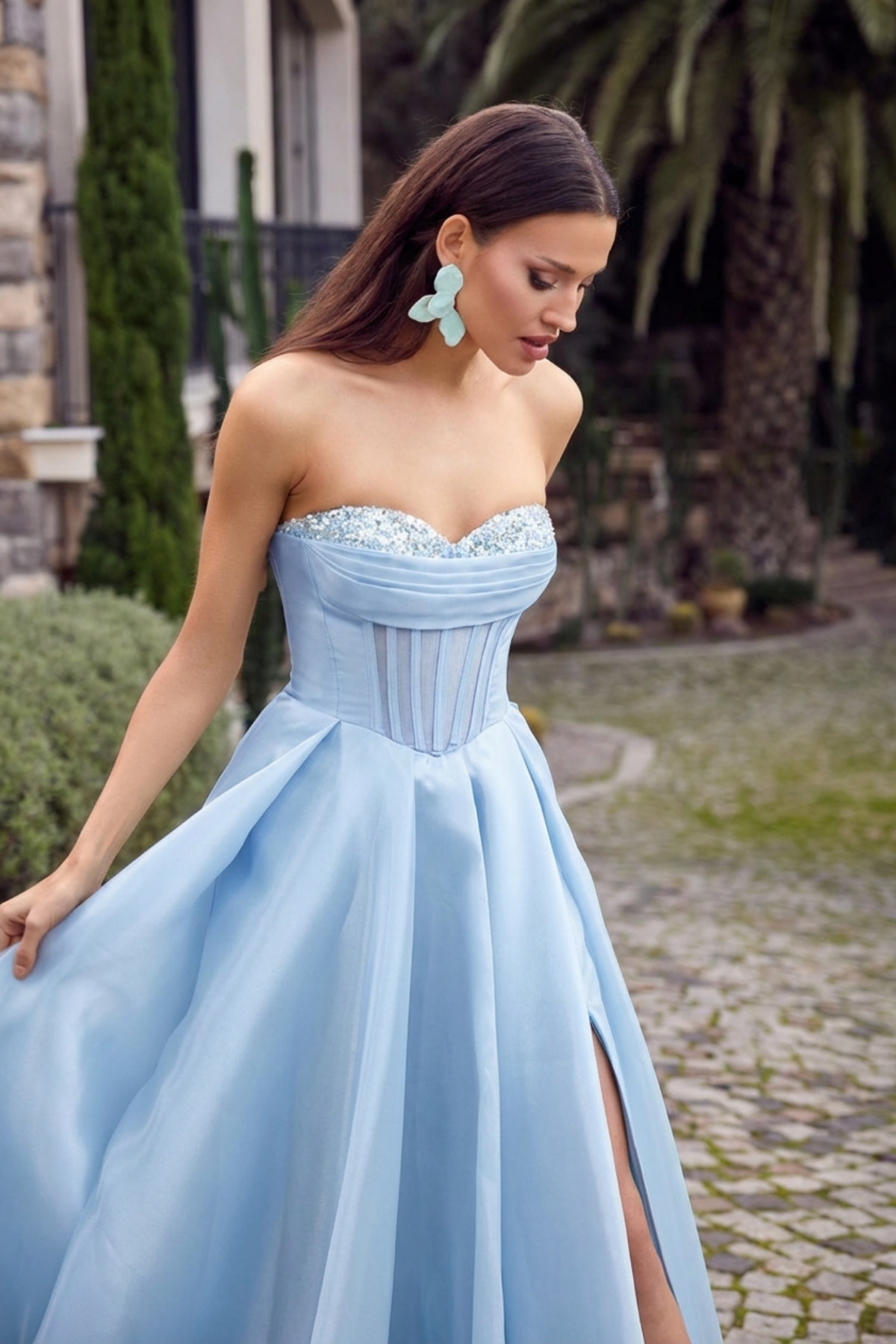 Bebe Mavisi Straplez Göğsü Payetli Mini Eldivenli Organze Abiye Elbise 49