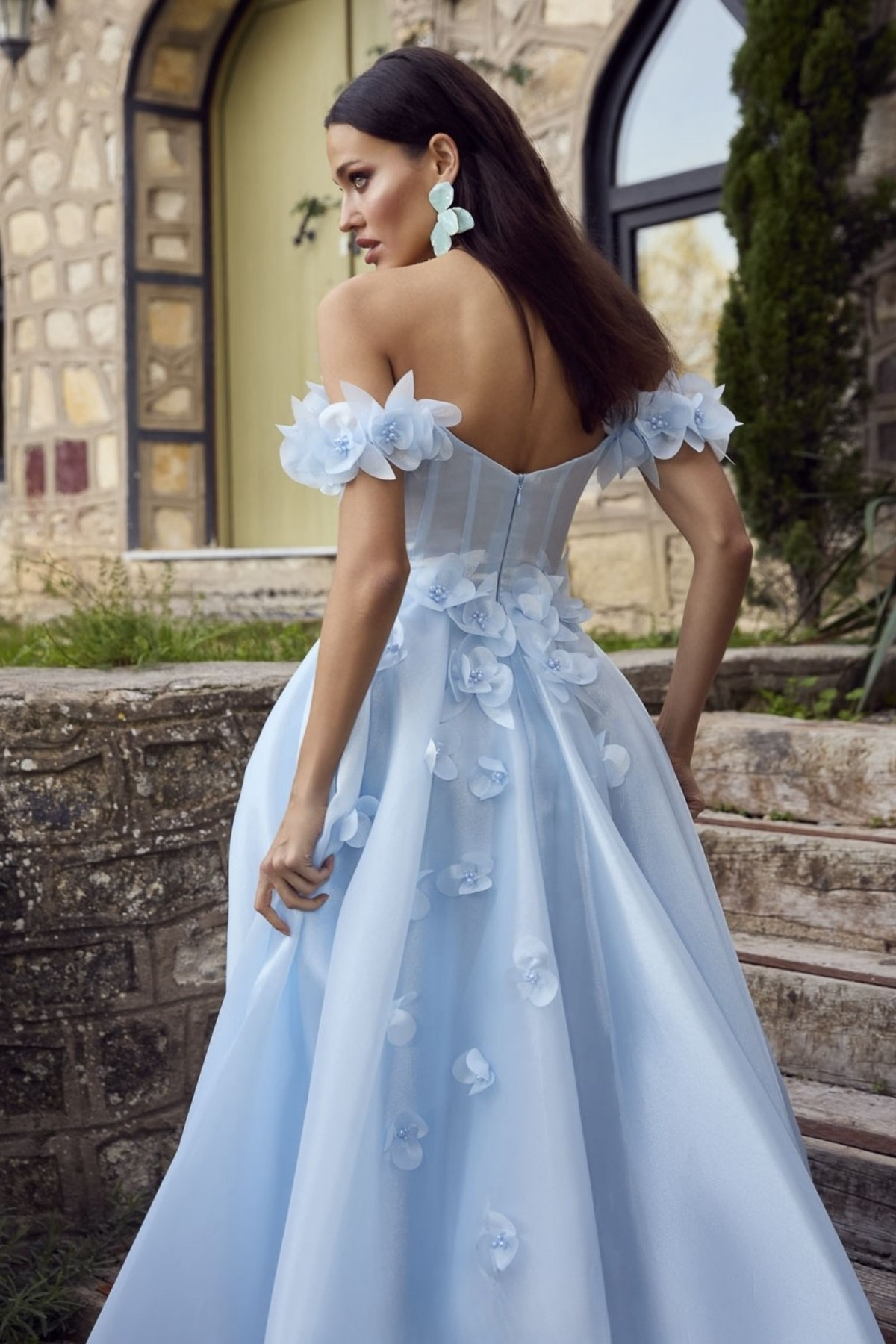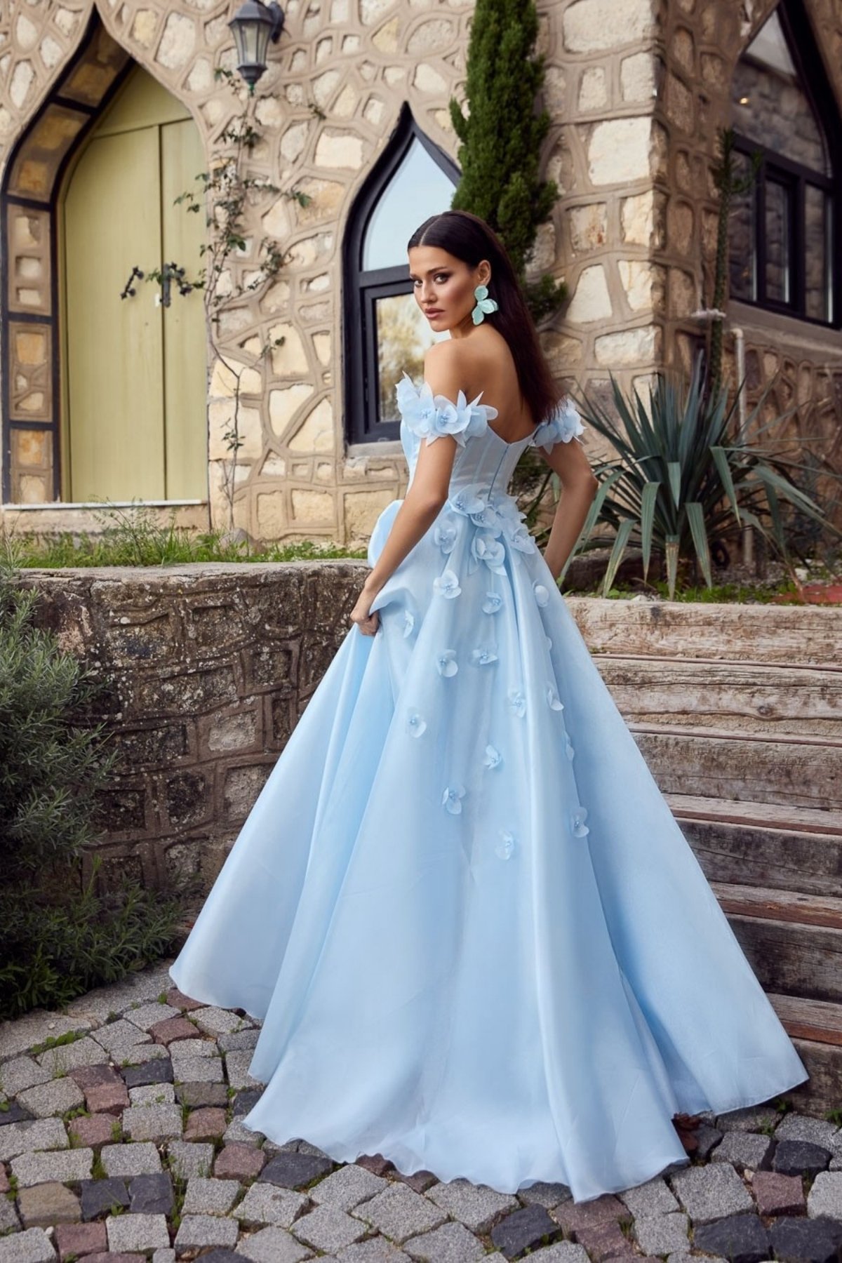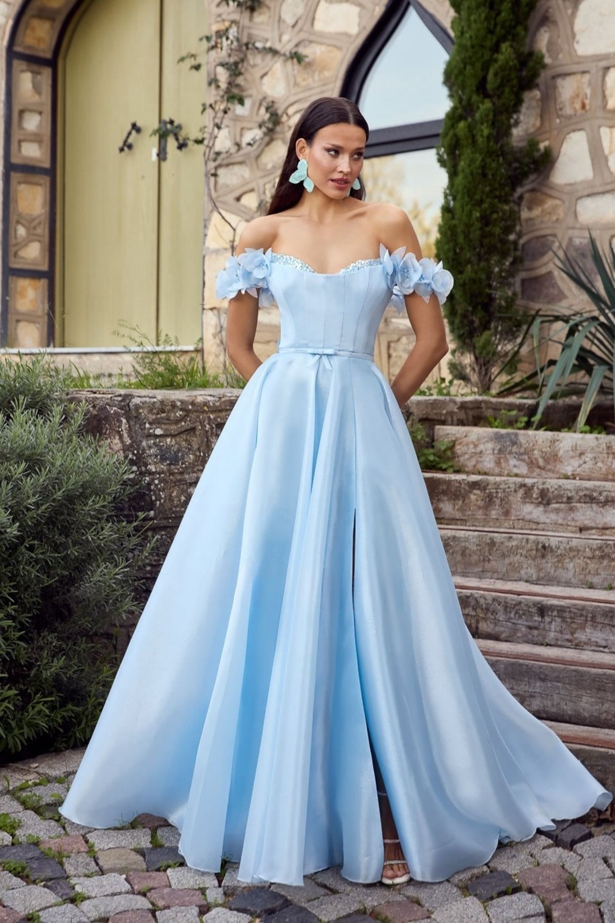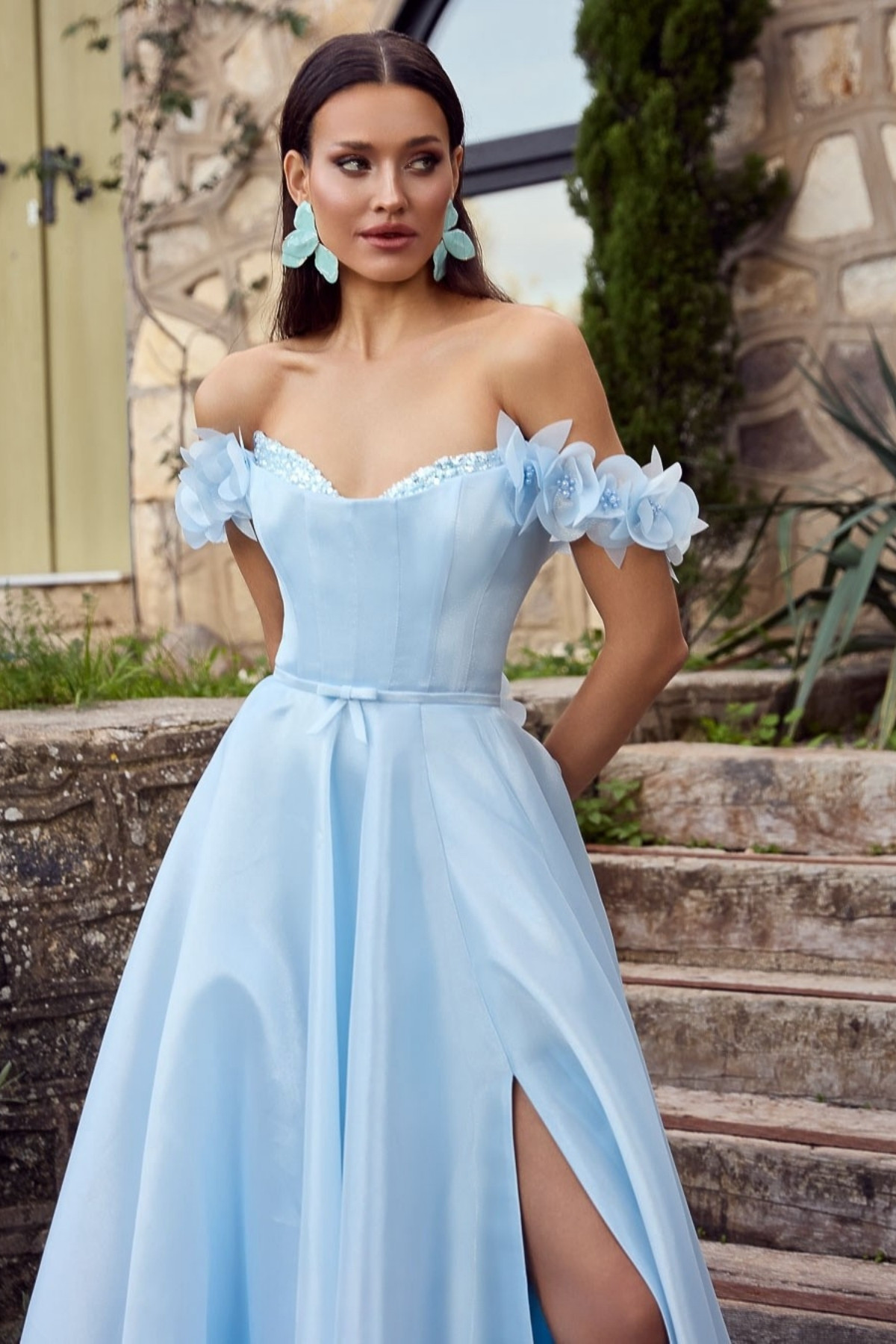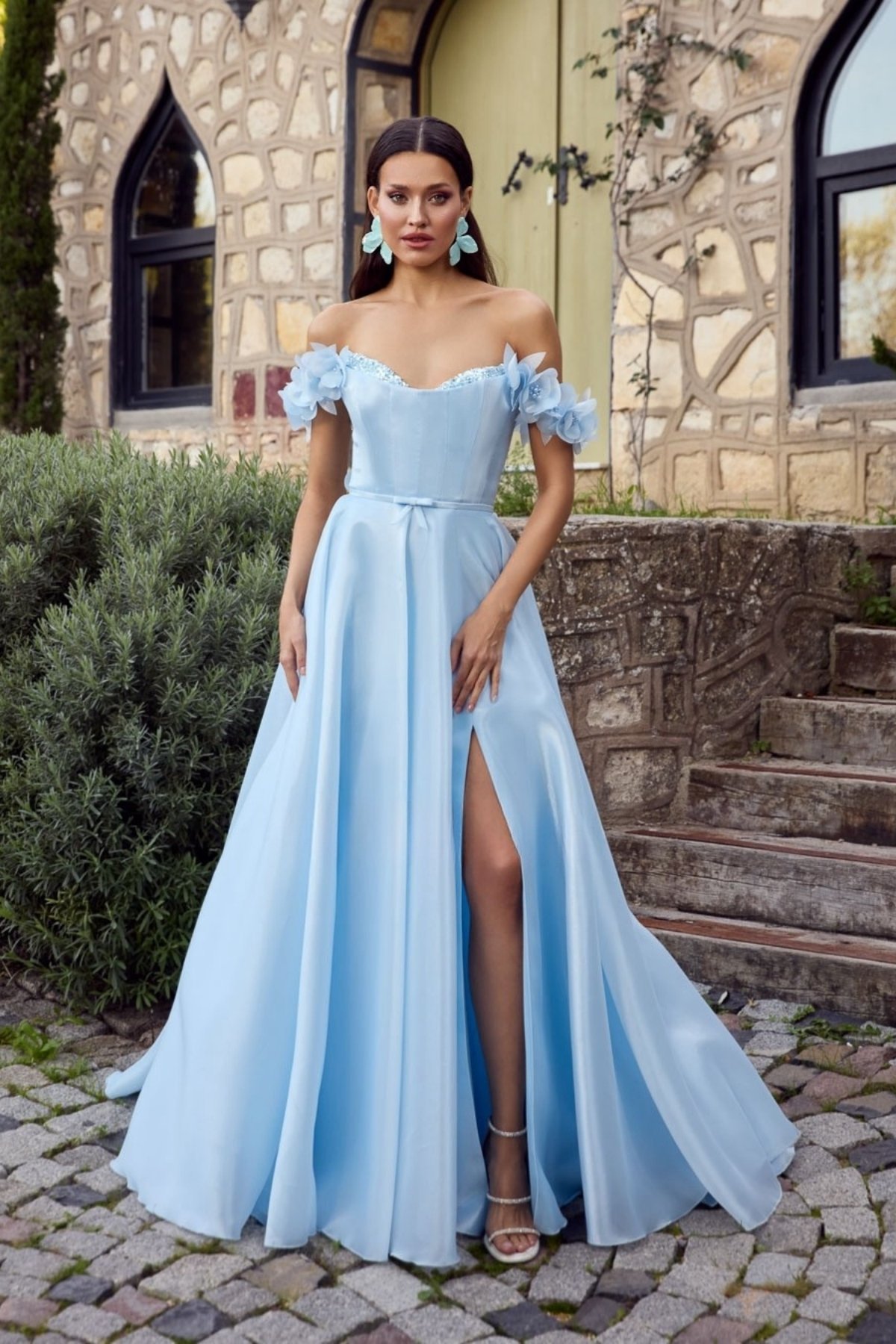 Bebe Mavisi Straplez Göğsü Taşlı Düşük Kol Kollar Çiçekli Abiye Elbise 71