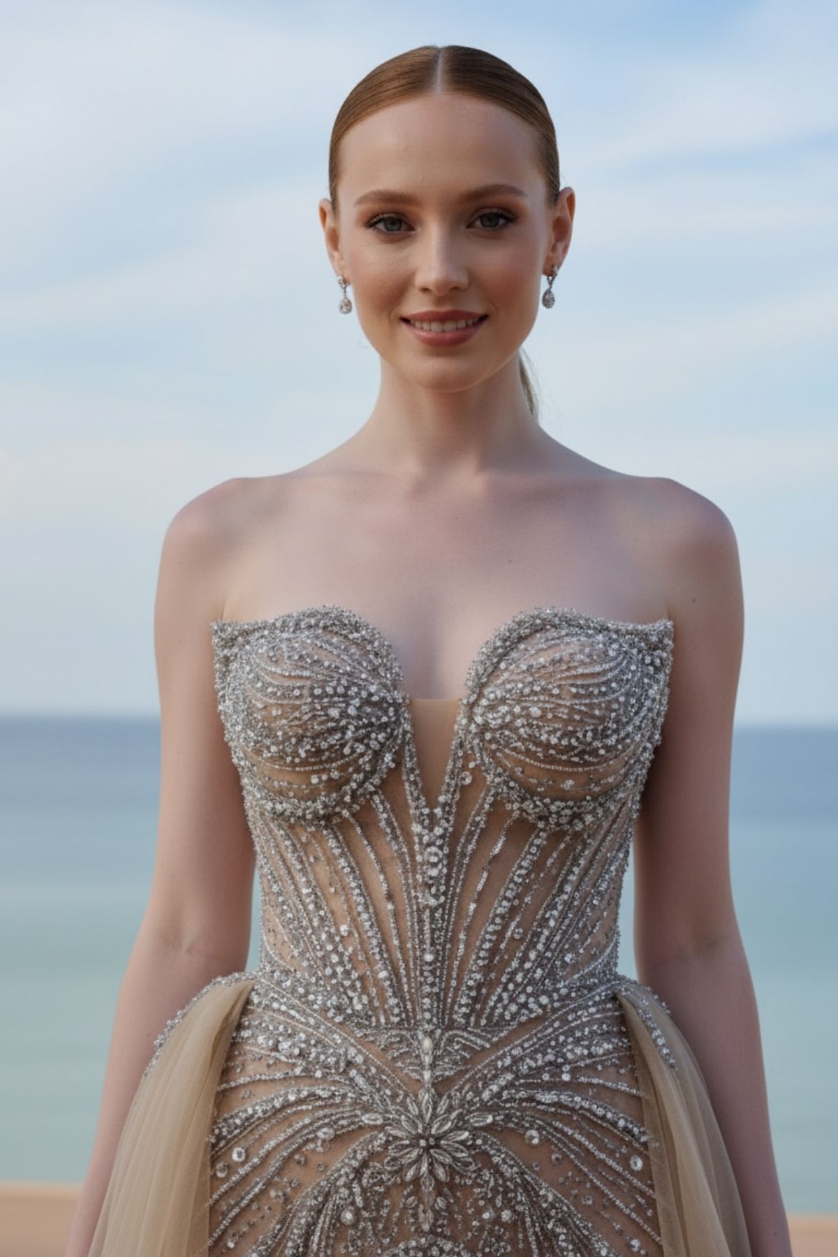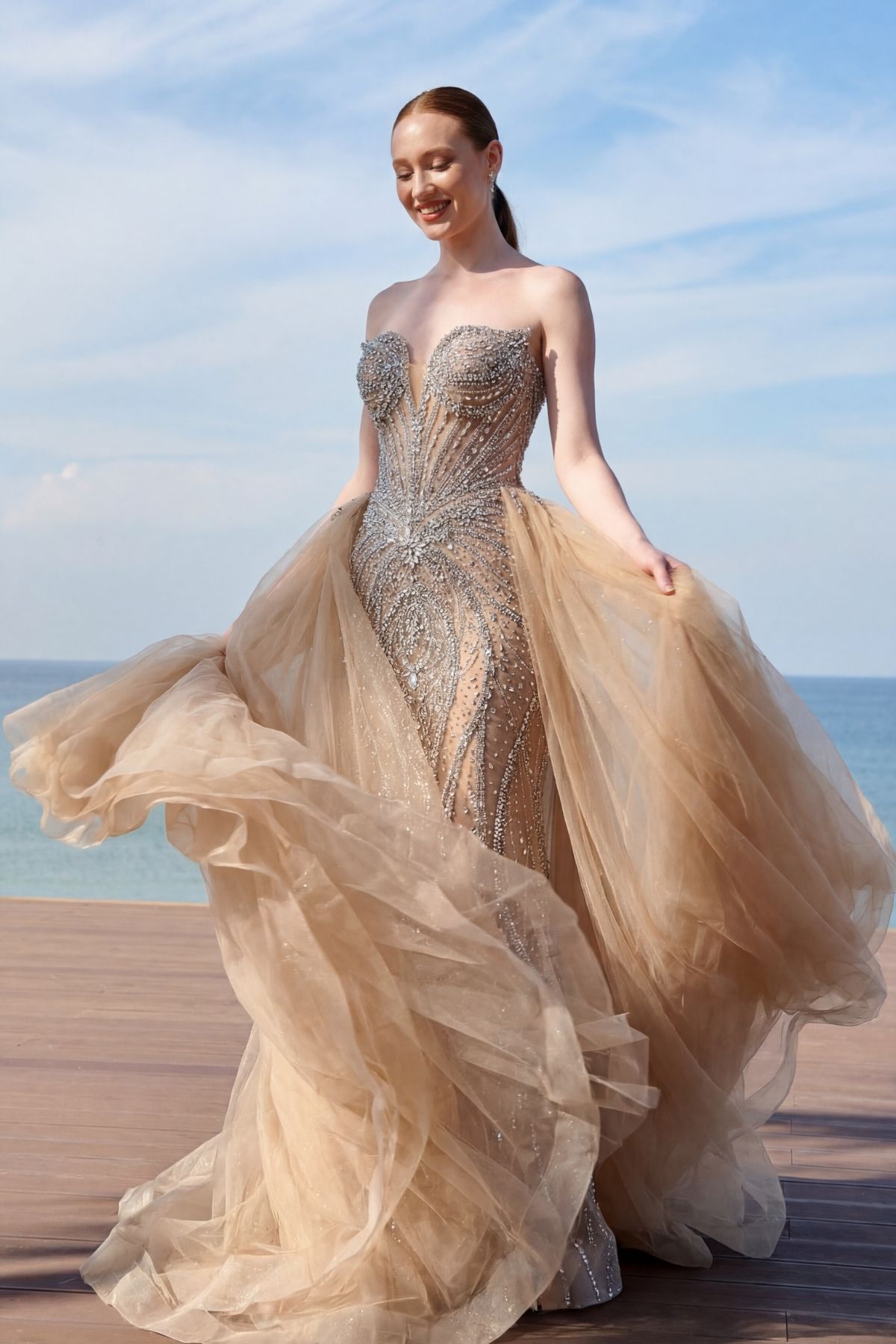 Bej Straplez Balık Takma Etekli İthal Abiye Elbise 36