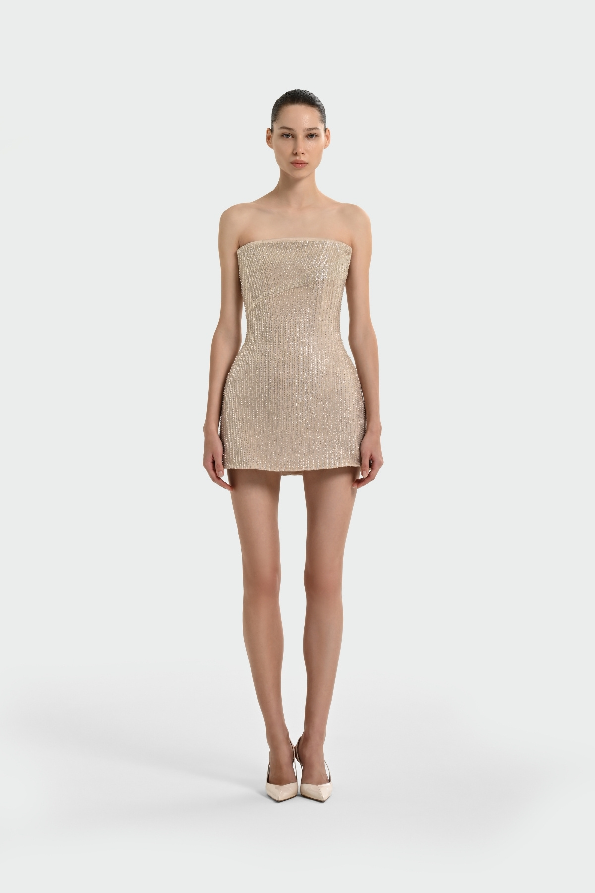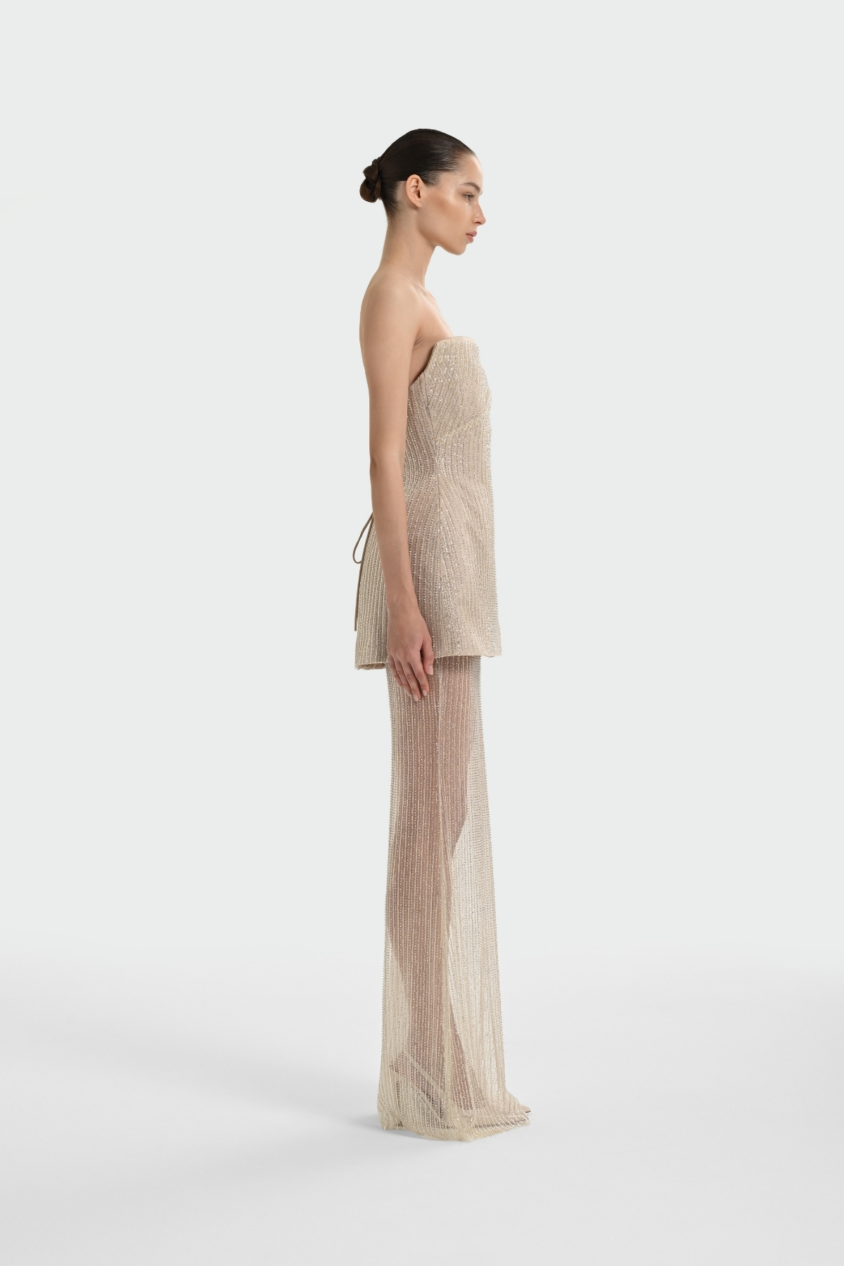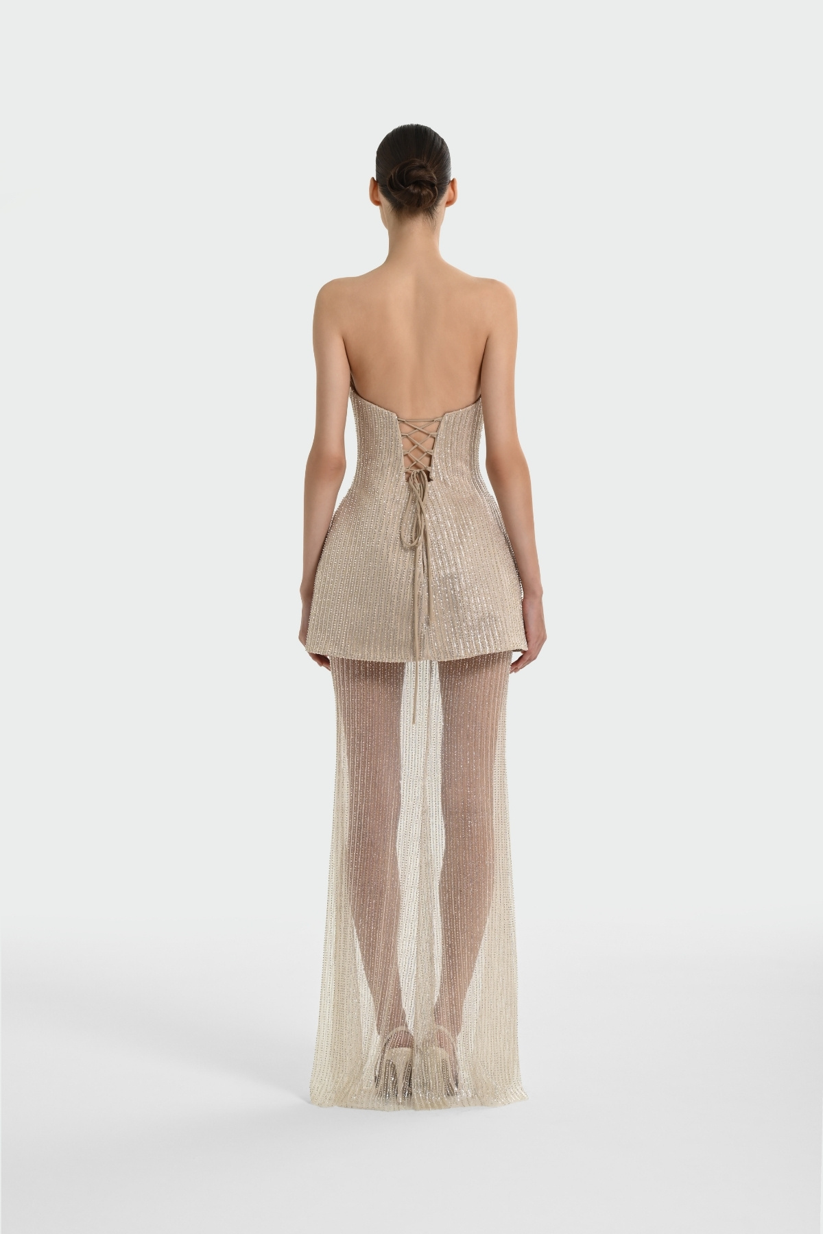 Bej Straplez Taşlı KumaşTransparan Etek Abiye Elbise 72