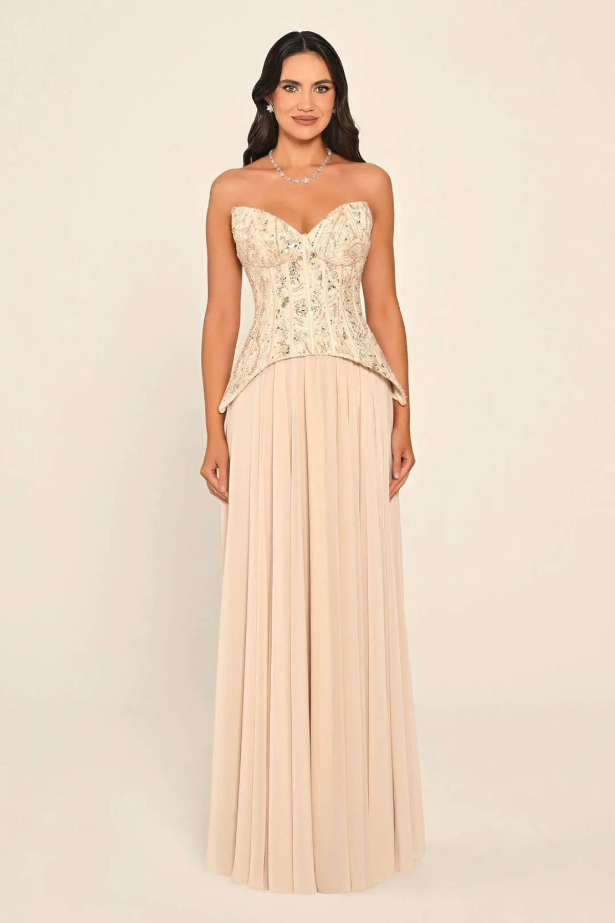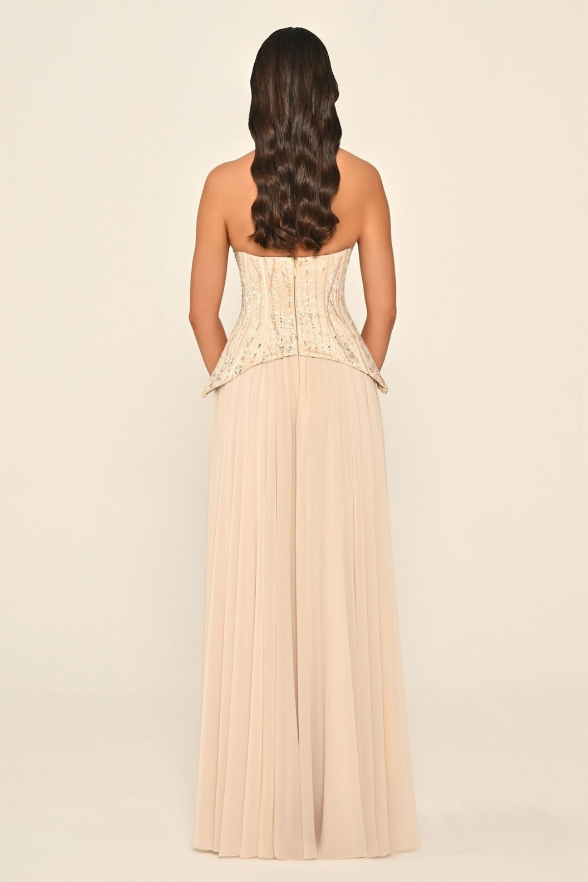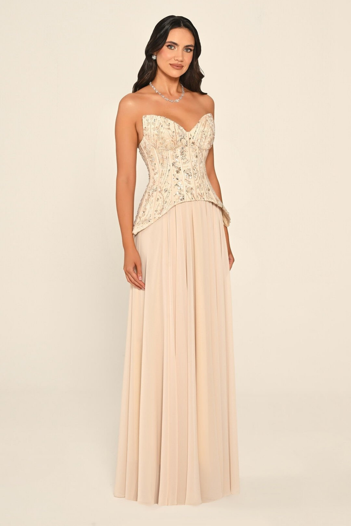 Bej Straplez Üstü Üç Boyut Çiçekli Şifon Uzun Abiye Elbise 76