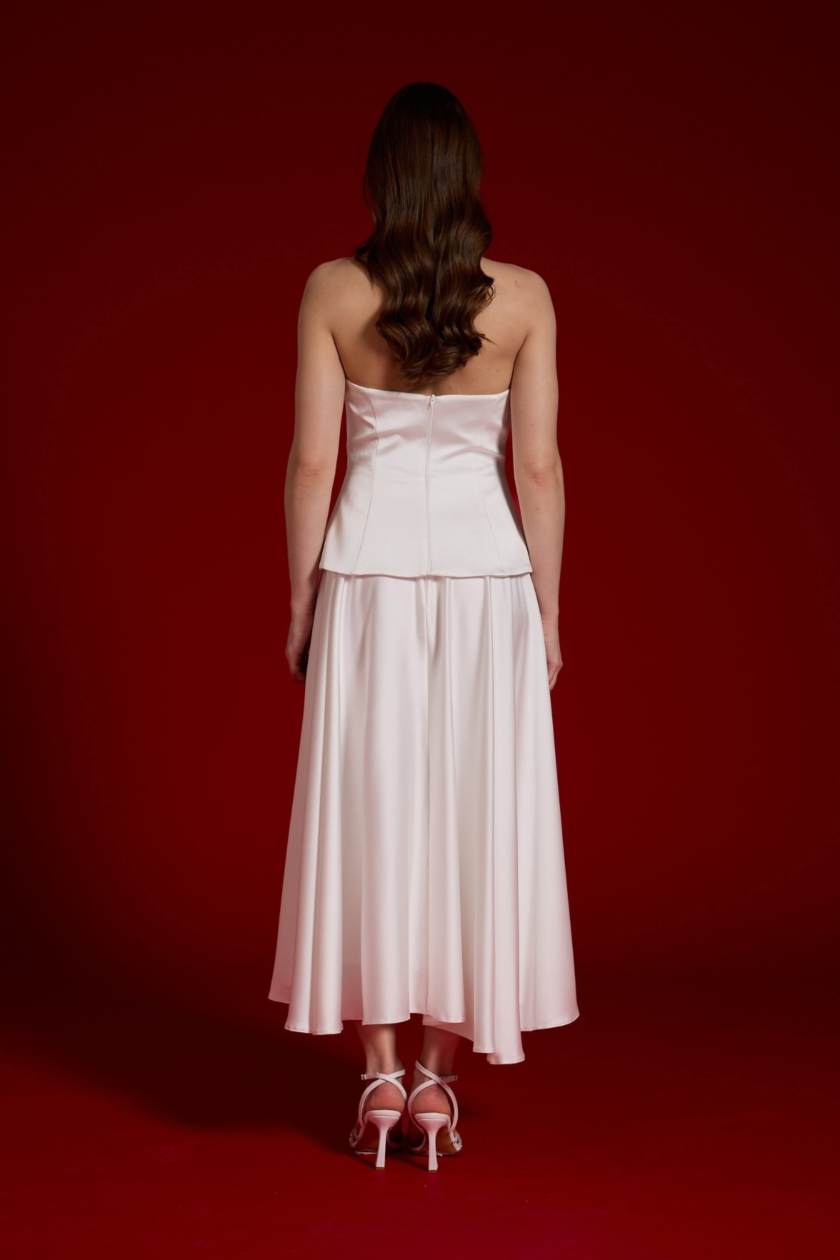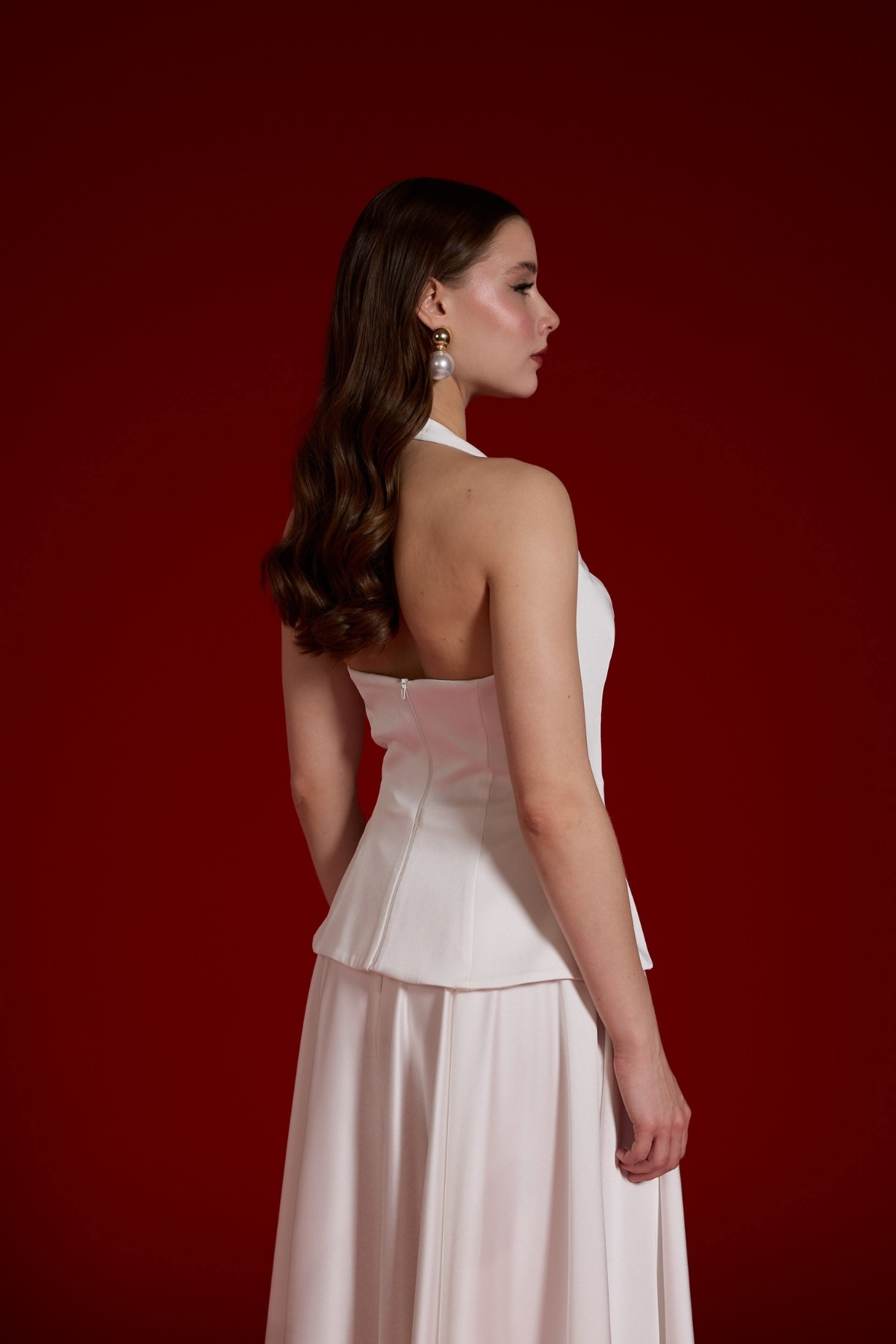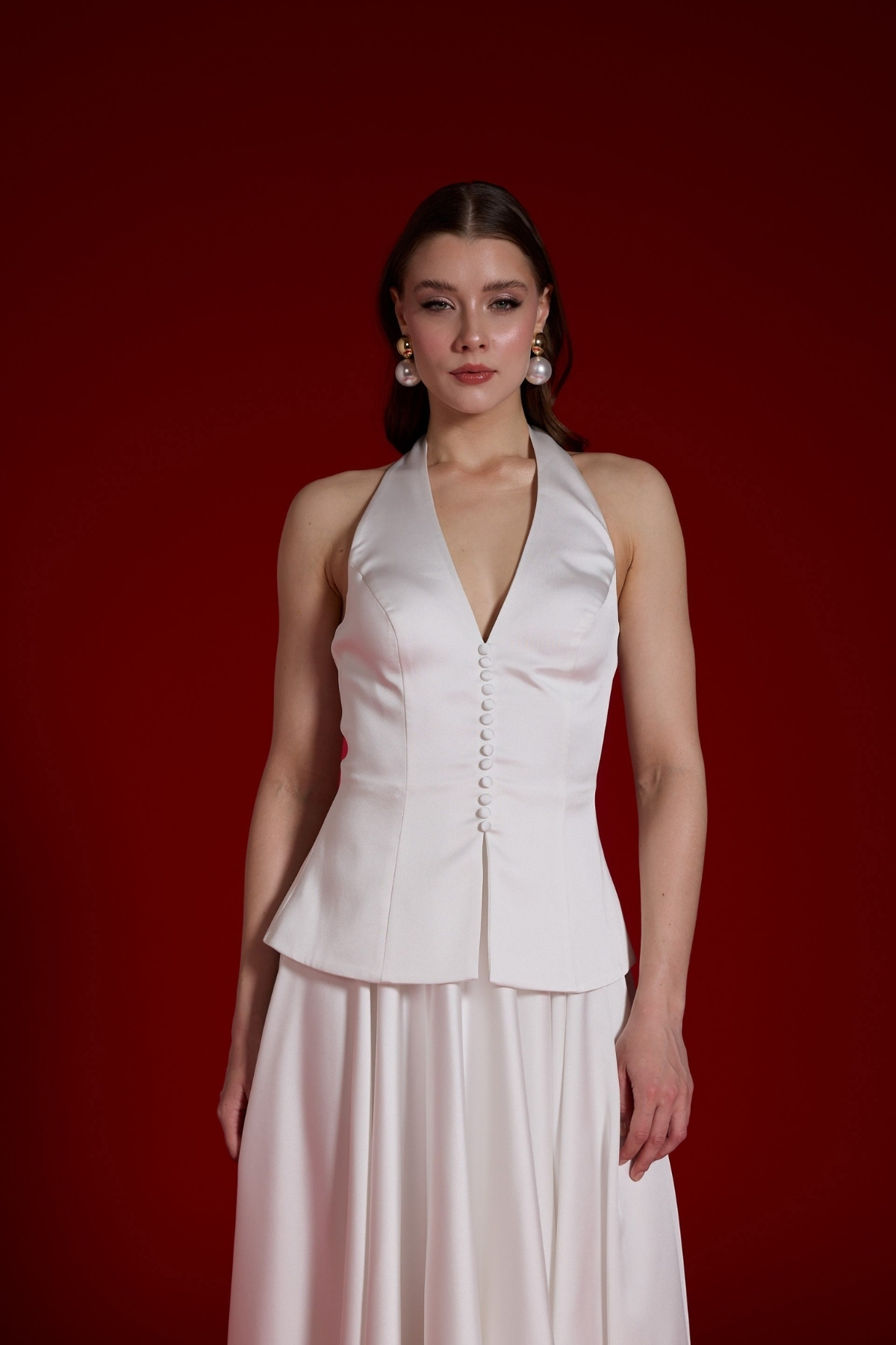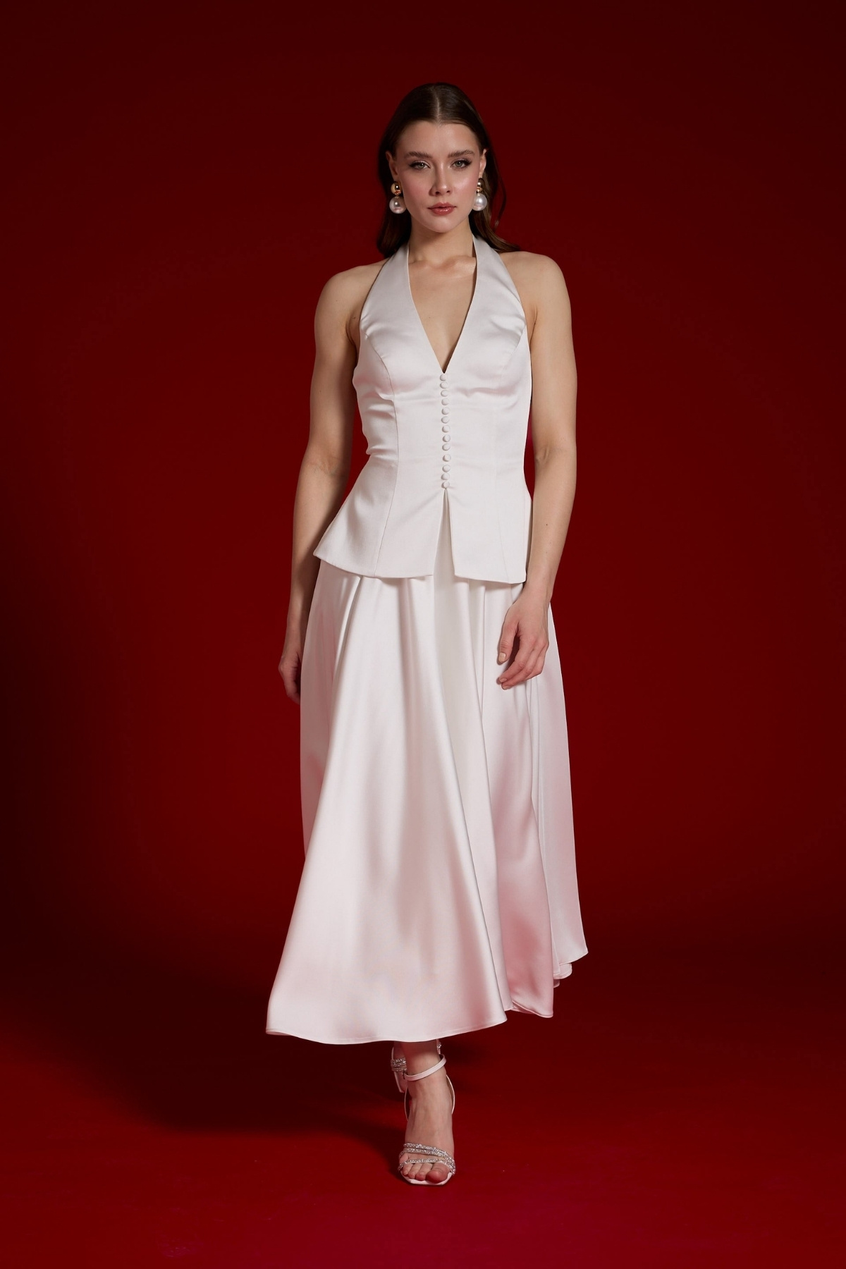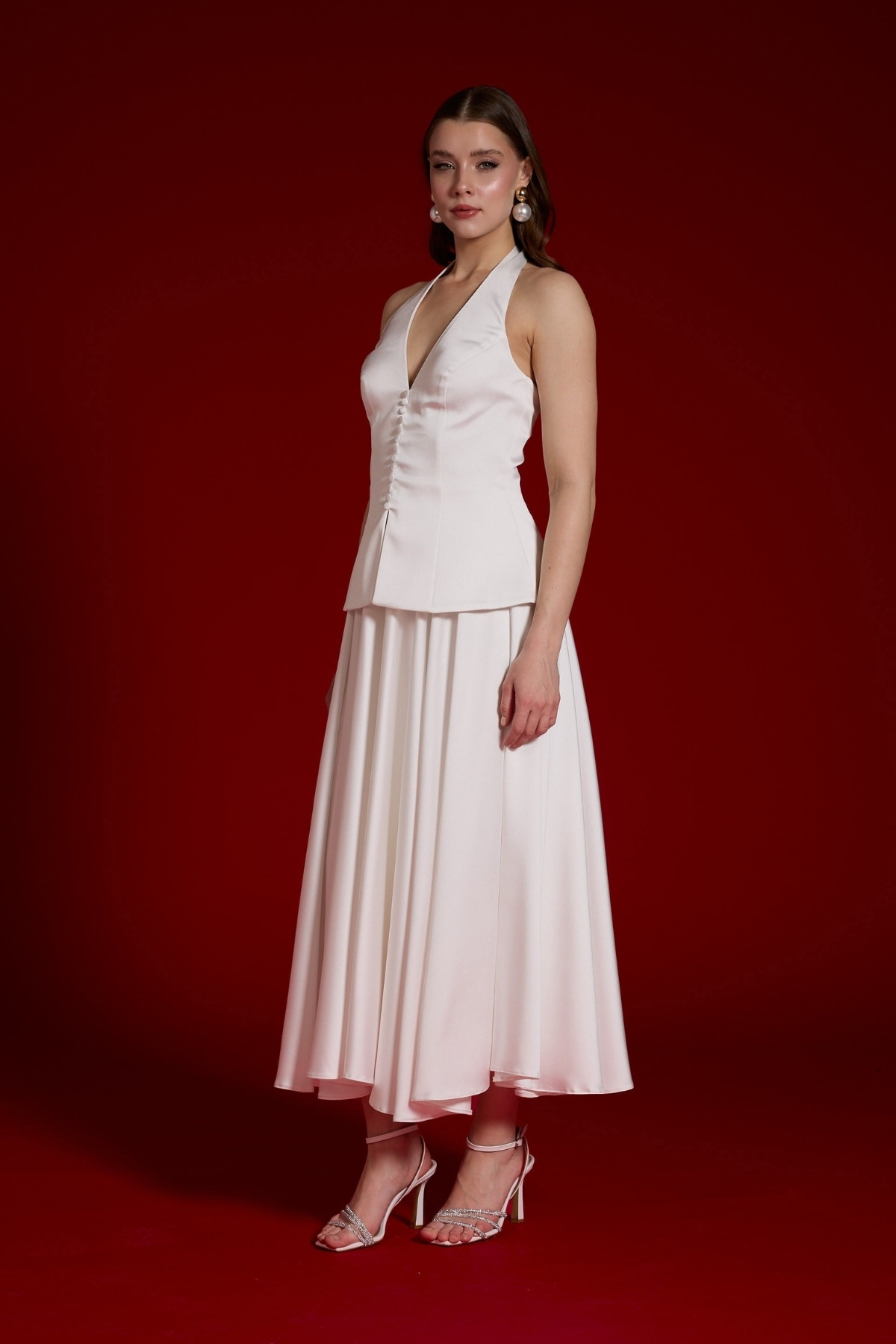 Beyaz Boyundan Bağlamalı Düğmeli Kloş Midii Abiye Elbise 74