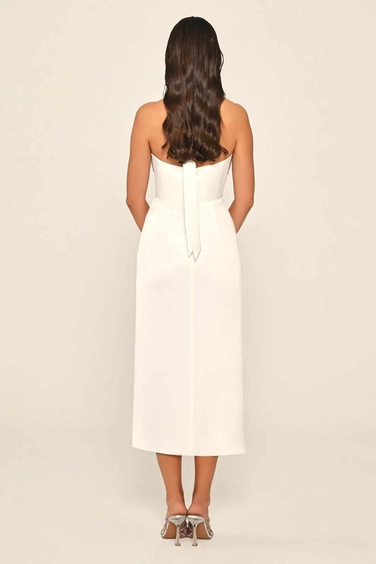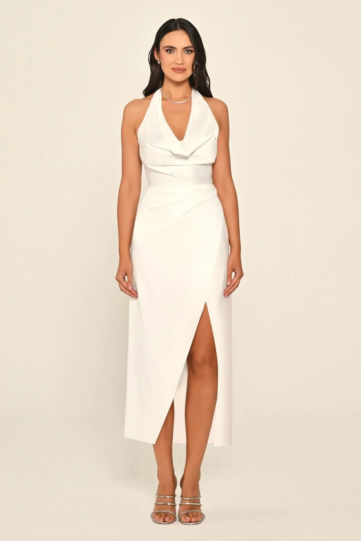 Beyaz Boyundan Bağlı Degaje Yaka Anvelop Midi Abiye Elbise 72