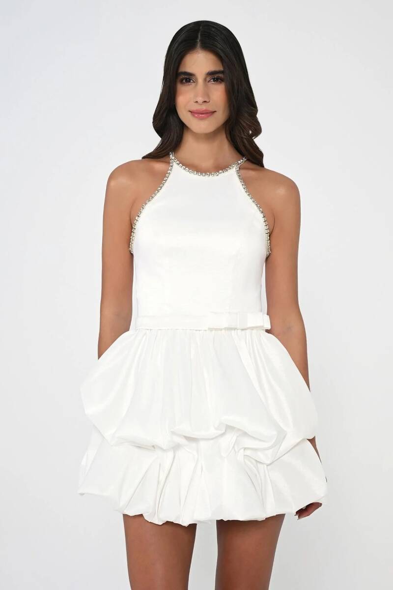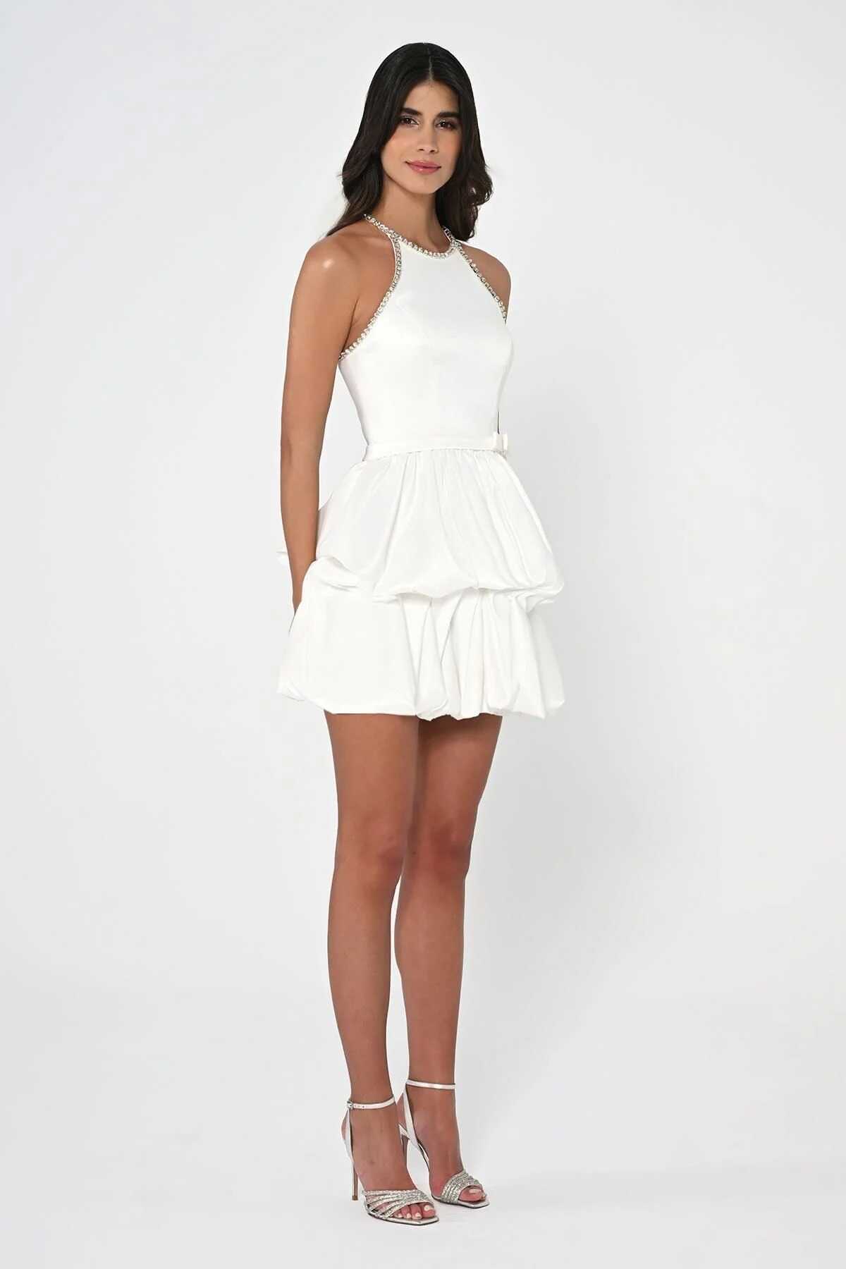 Beyaz Stefane Yaka Şerit Taşlı Balon Mini Abiye Elbise 13