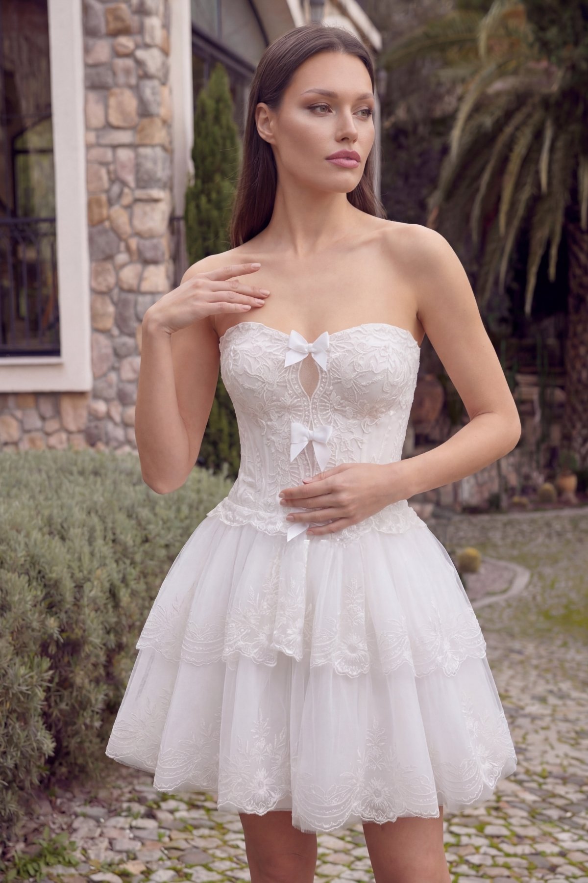 Beyaz Straplez Göğüs Kurdeleli Kat Kat Dantelli Mini Abiye Elbise 17