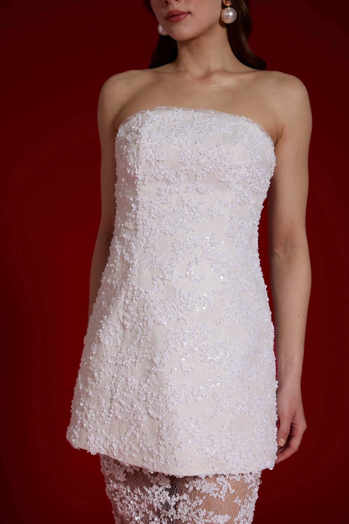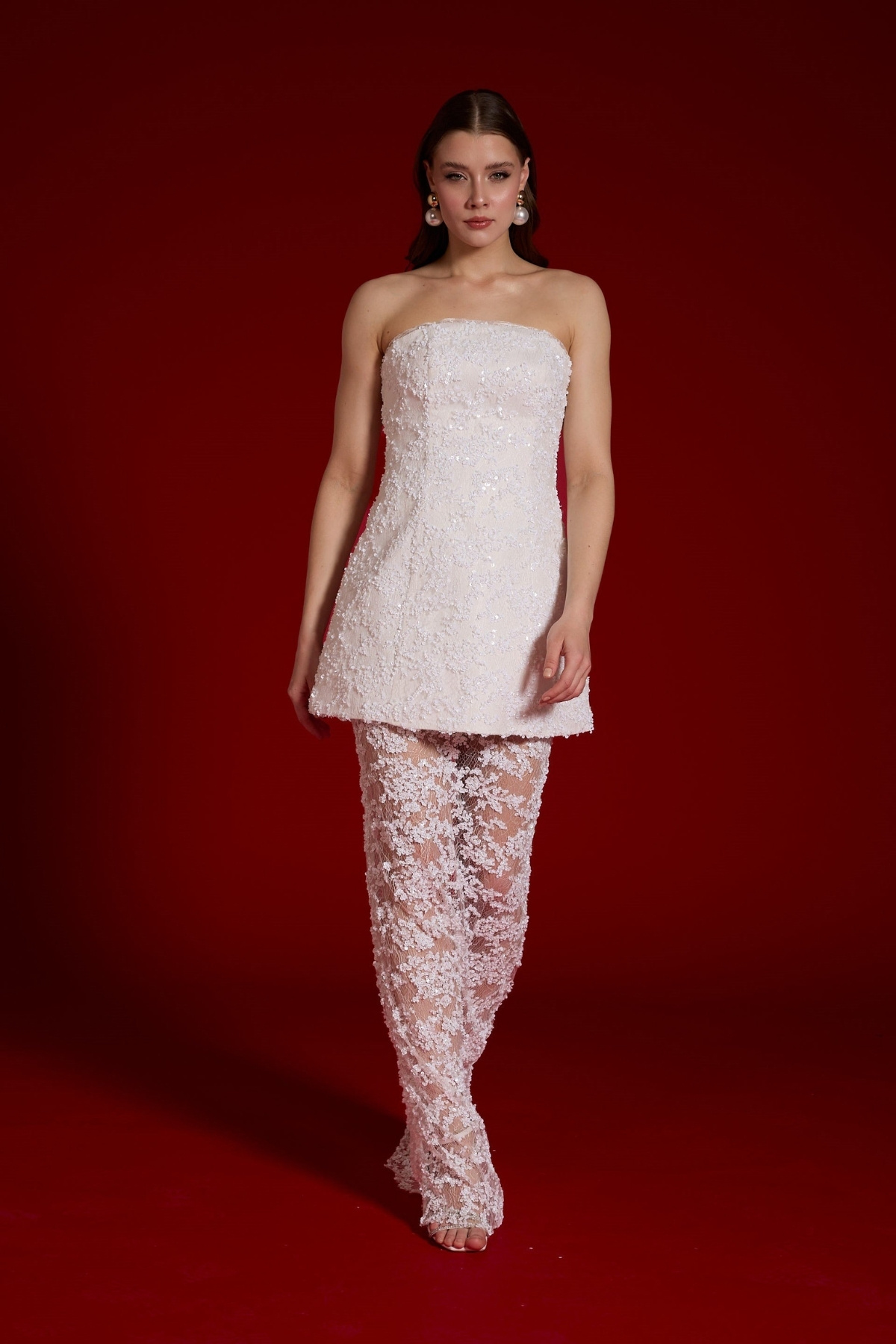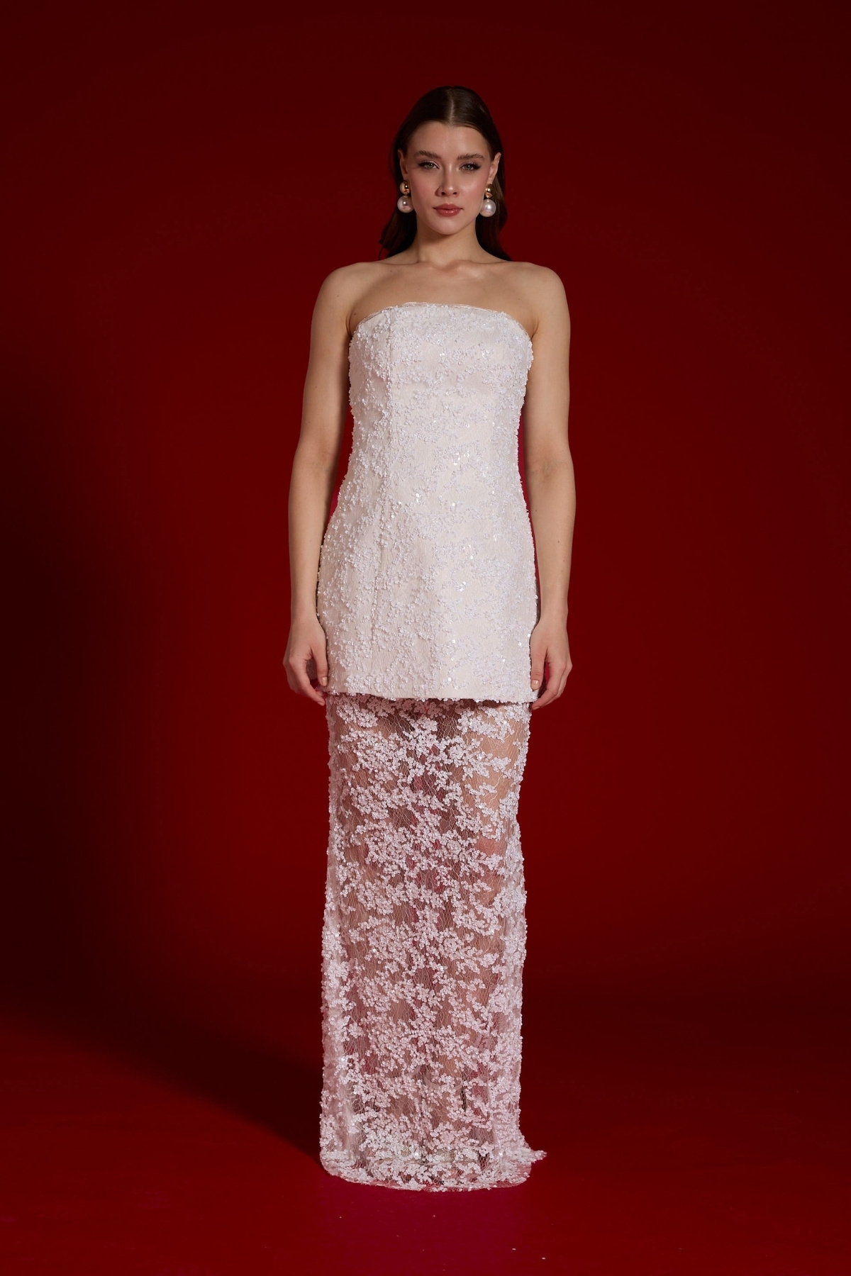 Beyaz Straplez Payetli Transparan Etekli Abiye Elbise 25