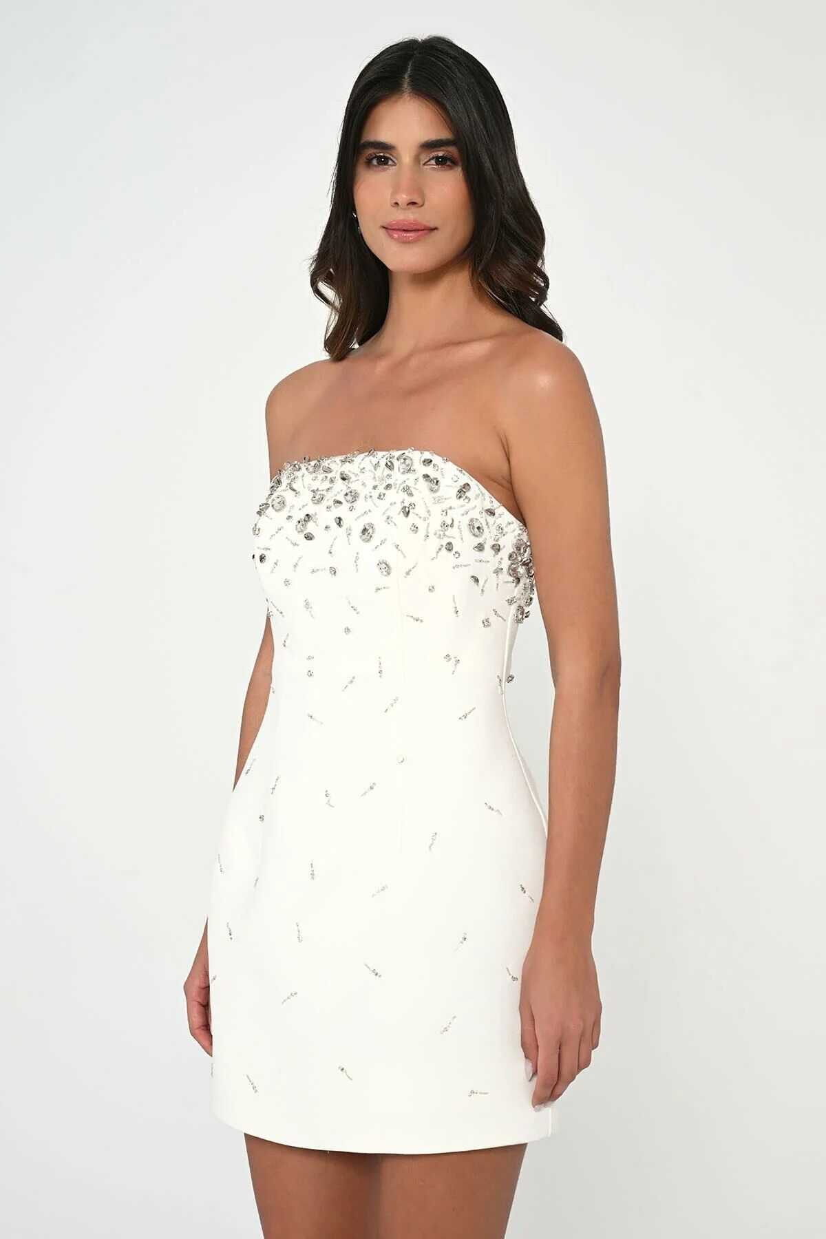 Beyaz Straplez Üç Boyutlu Taşlı Mini Abiye Elbise 10