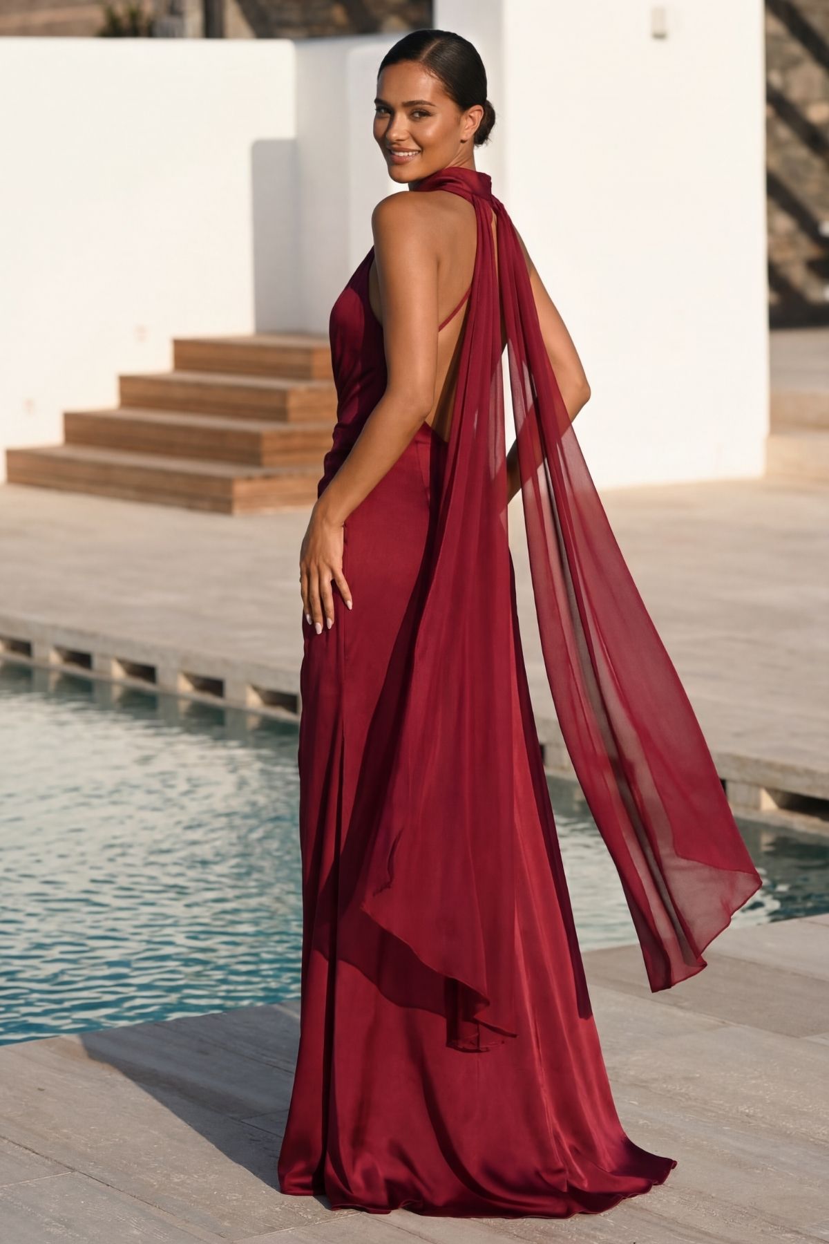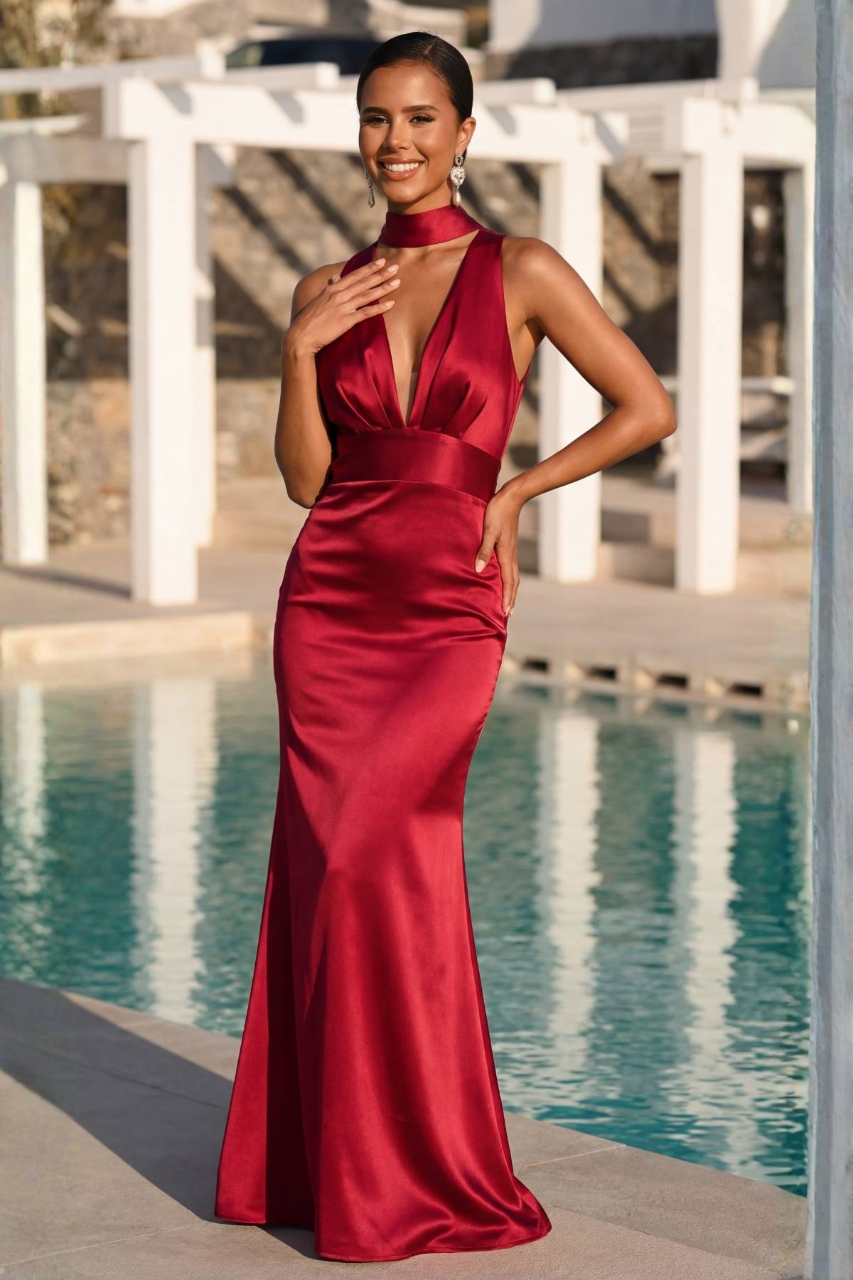 Bordo Boyundağ Bağlamalı Sırt Dekolteli Saten Abiye Elbise 77