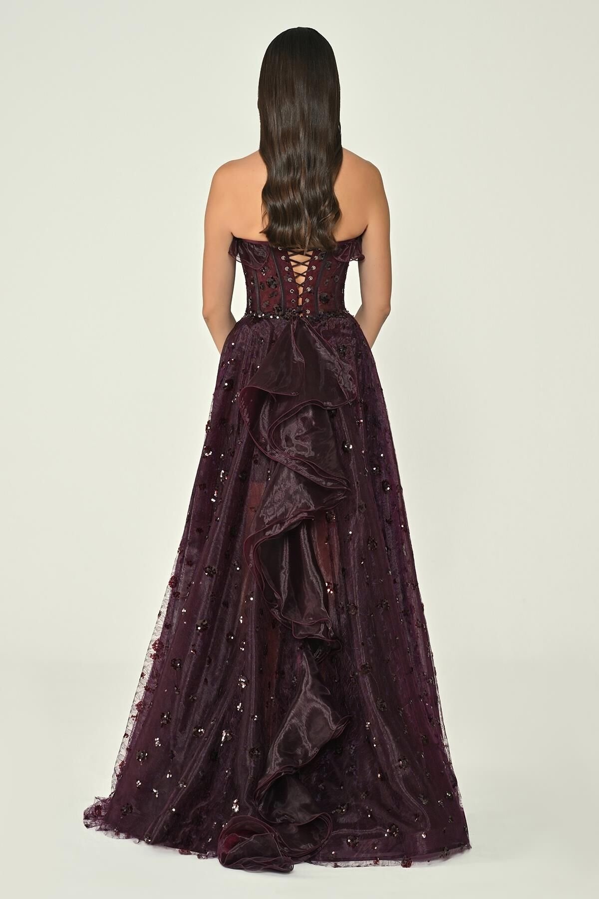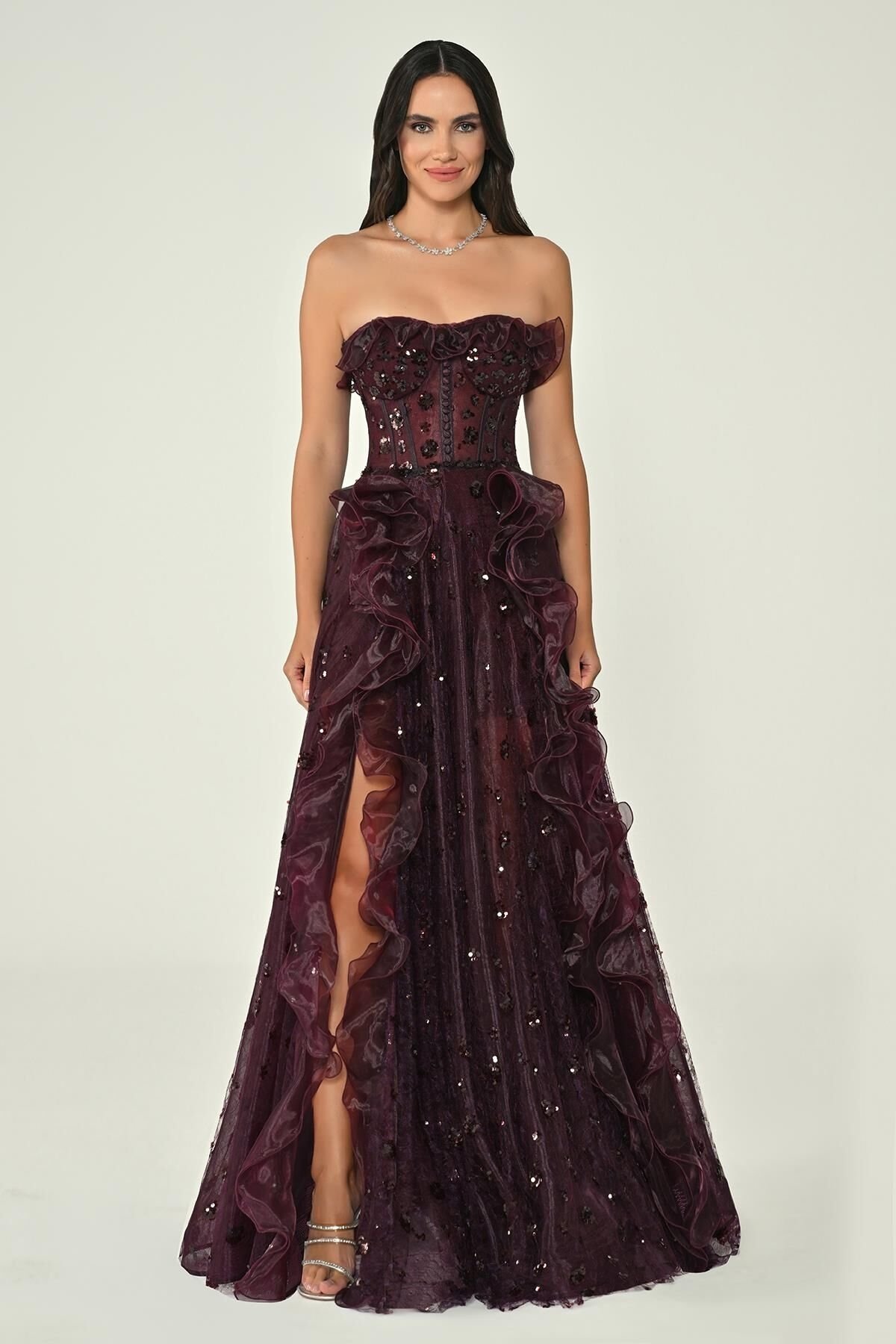 Bordo Straplez Büstiyerli İçi Mini Payetli Volanlı Abiye Elbise 31