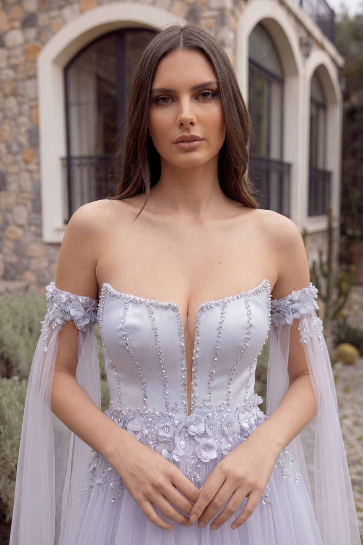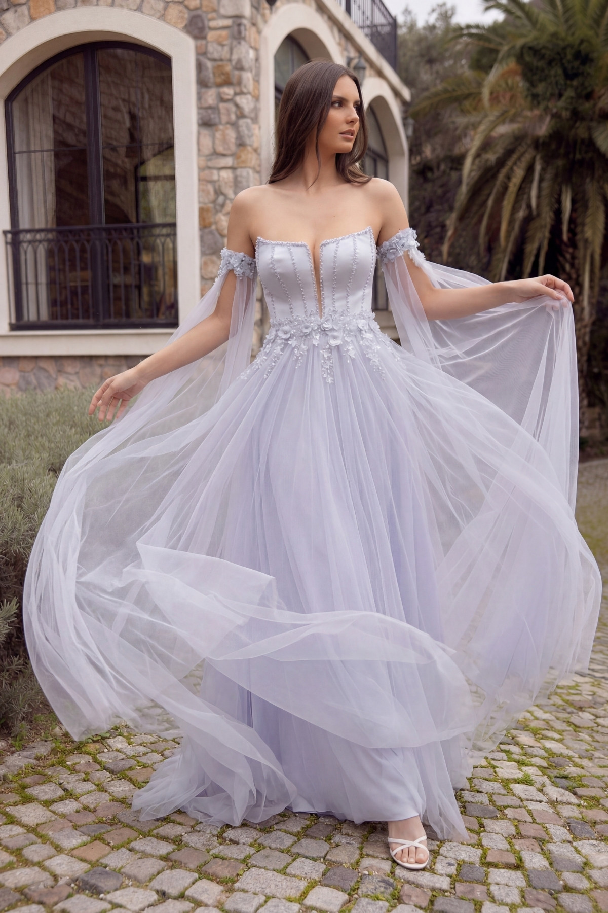 Buz Mavi Straplez Çiçekli Pelerin Kol Tül Abiye Elbise 57