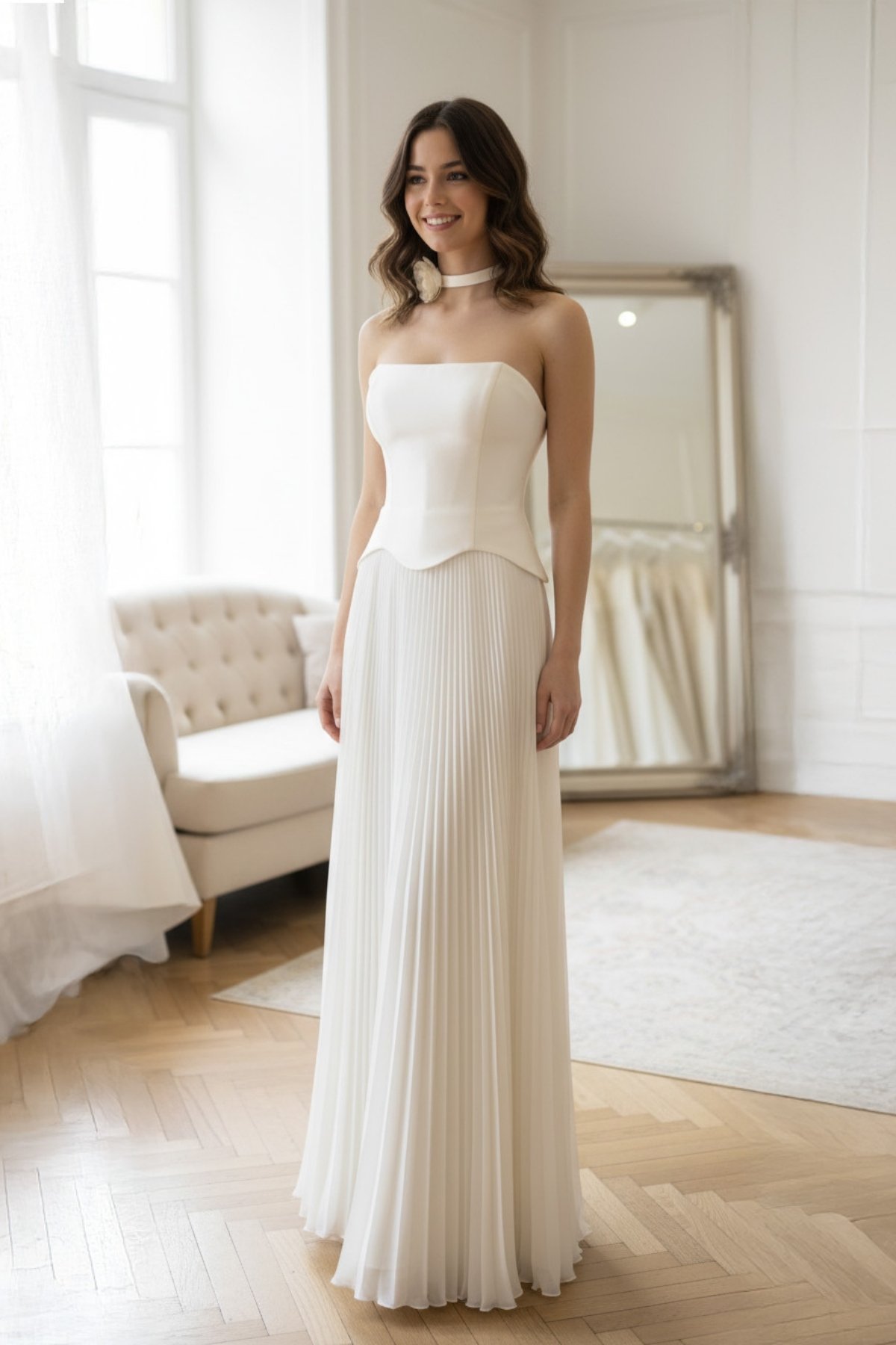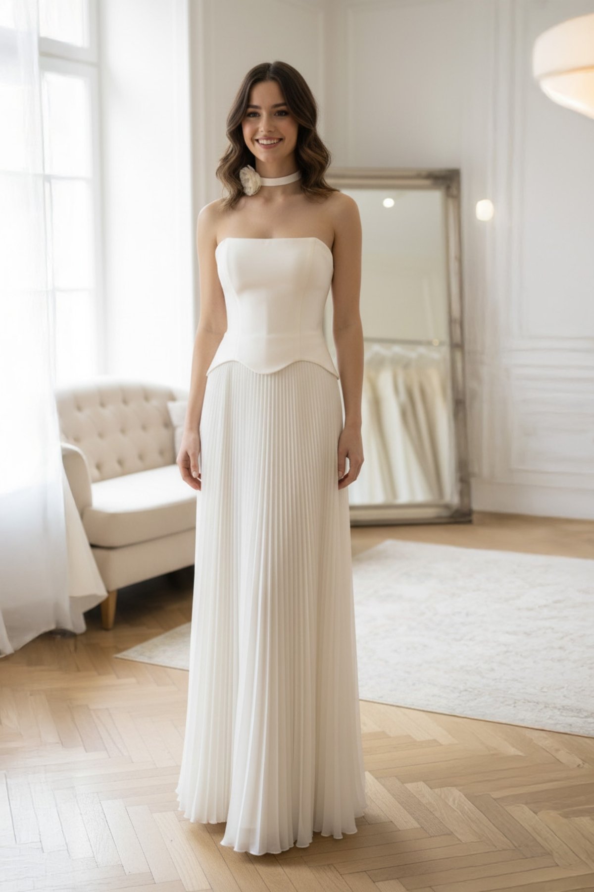 Ekru Straplez Eteği Plise Biritli Abiye Elbise 70