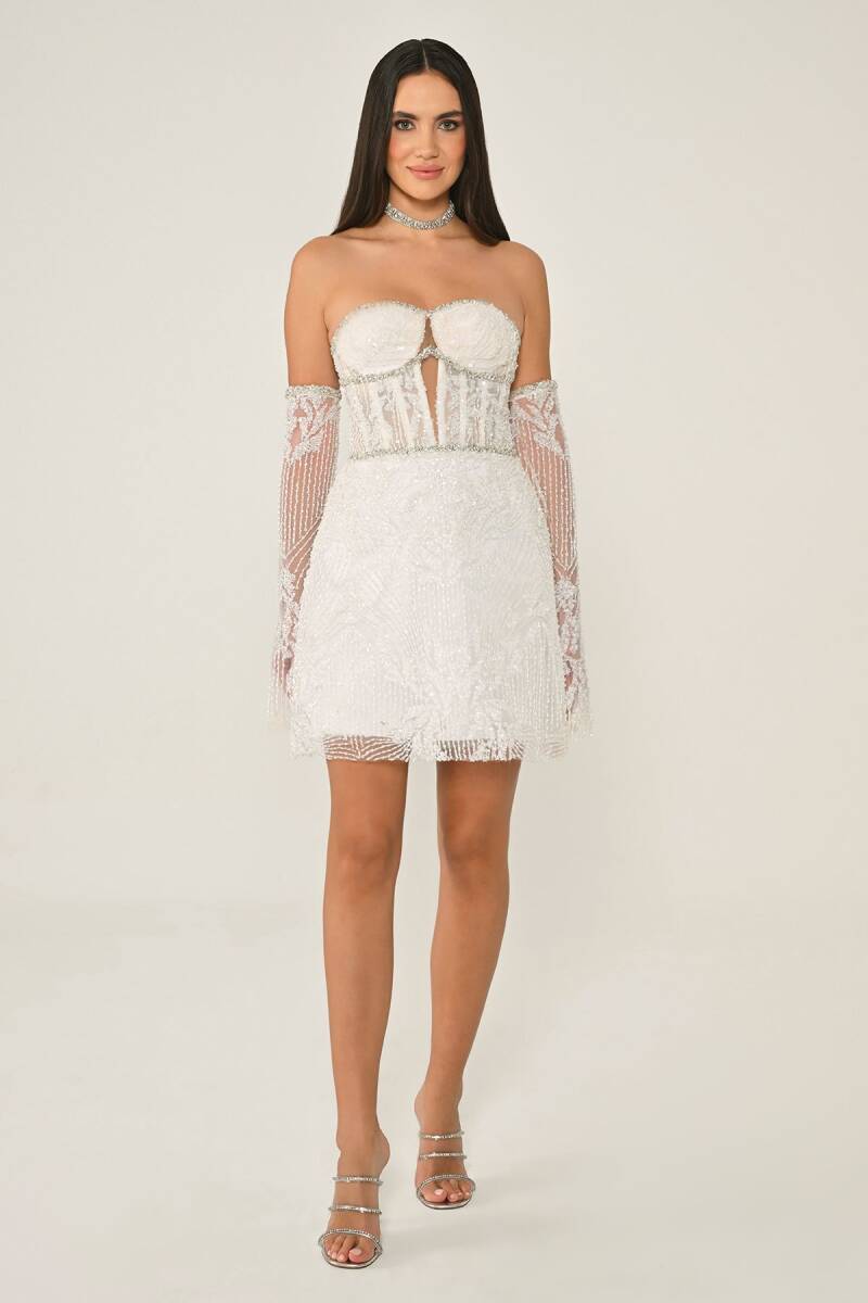 Ekru Straplez Korsajlı İşlemeli Tak Çıkar Kol Mini Abiye Elbise 96