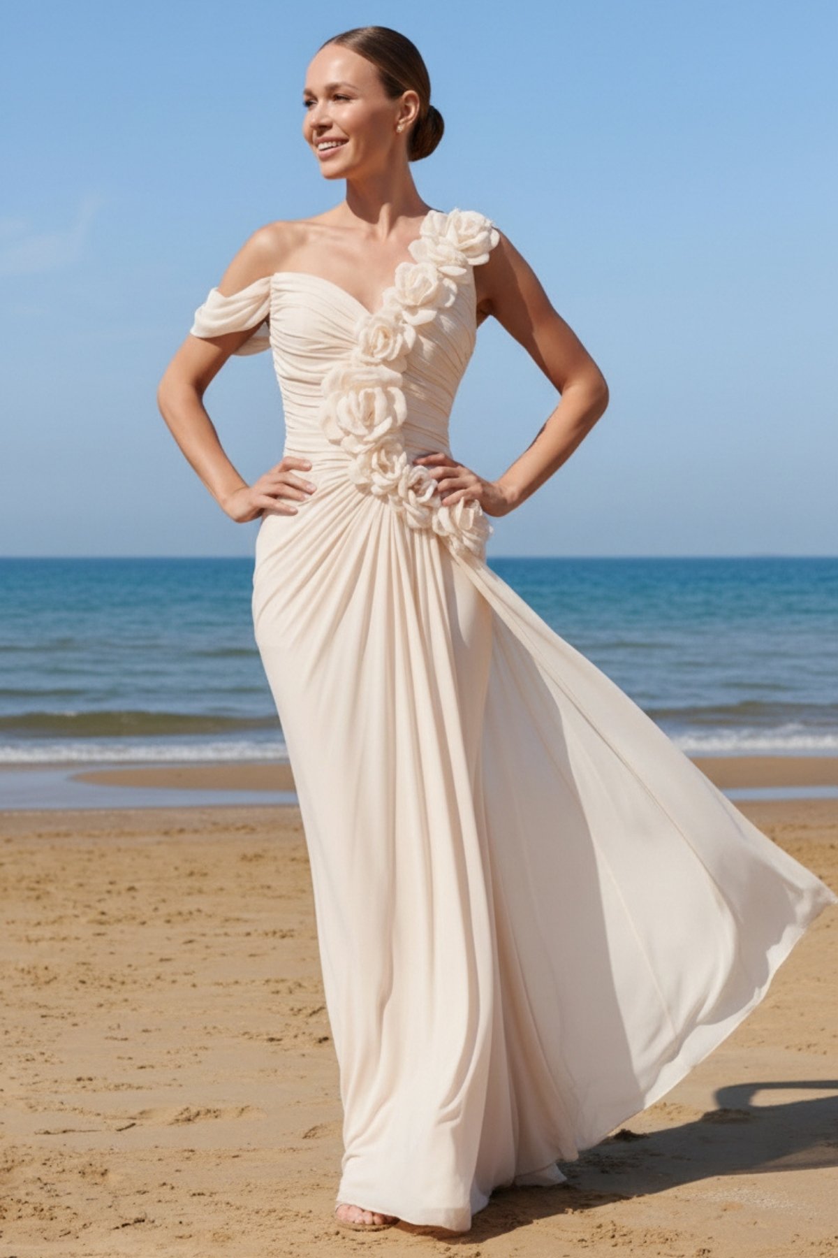 Ekru Tek Omuz Düşük Kol Drapeli Güllü Şifon Abiye Elbise 96