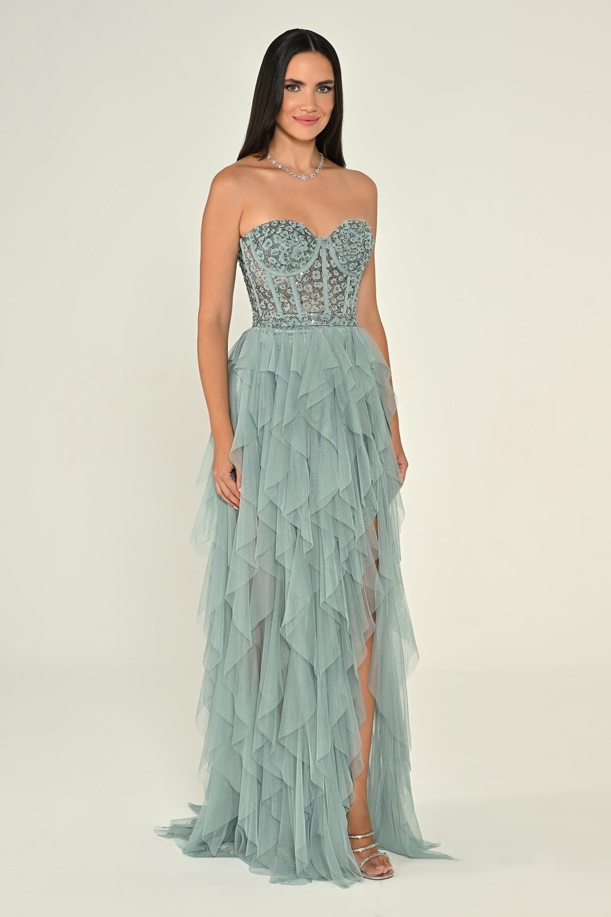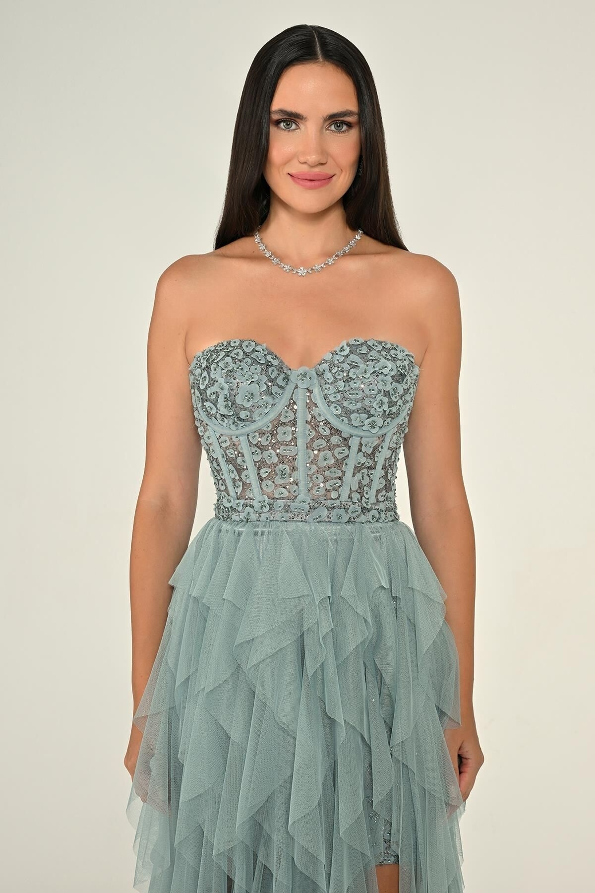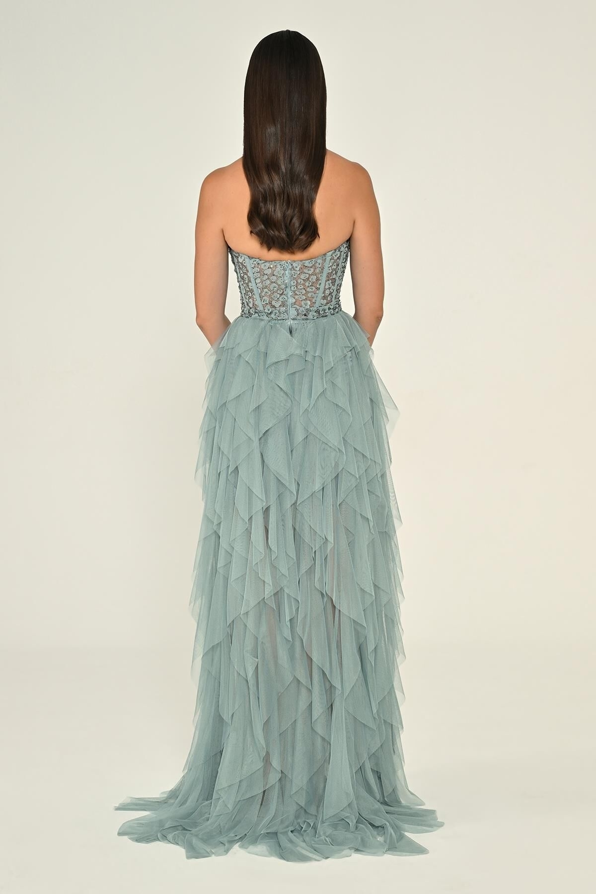 Firuze Straplez İşlemeli Büstiyerli Fırfırlı Tül Abiye Elbise 56