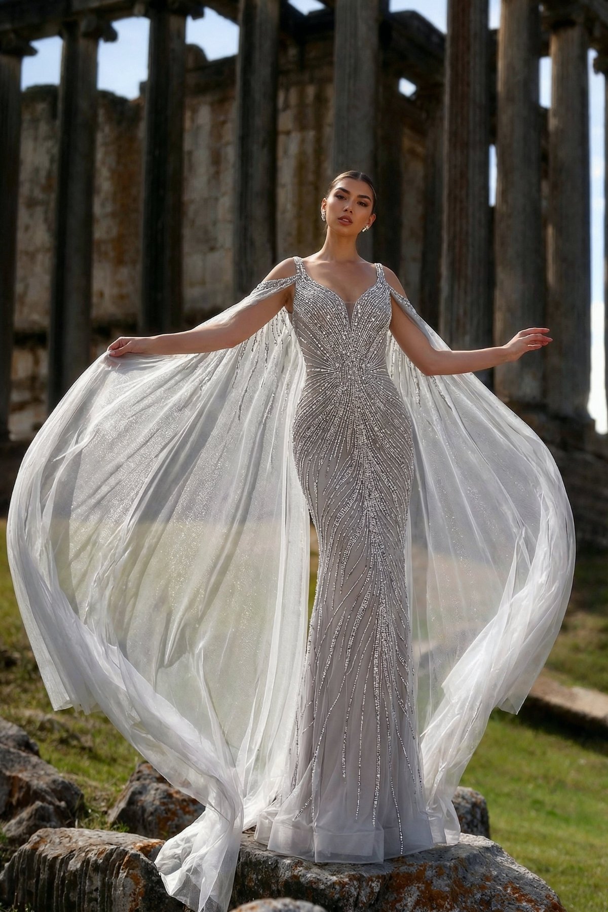 Gri Sivri Yaka Pelerin Kollu Taşlı İthal Büyük Beden Abiye Elbise 34