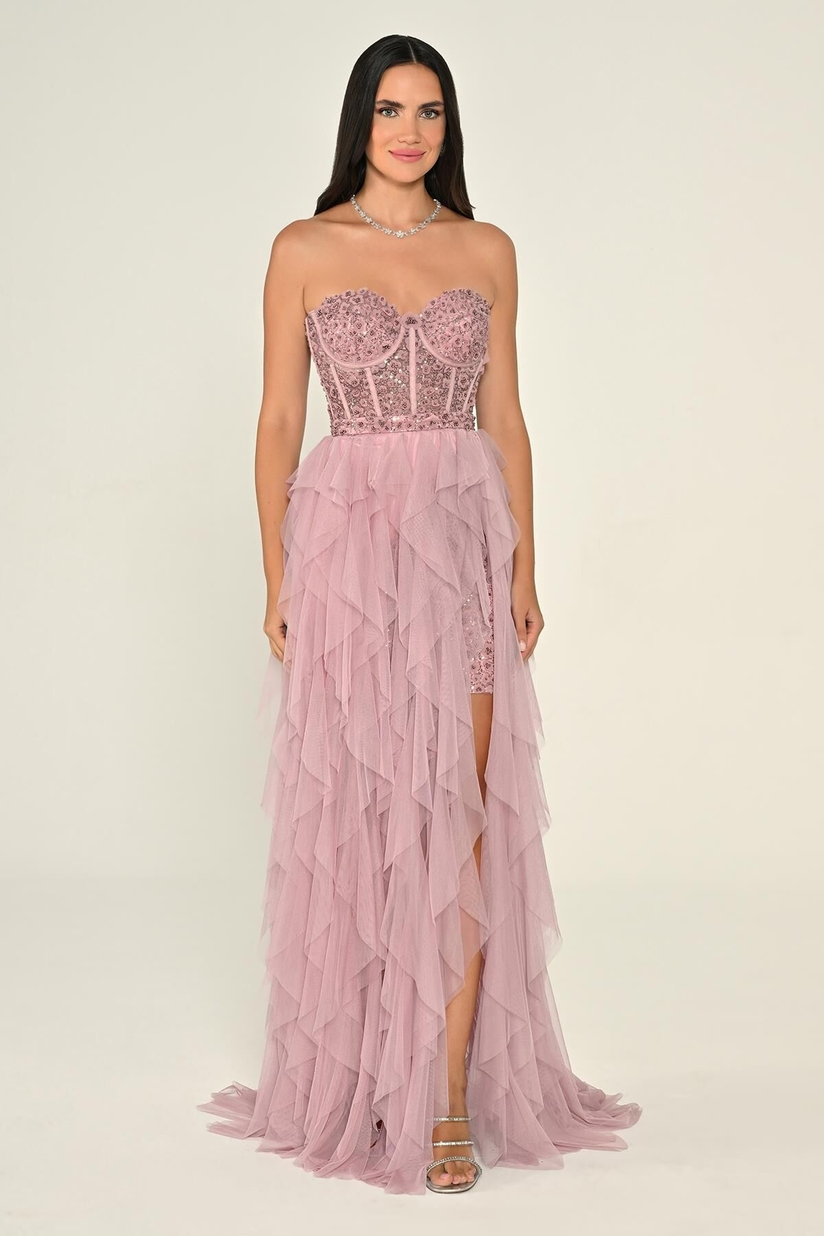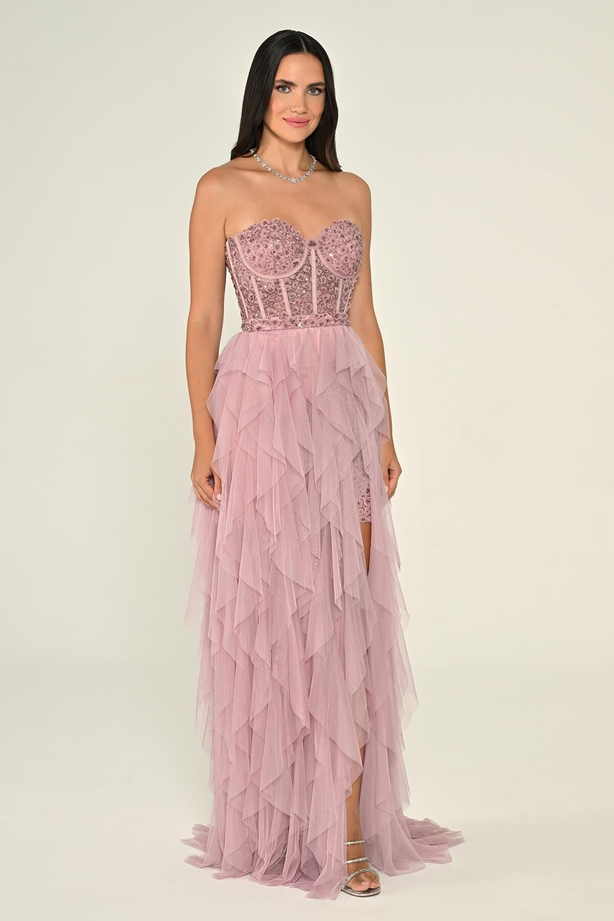 Gül Kurusu Straplez İşlemeli Büstiyerli Fırfırlı Tül Abiye Elbise 56