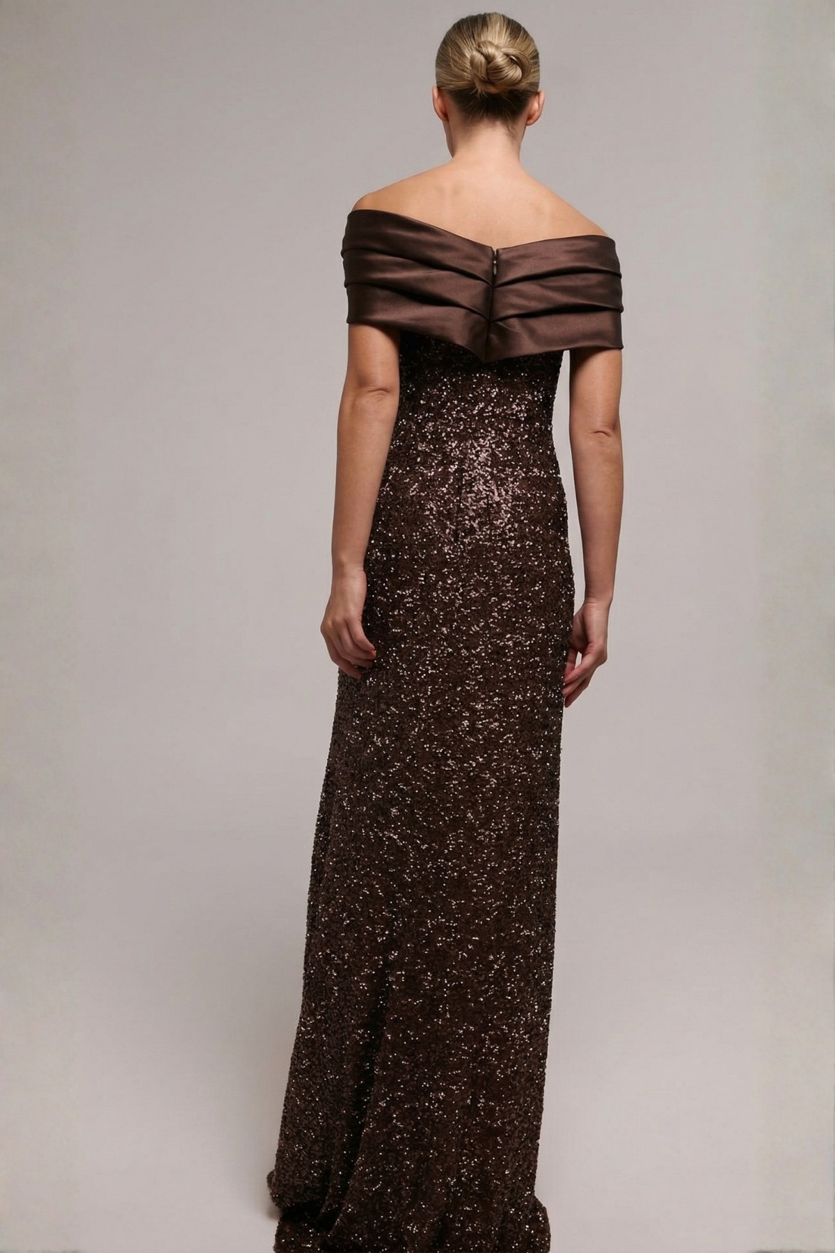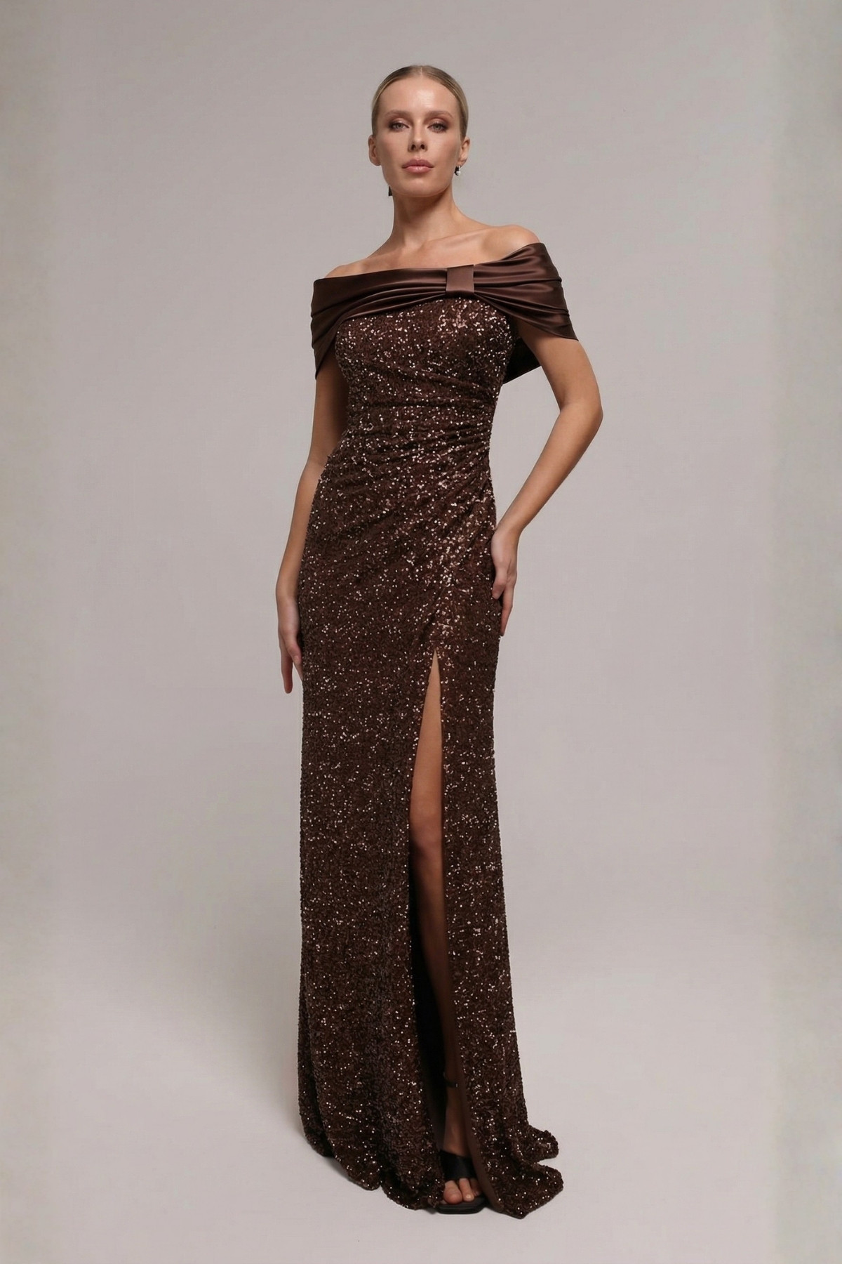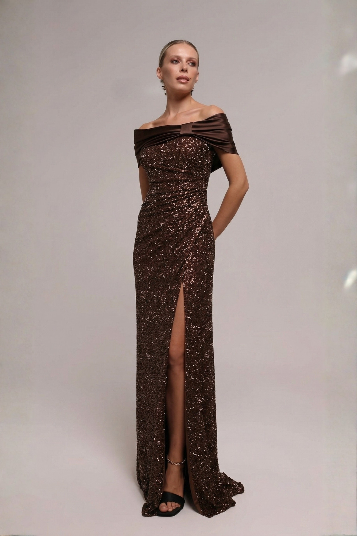 Kahve Saten Fiyonk Yakalı Drapeli Yırtmaçlı Simli Büyük Beden Abiye 95