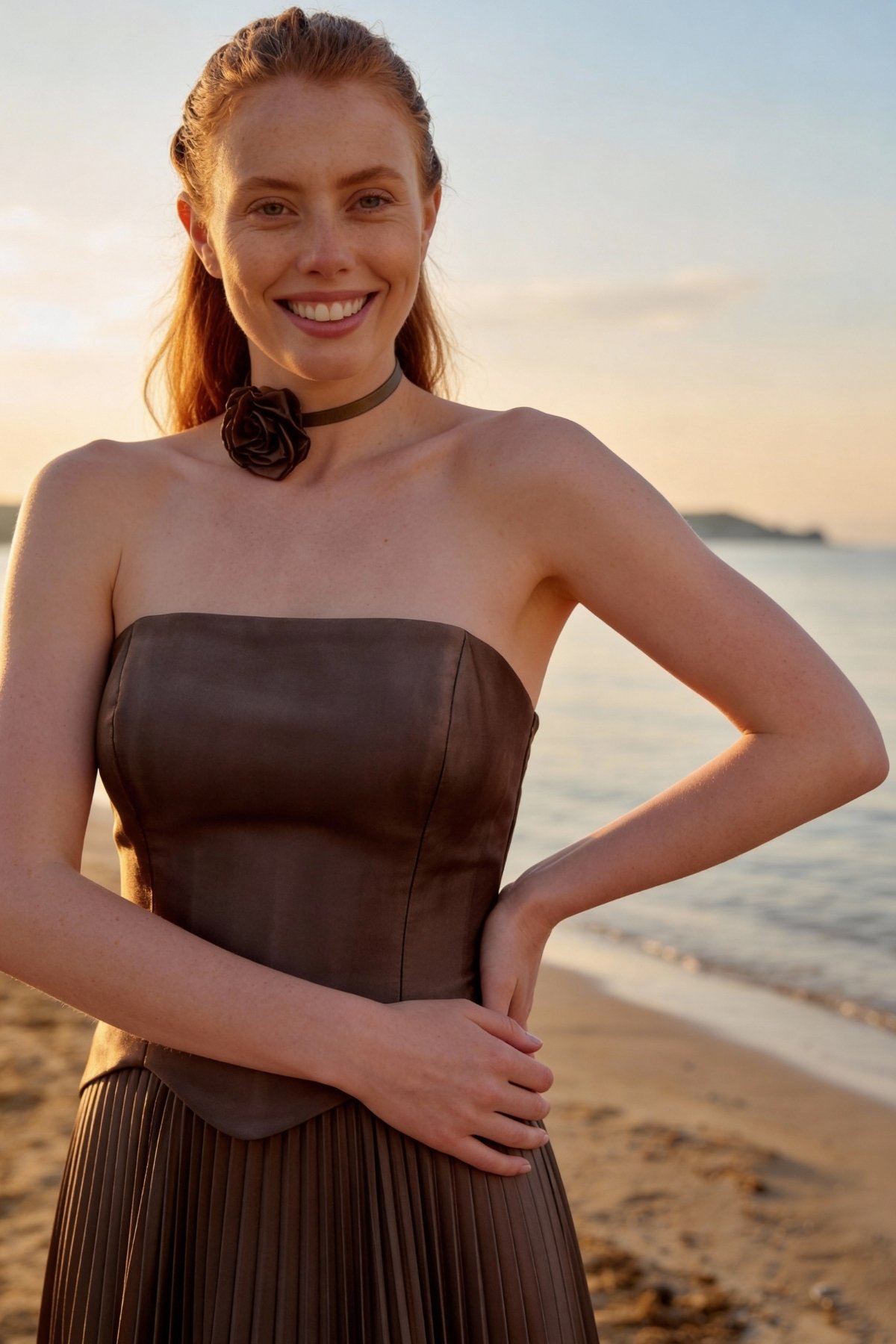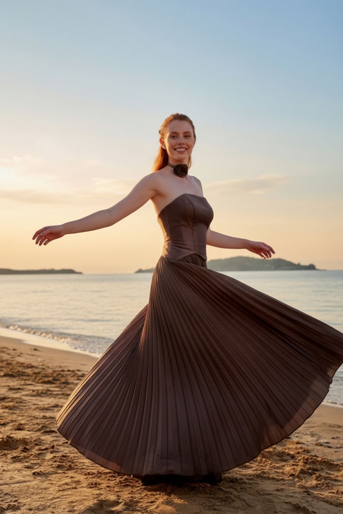 Kahve Straplez Eteği Plise Biritli Abiye Elbise 70