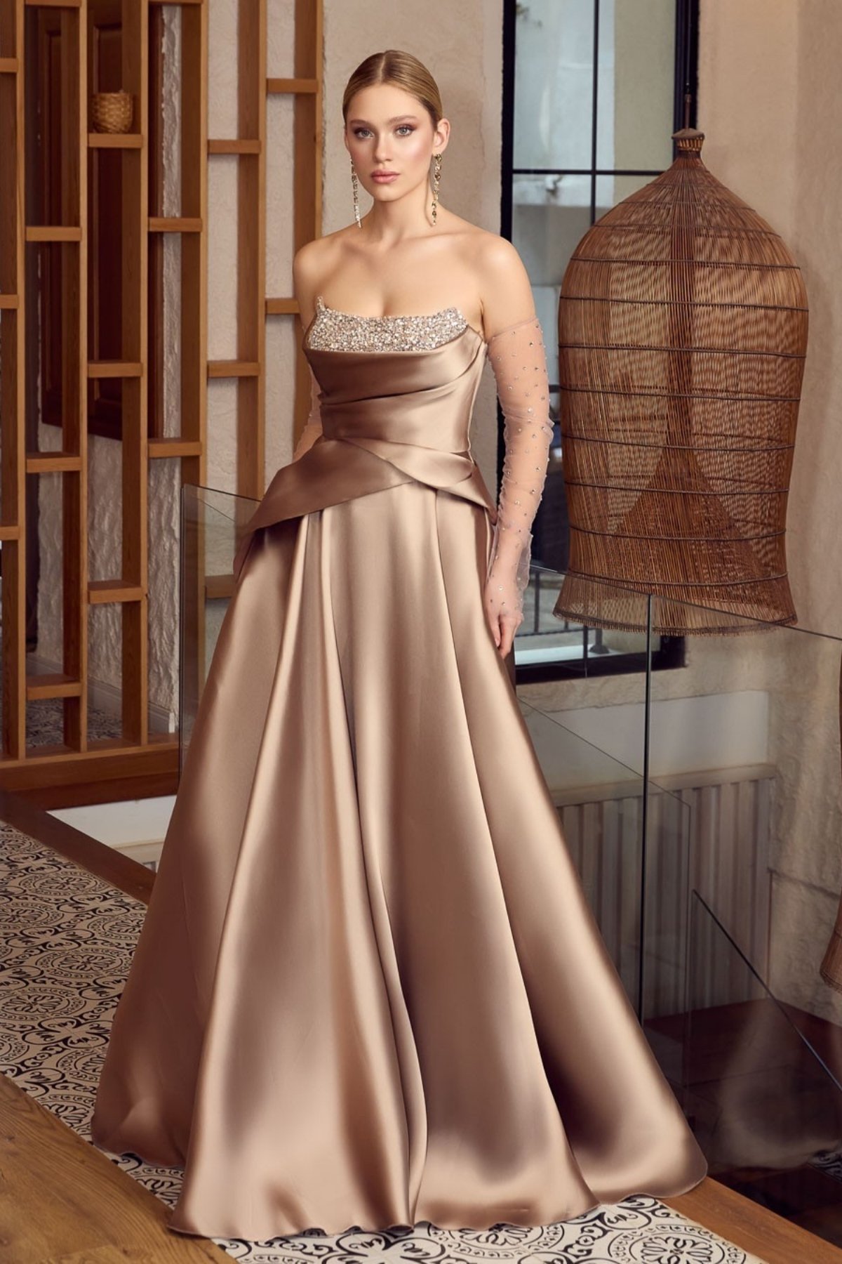 Kahve Straplez Göğsü Taşlı Eldivenli Kloş Abiye Elbise 34