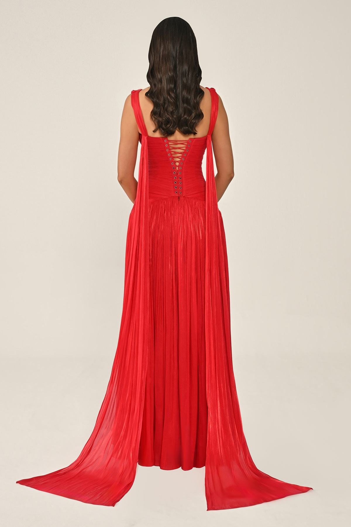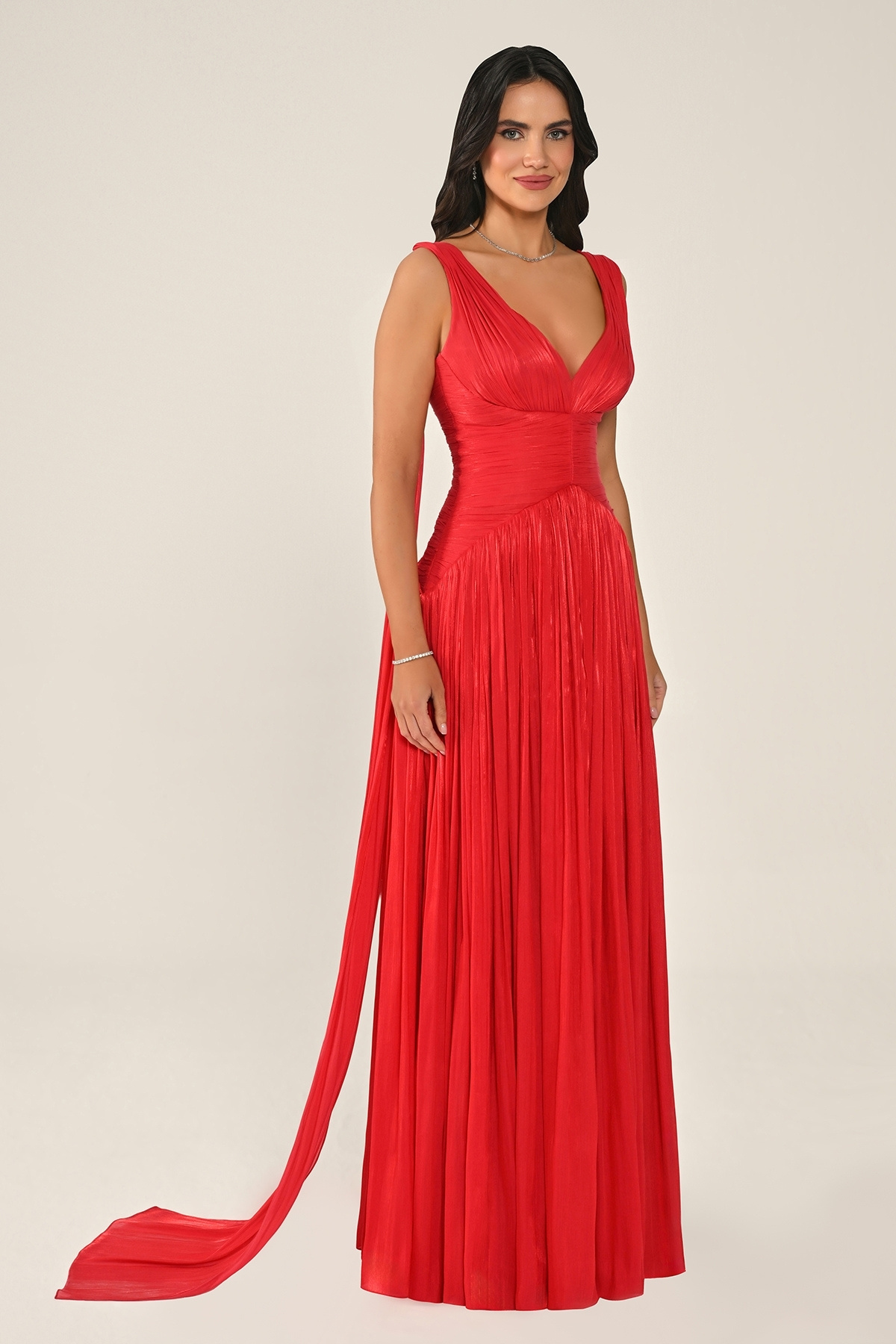 Kırmızı Kalın Askı Drapeli Şifon Abiye Elbise 46