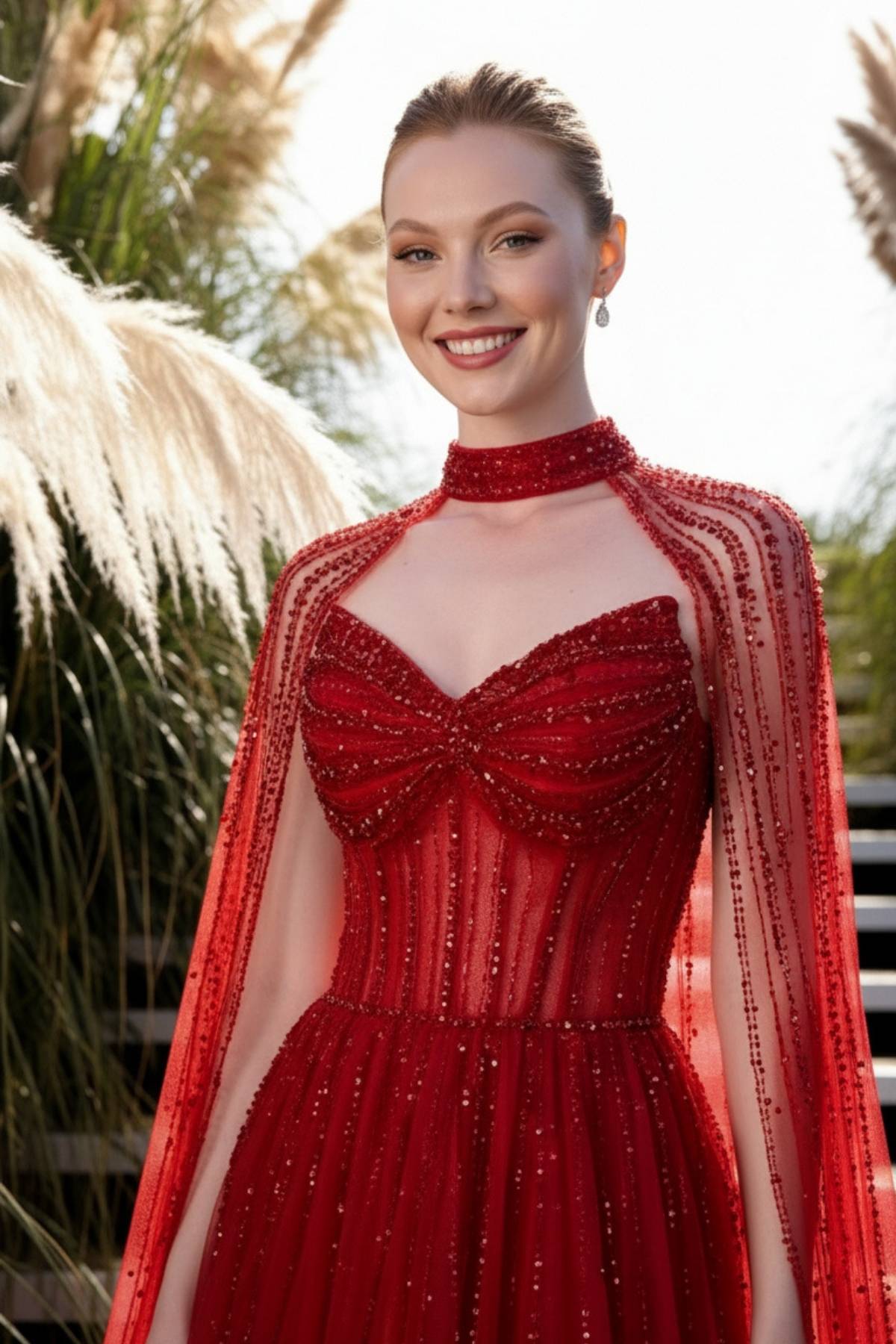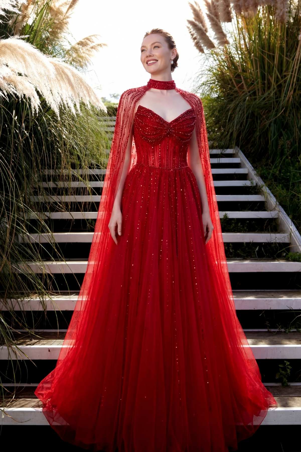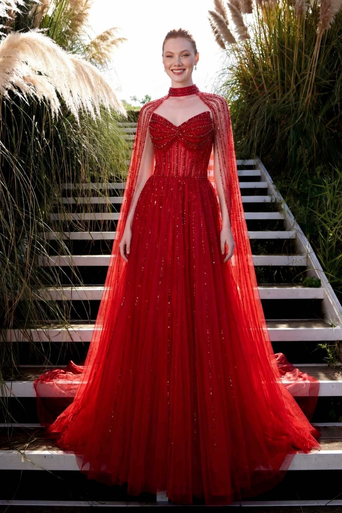 Kırmızı Sivri Yaka Pelerinli Kloş Taşlı İthal Abiye Elbise 78