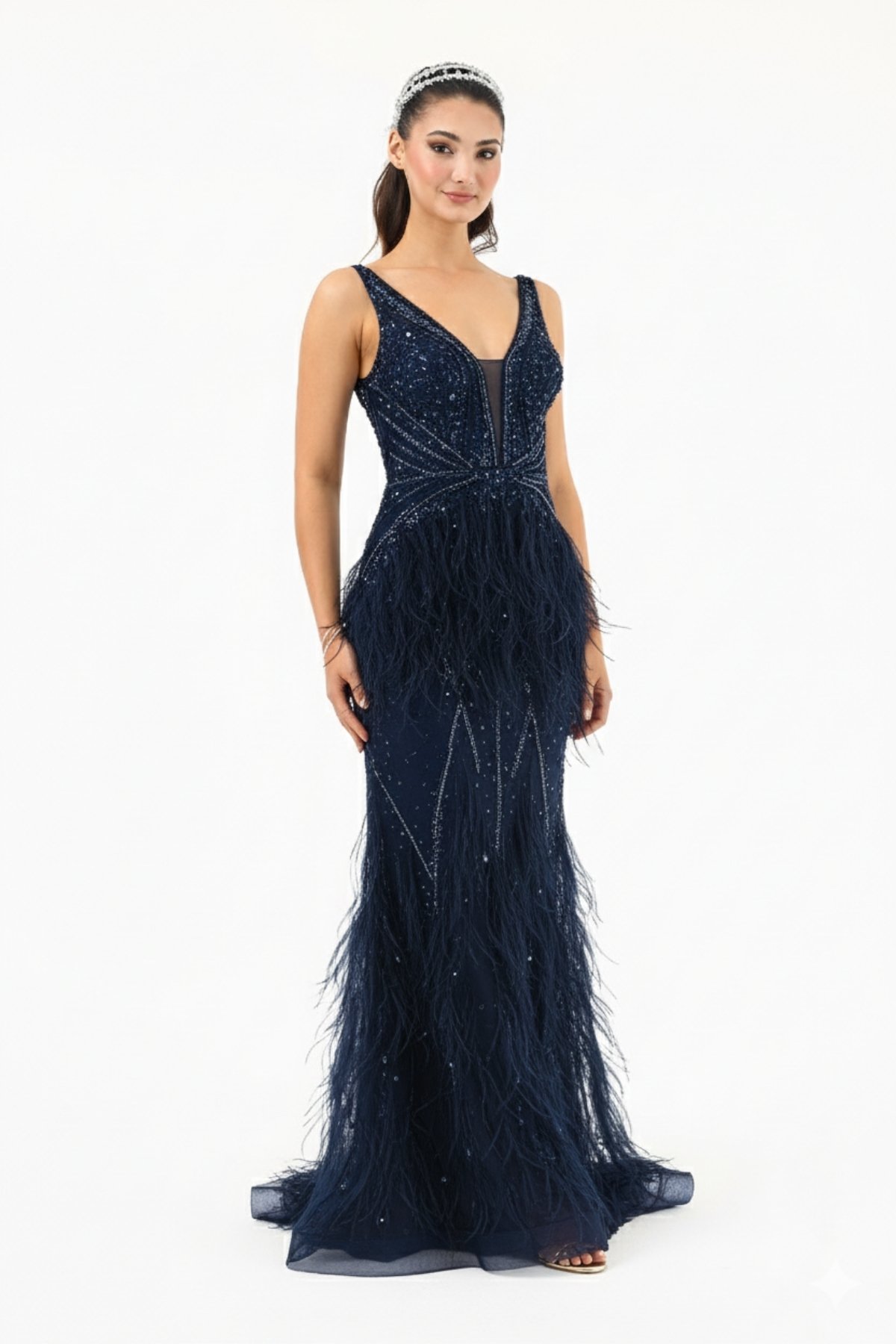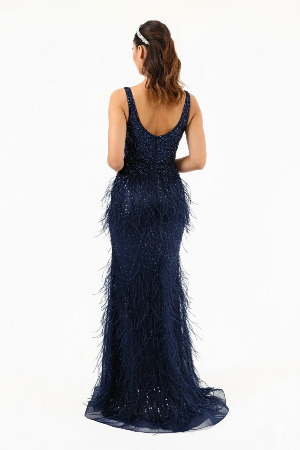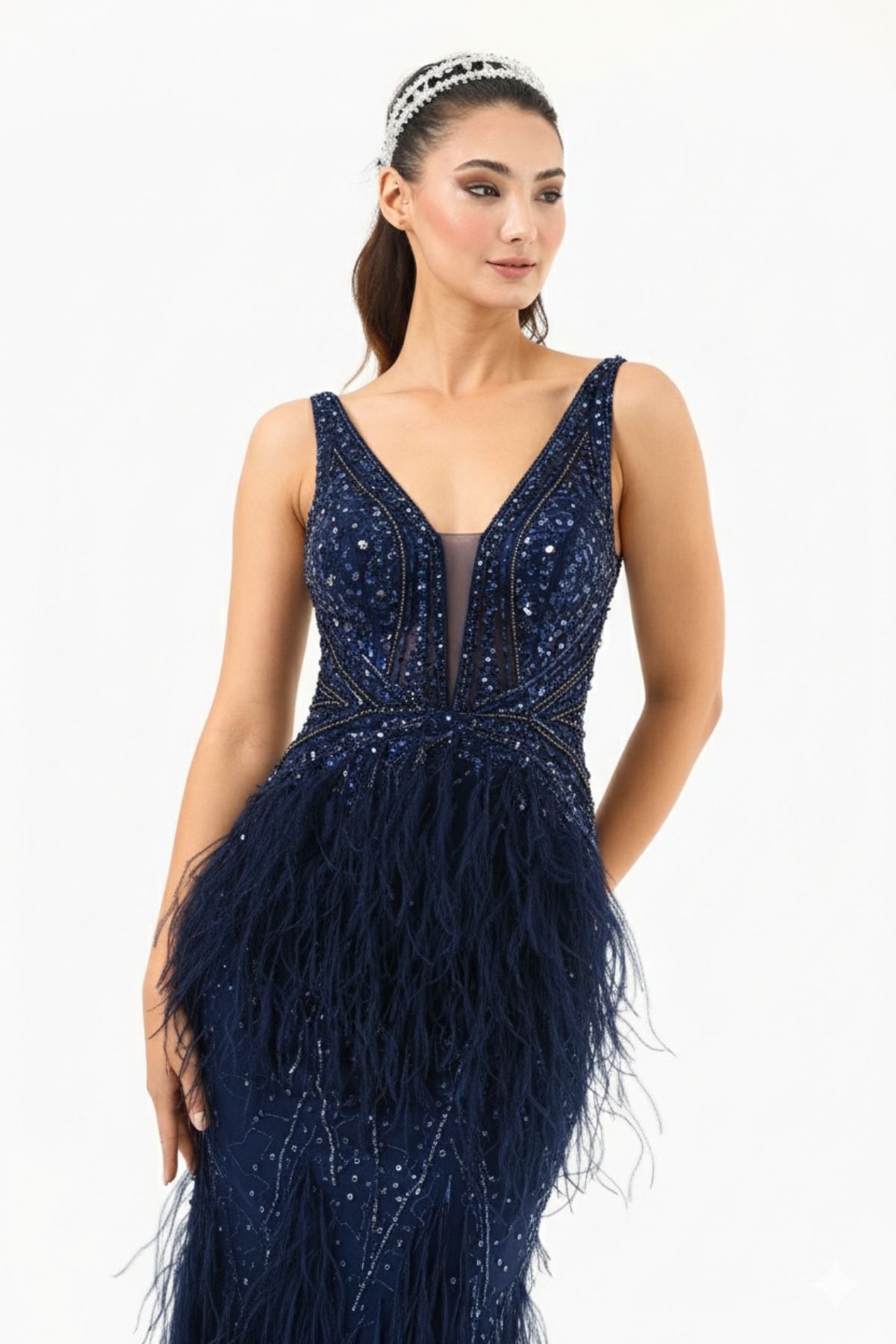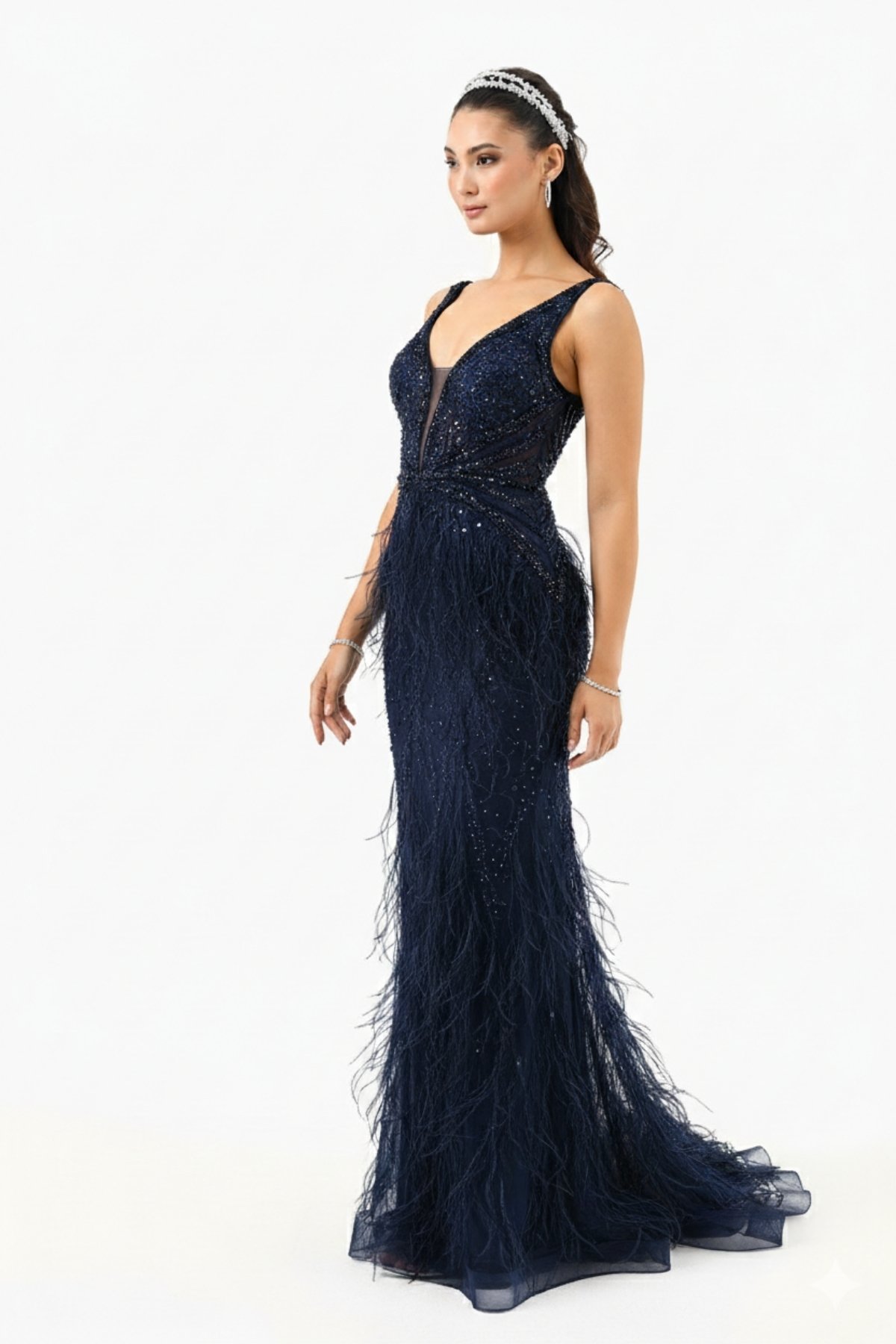 Lacivert Derin V Tüy Detaylı Taşlı İthal Abiye Elbise