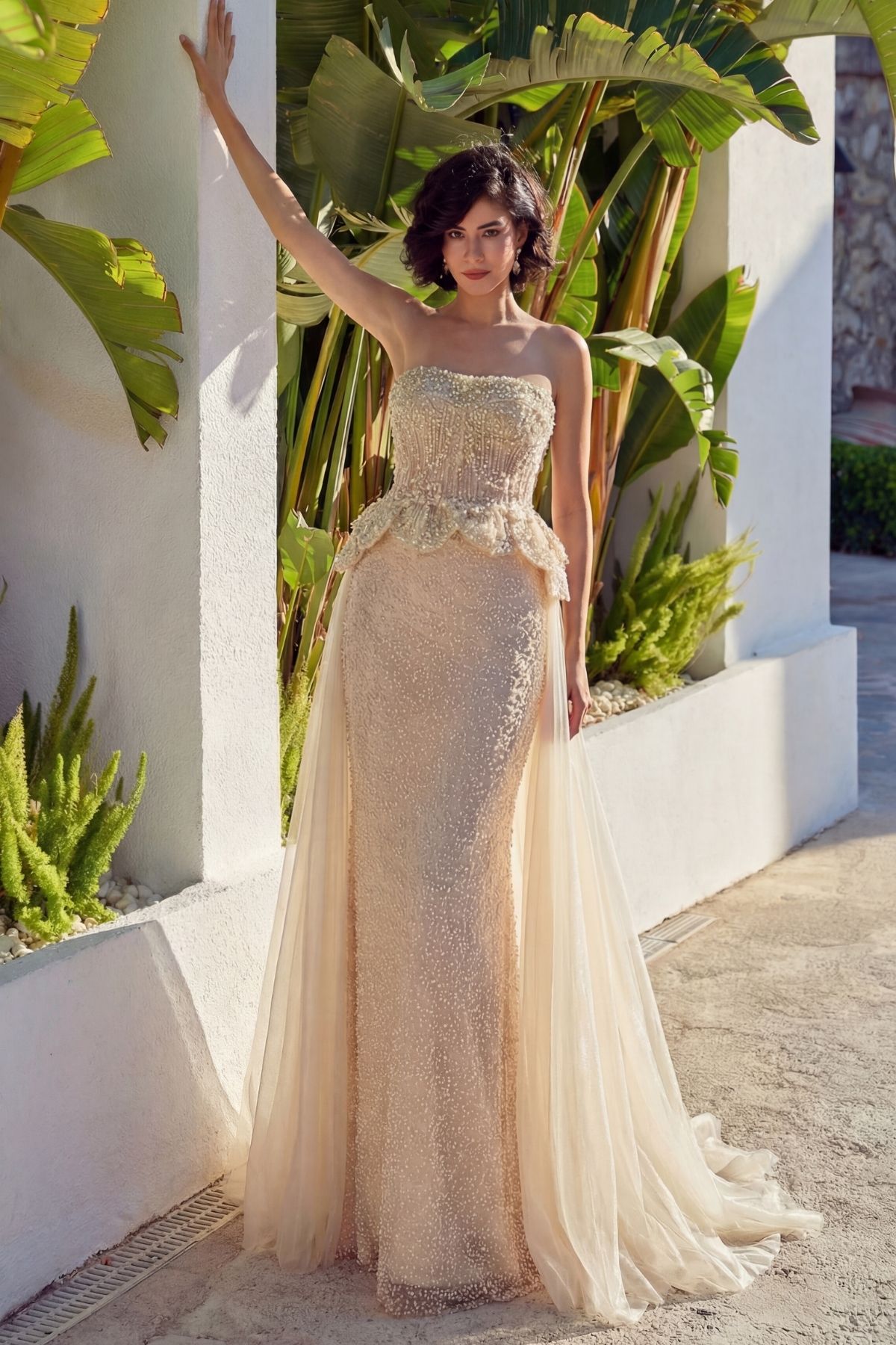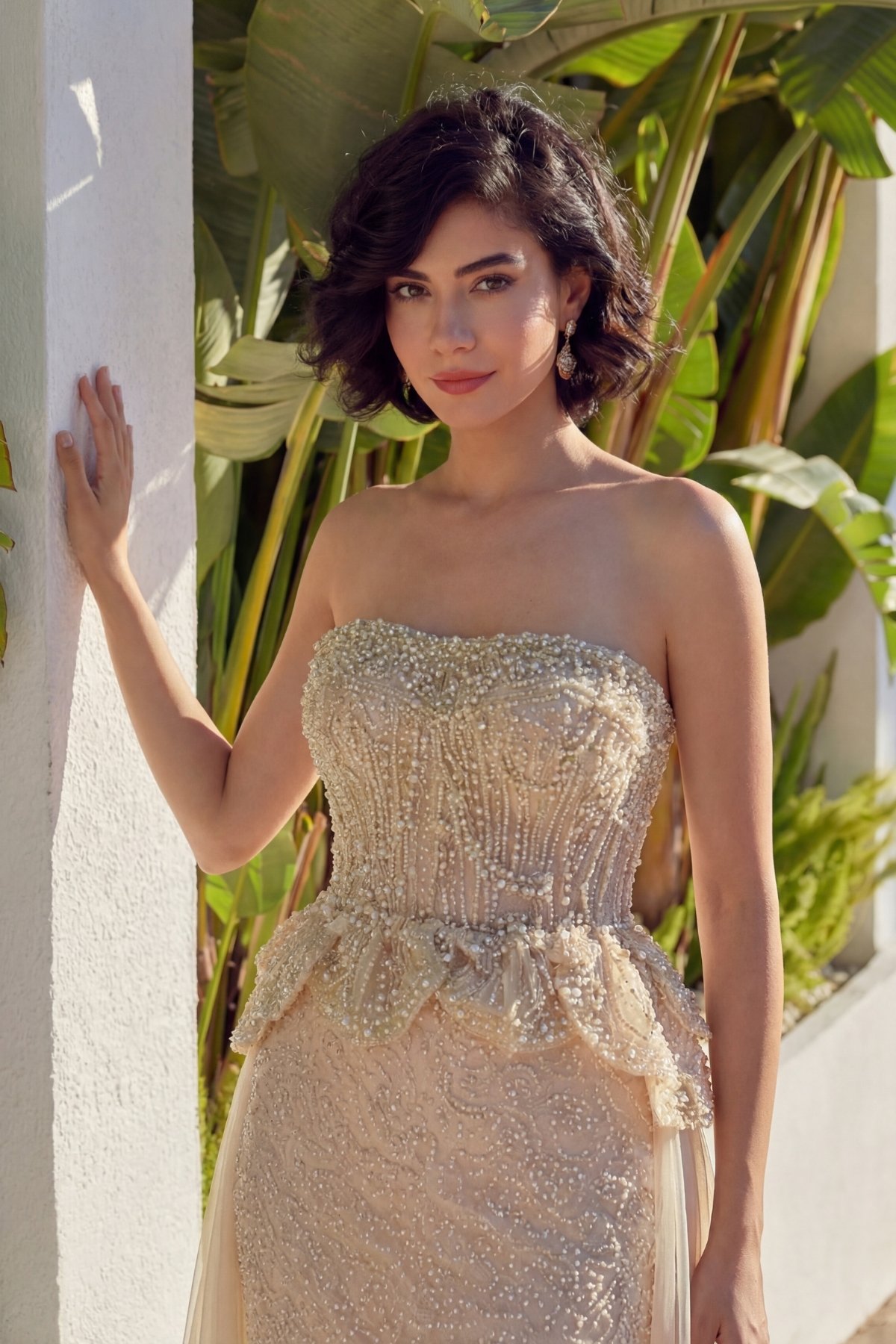 Latte Straplez Korsajlı Taş İşlemeli Balık Abiye Elbise 96