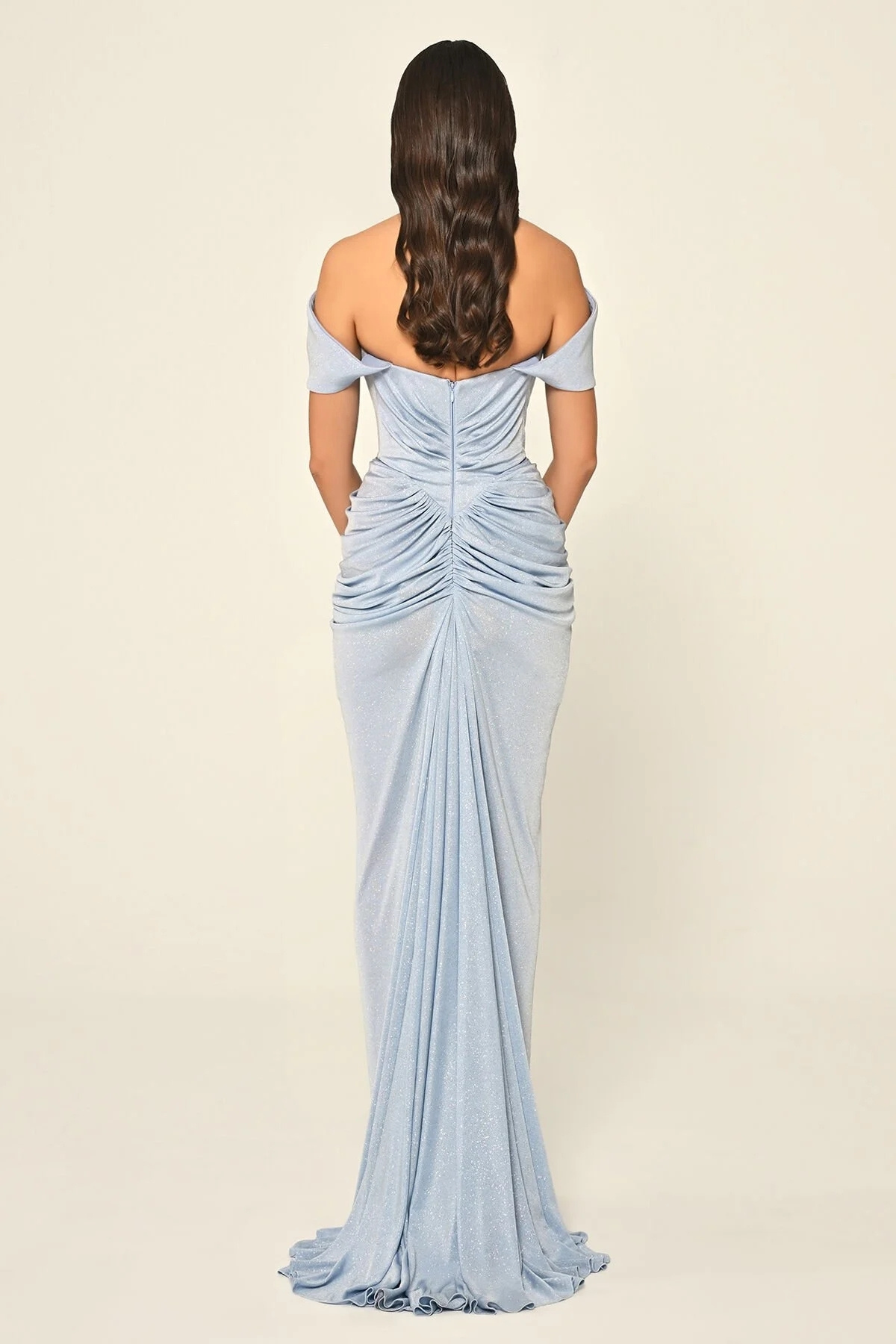 Mavi Düşük Kol Drapeli Şallı Parlak Kumaş Abiye Elbise 00