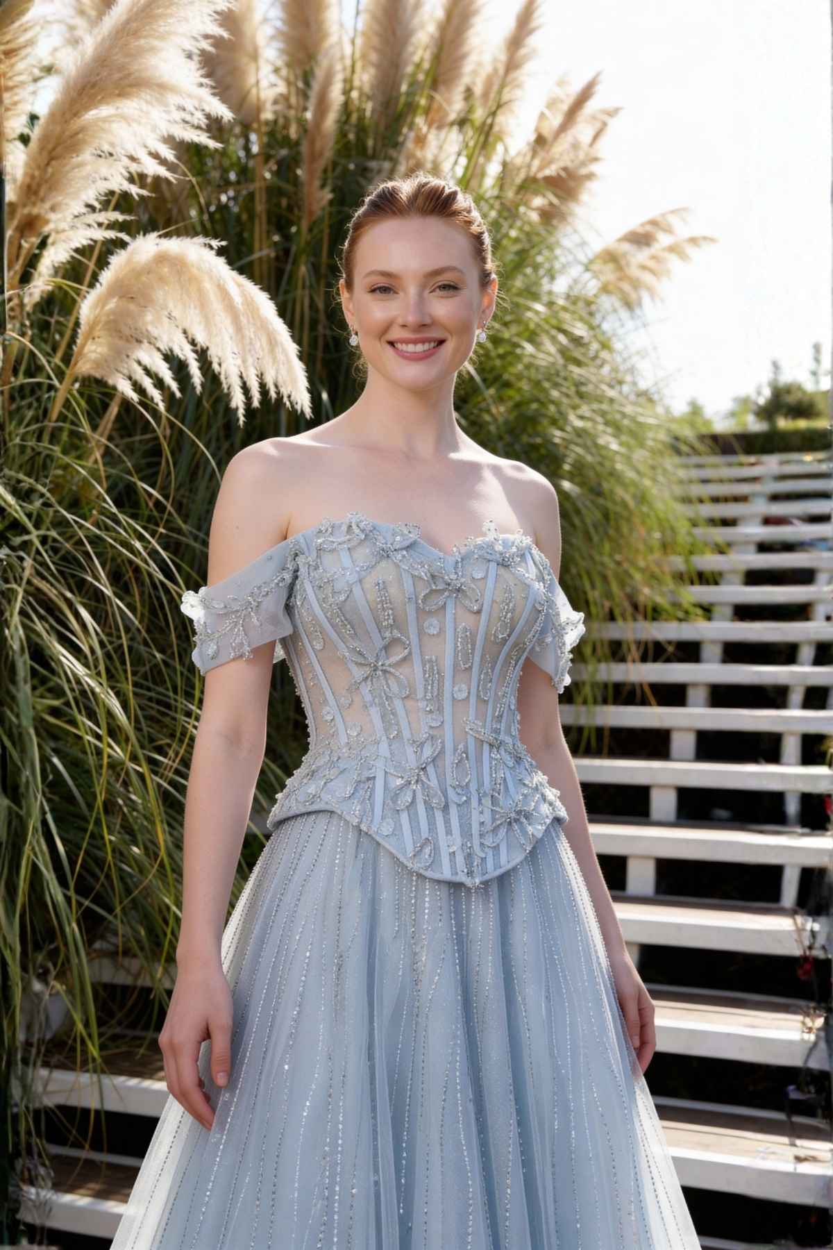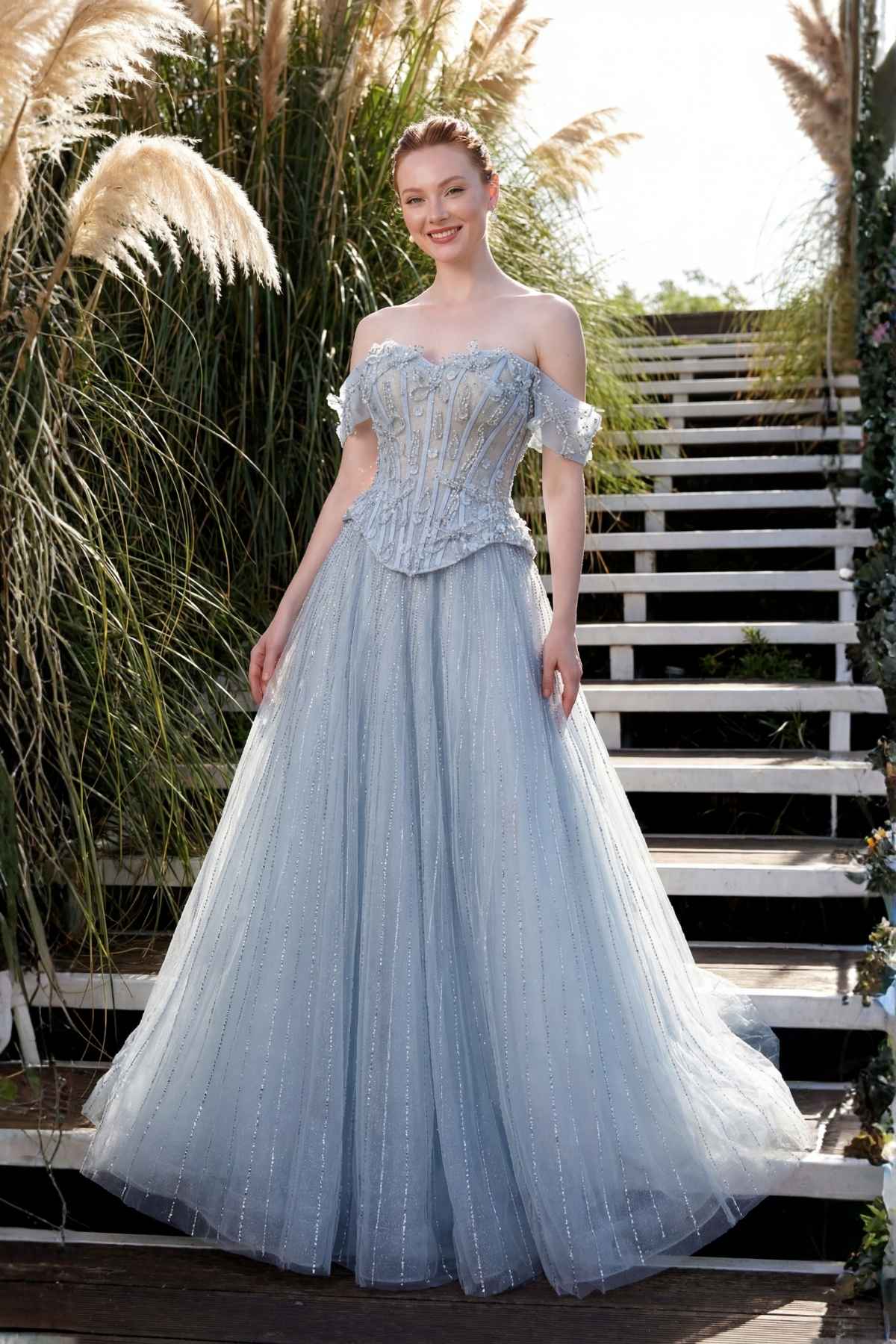 Mavi Düşük Kol Korsaşlı Kloş Taşlı İthal Abiye Elbise 24