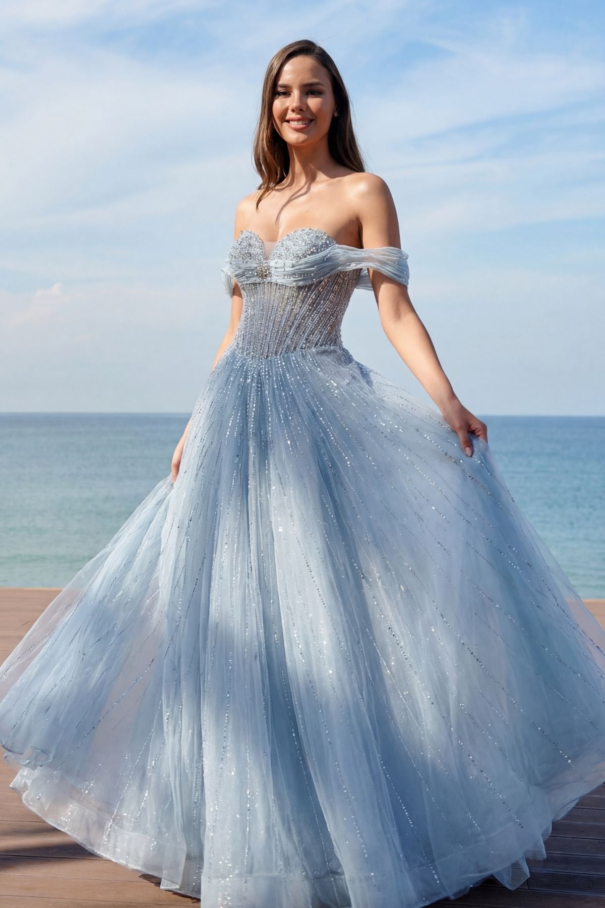 Mavi Öpücük Yaka Düşük Kol İthal Abiye Elbise 13
