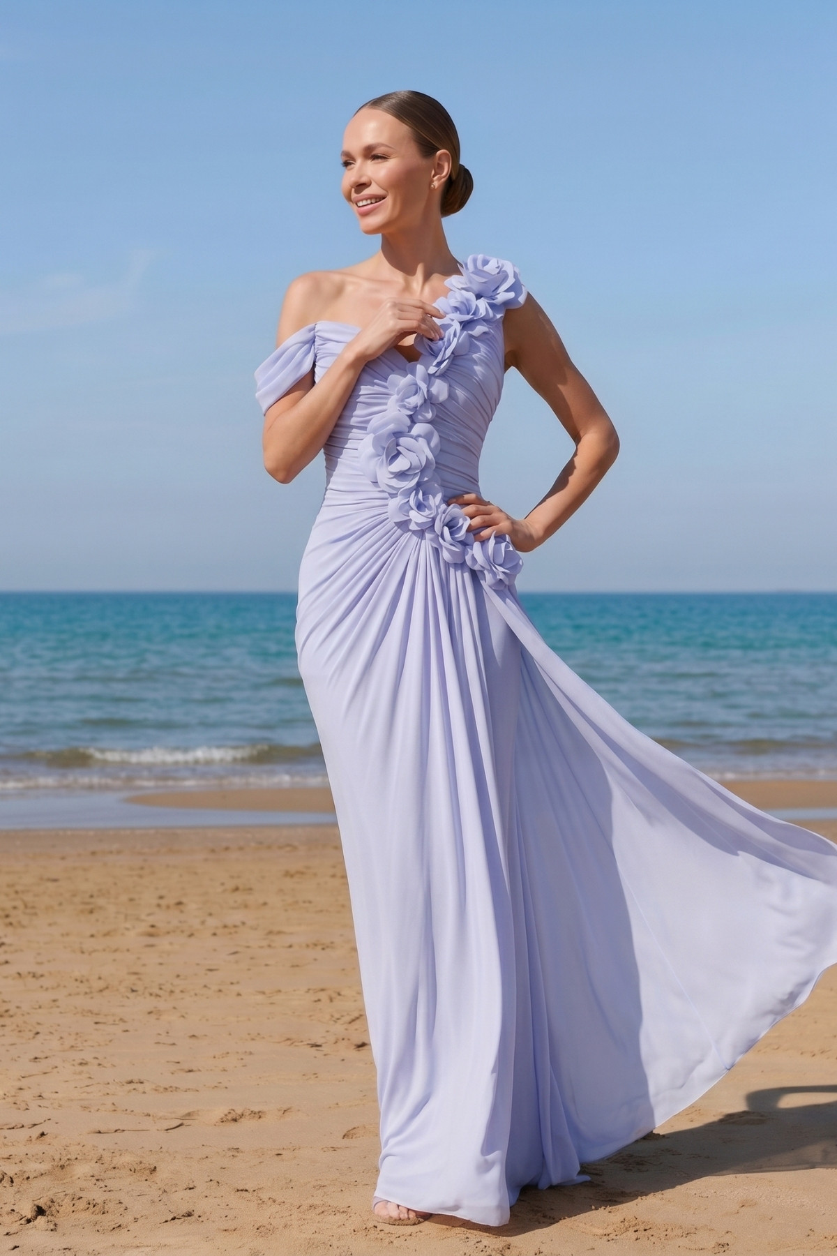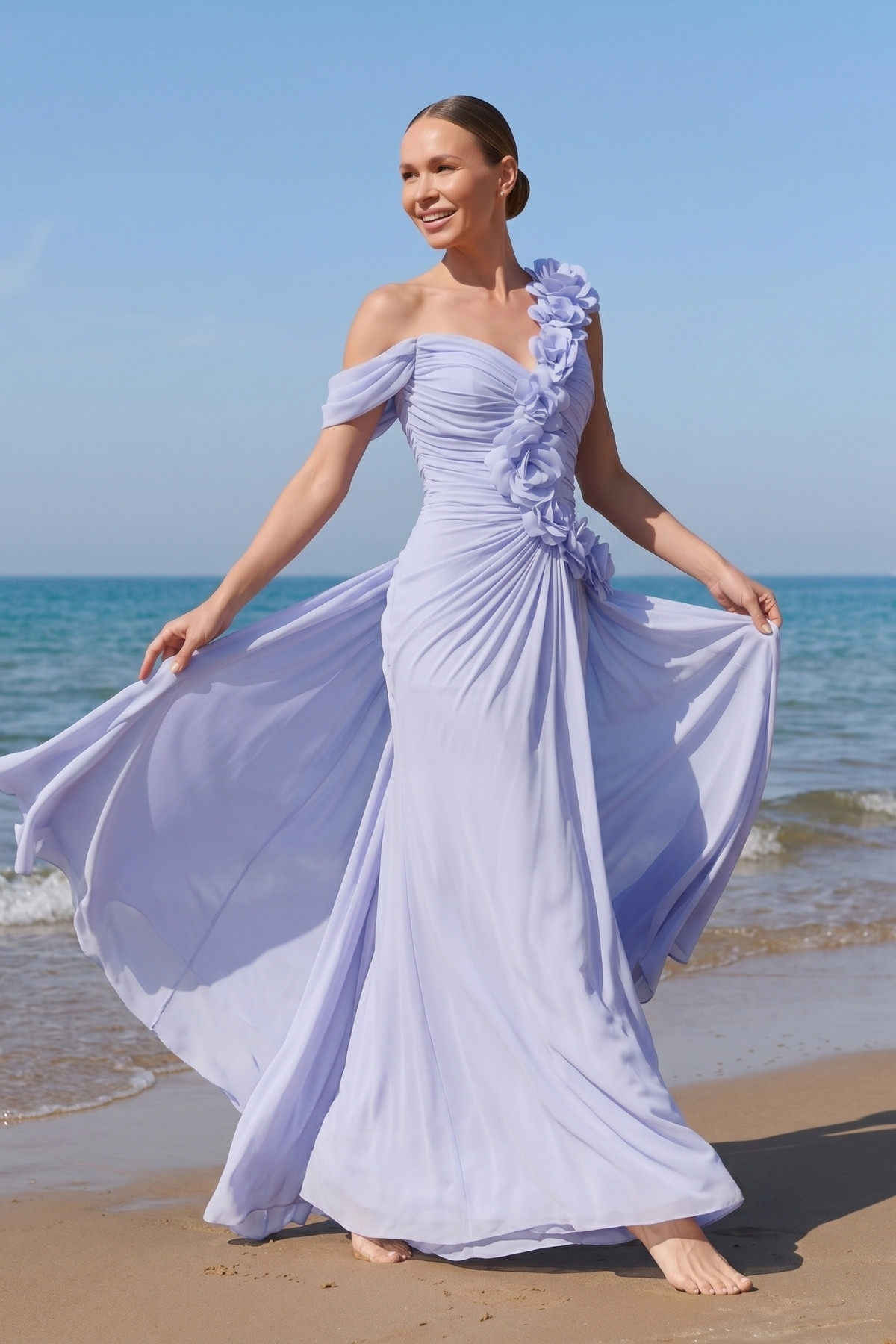 Mavi Tek Omuz Düşük Kol Drapeli Güllü Şifon Abiye Elbise 96