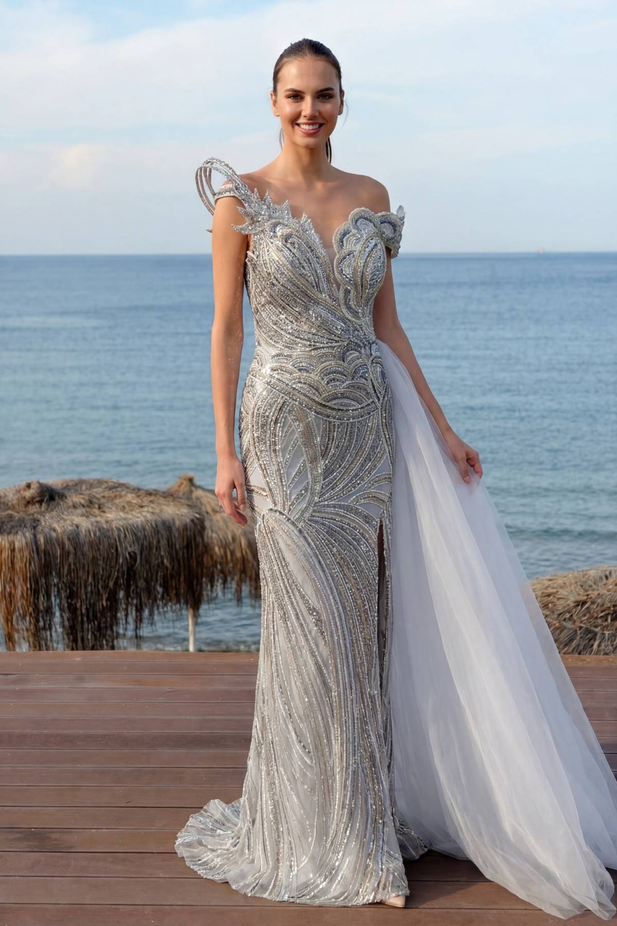Mavi Tek Omuz Düşük Kollu Yan Kuyruklu Yırtmaçlı Balık Abiye Elbise 04
