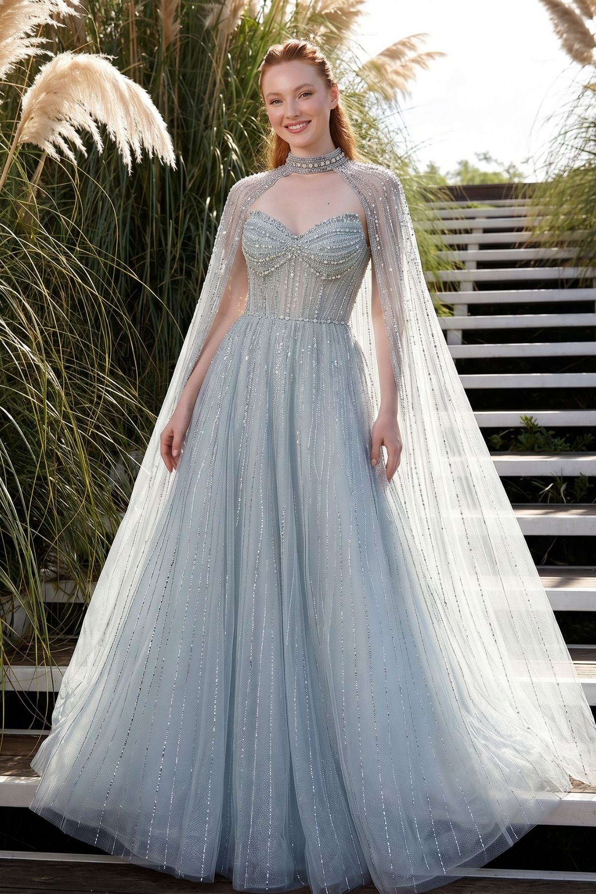 Mint Sivri Yaka Pelerinli Kloş Taşlı İthal Abiye Elbise 78