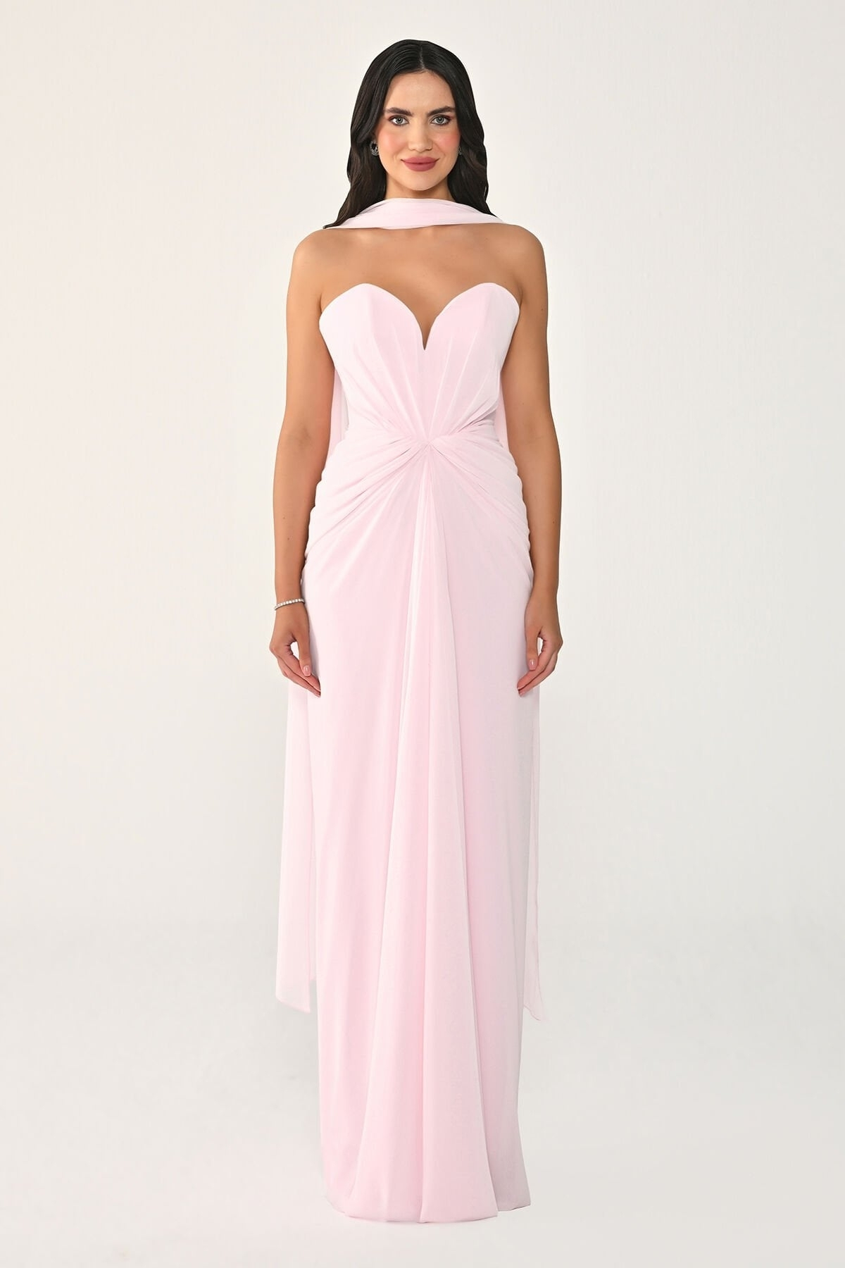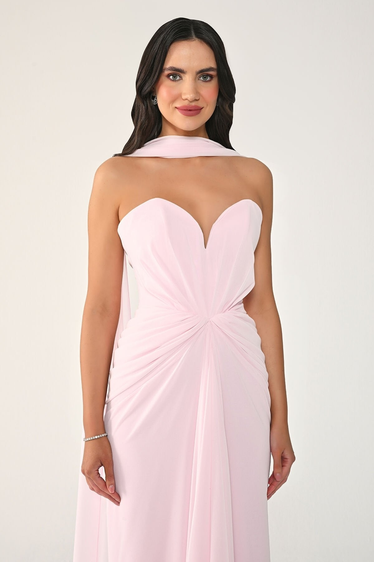 Pembe Kalp Yaka Drapeli Yırtmaçlı Şifon Abiye Elbise 07