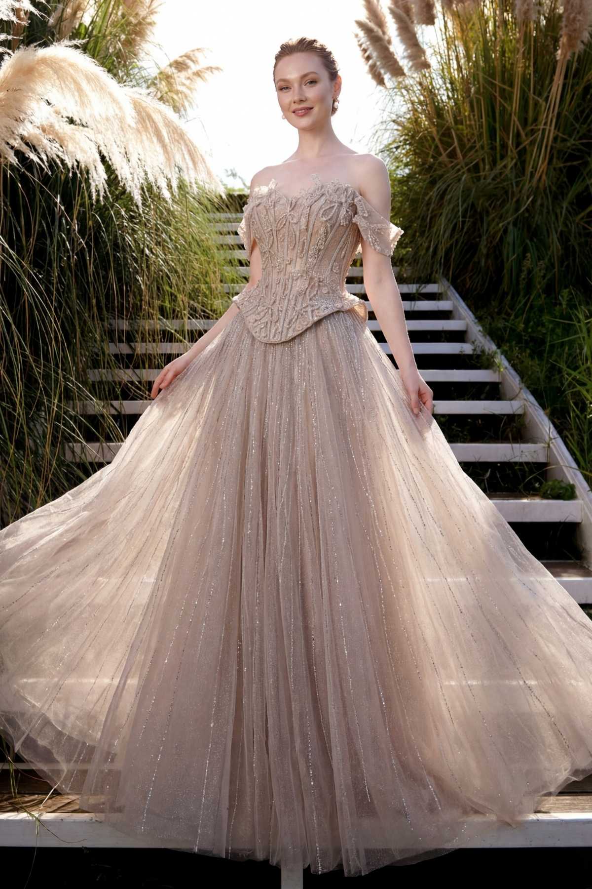 Pudra Düşük Kol Korsaşlı Kloş Taşlı İthal Abiye Elbise 24