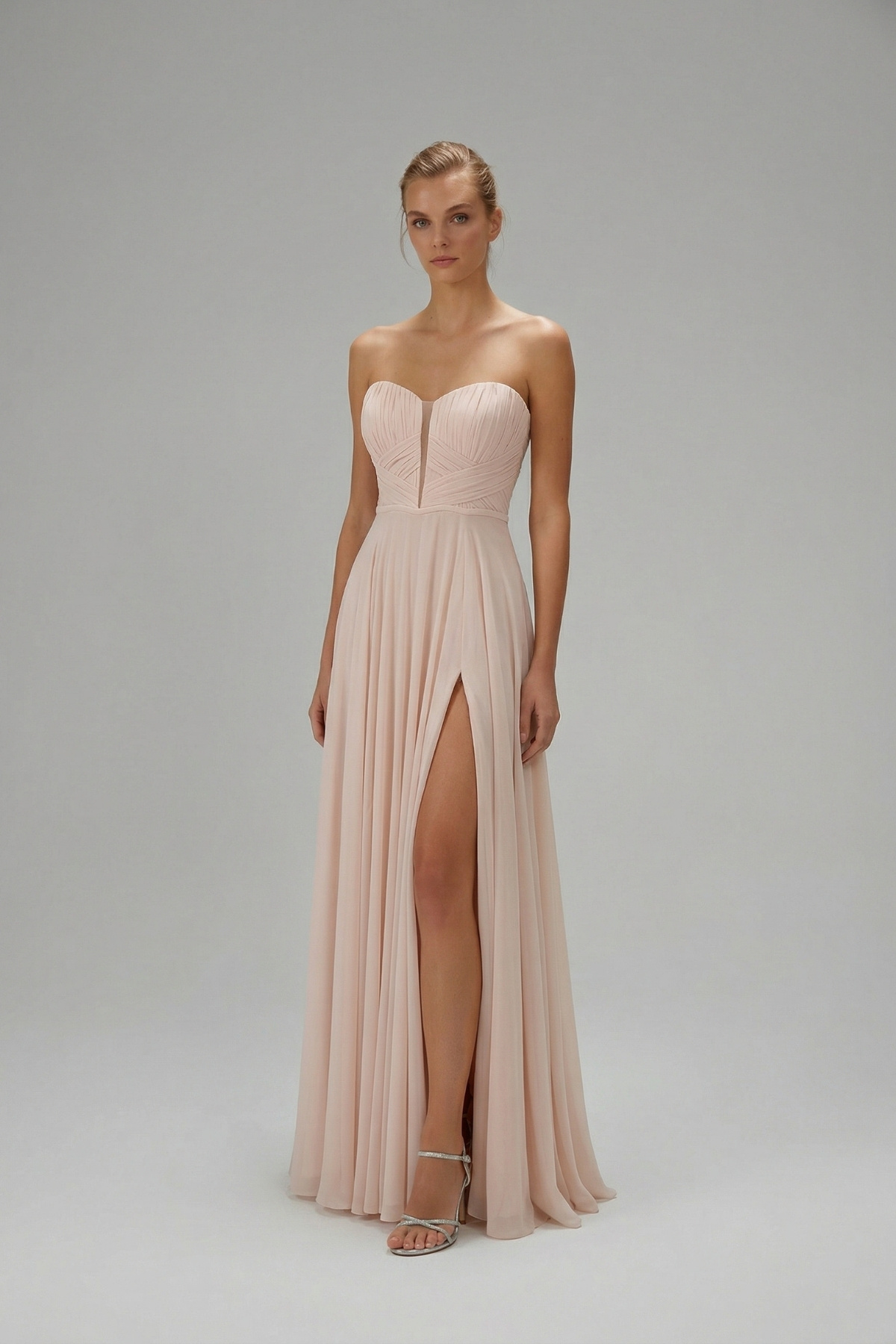 Pudra Straplez Göğüs Arası Dekolteli Tül Abiye Elbise 22