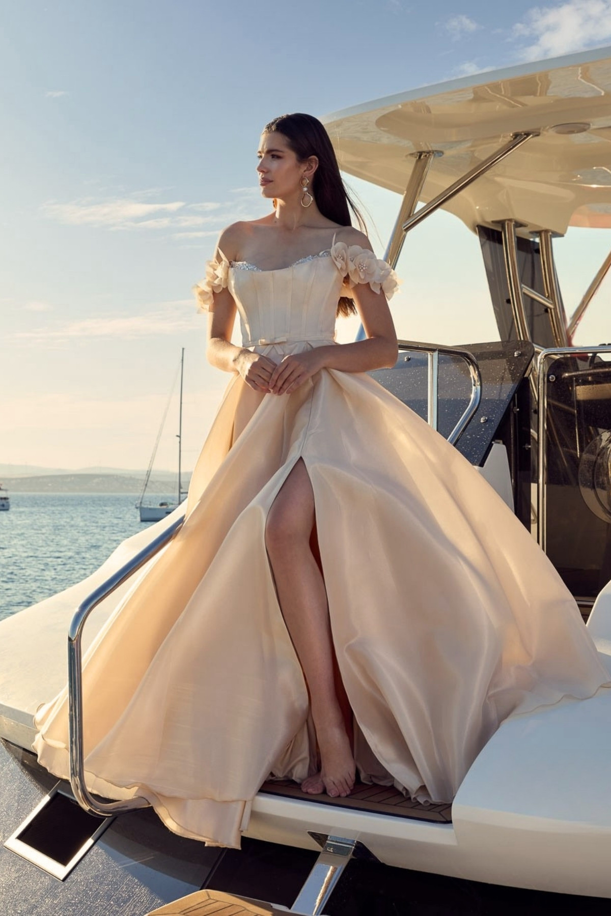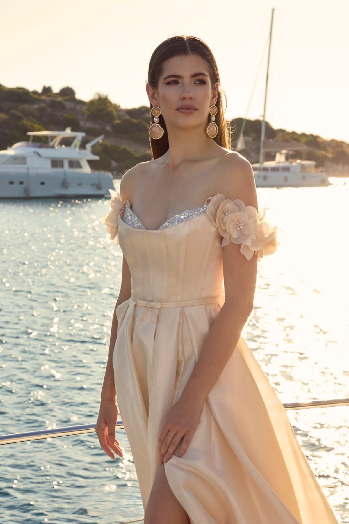 Şampanya Straplez Göğsü Taşlı Düşük Kol Kollar Çiçekli Abiye Elbise 71