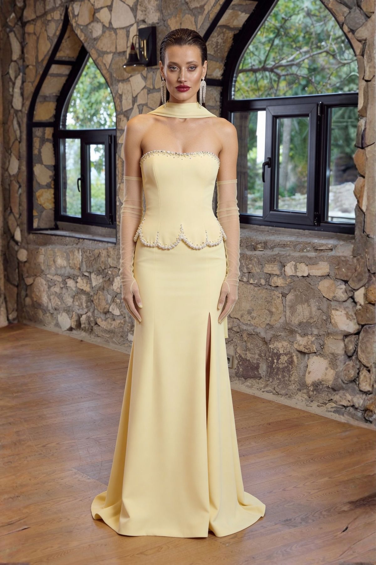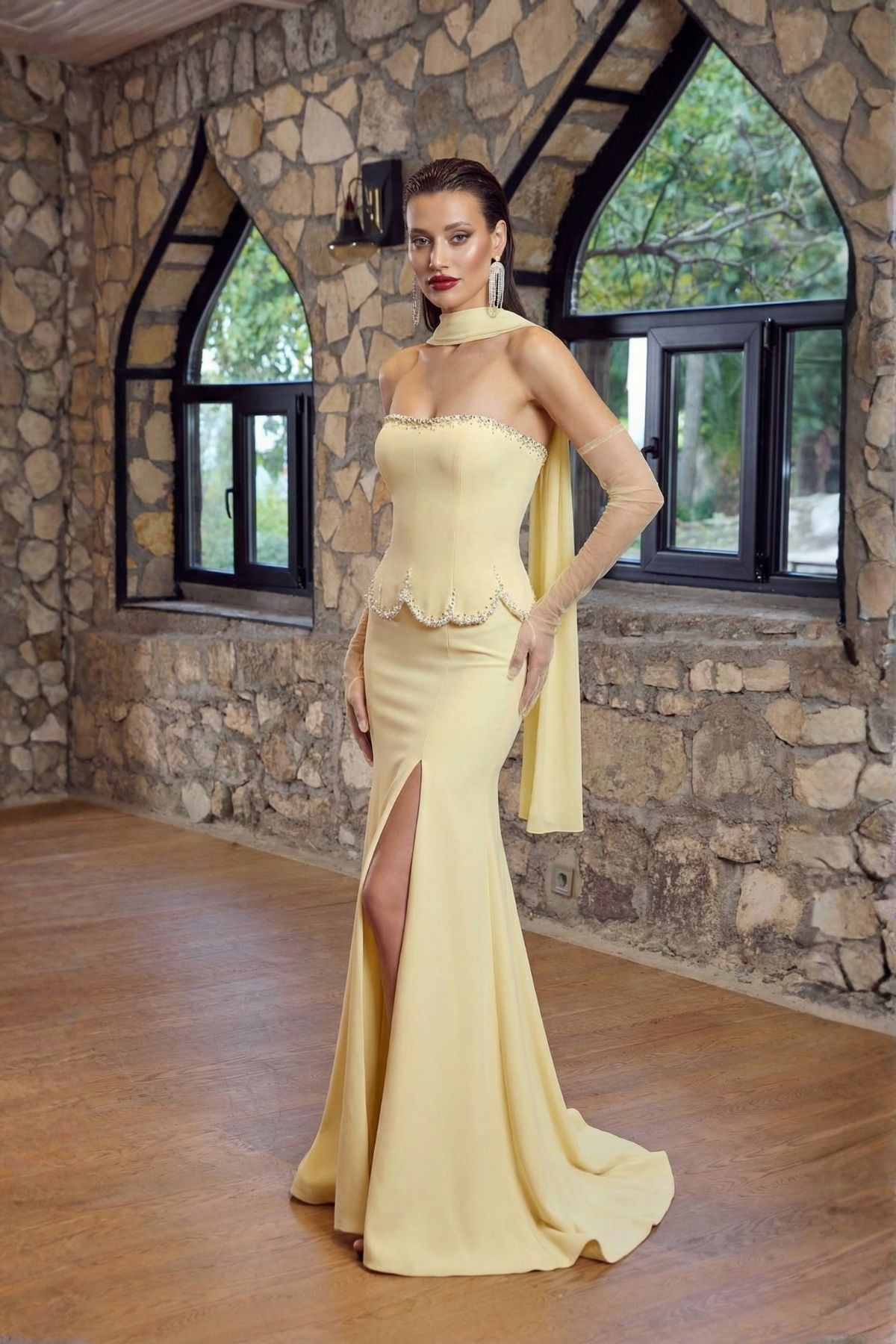 Sarı Straplez Göğsü Taşlı Birit ve Yırtmaçlı Abiye Elbise 31