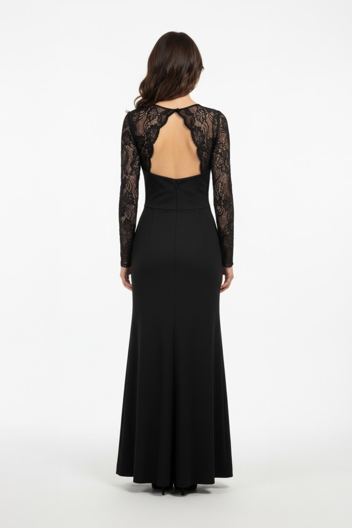 Siyah Balenli Uzun Kollu Yırtmaçlı Krep Abiye Elbise 04