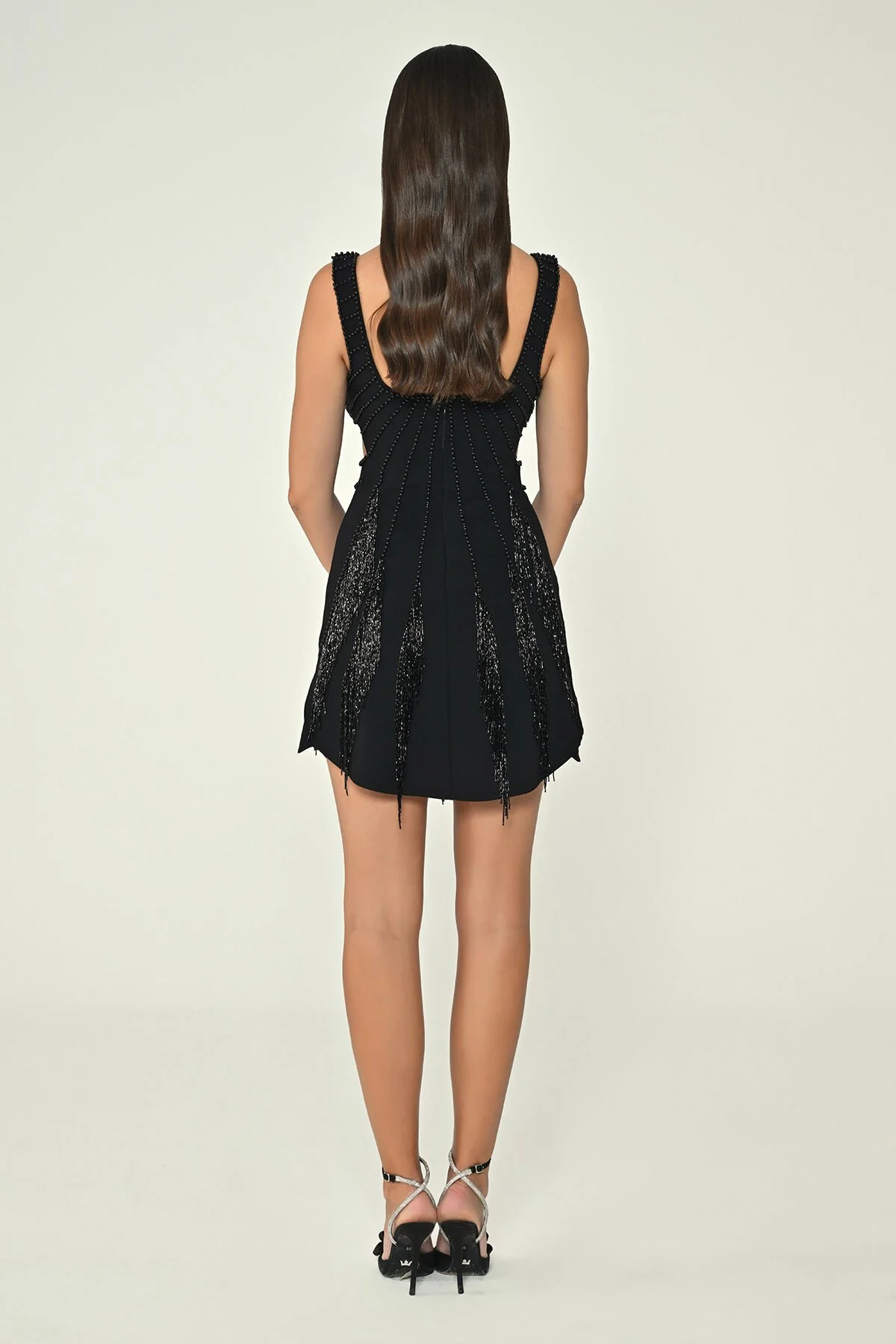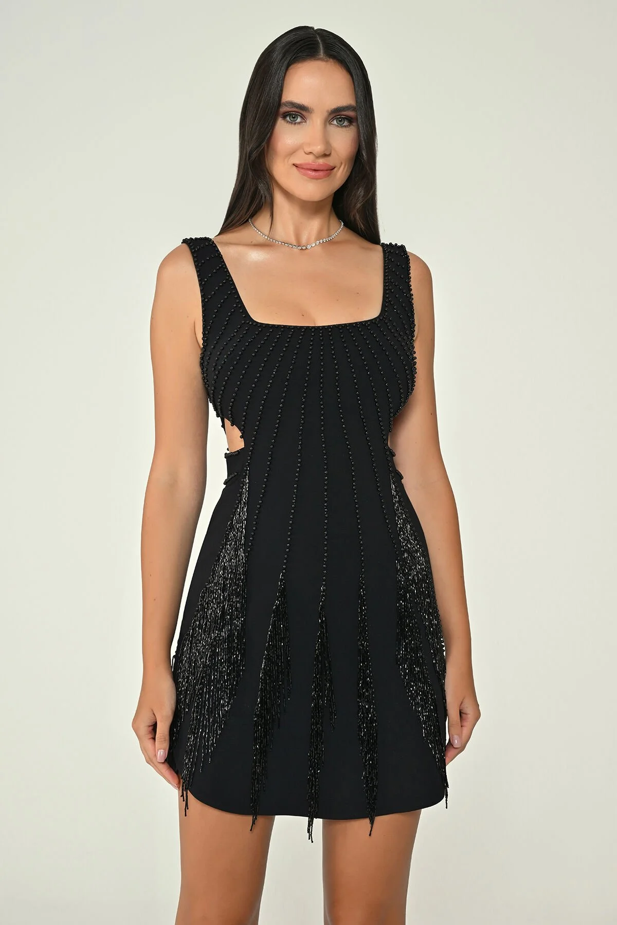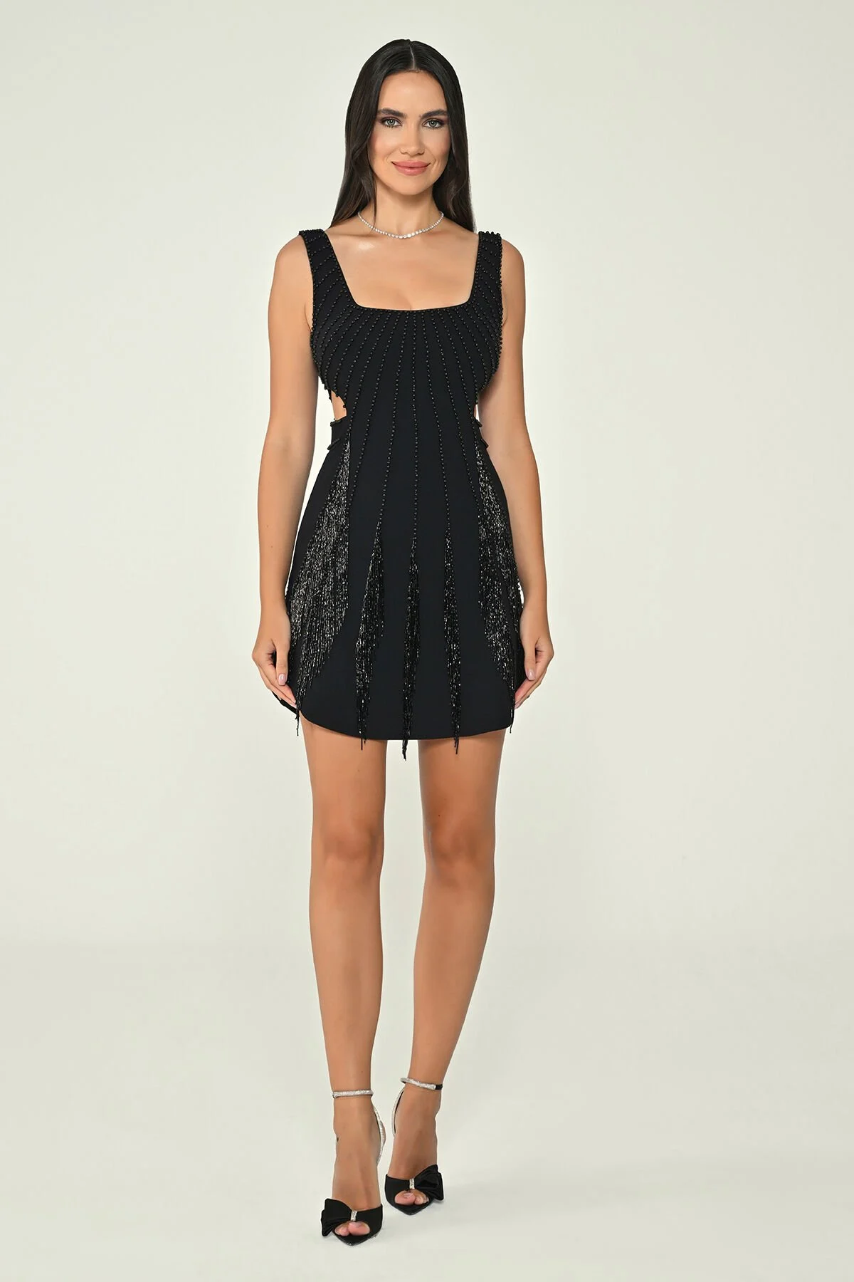 Siyah Bel Dekolteli Boncuk ve Sarkancalı Mini Abiye Elbise 88