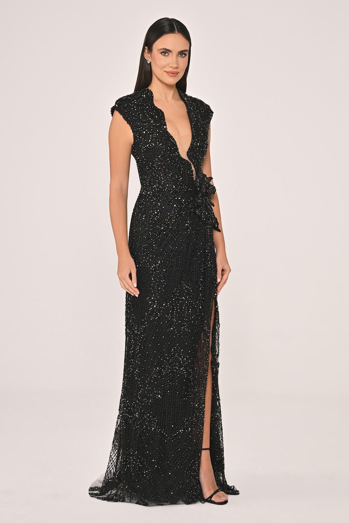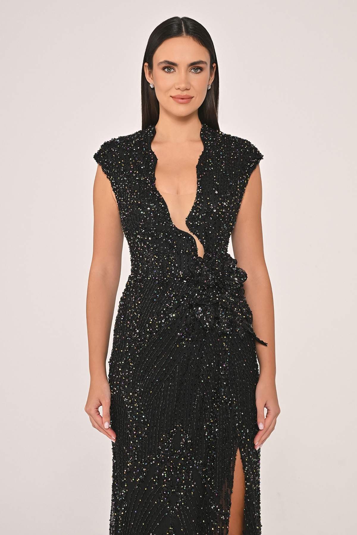 Siyah Dekolteli Çiçek Aksesuarlı Payet Uzun Abiye Elbise 19