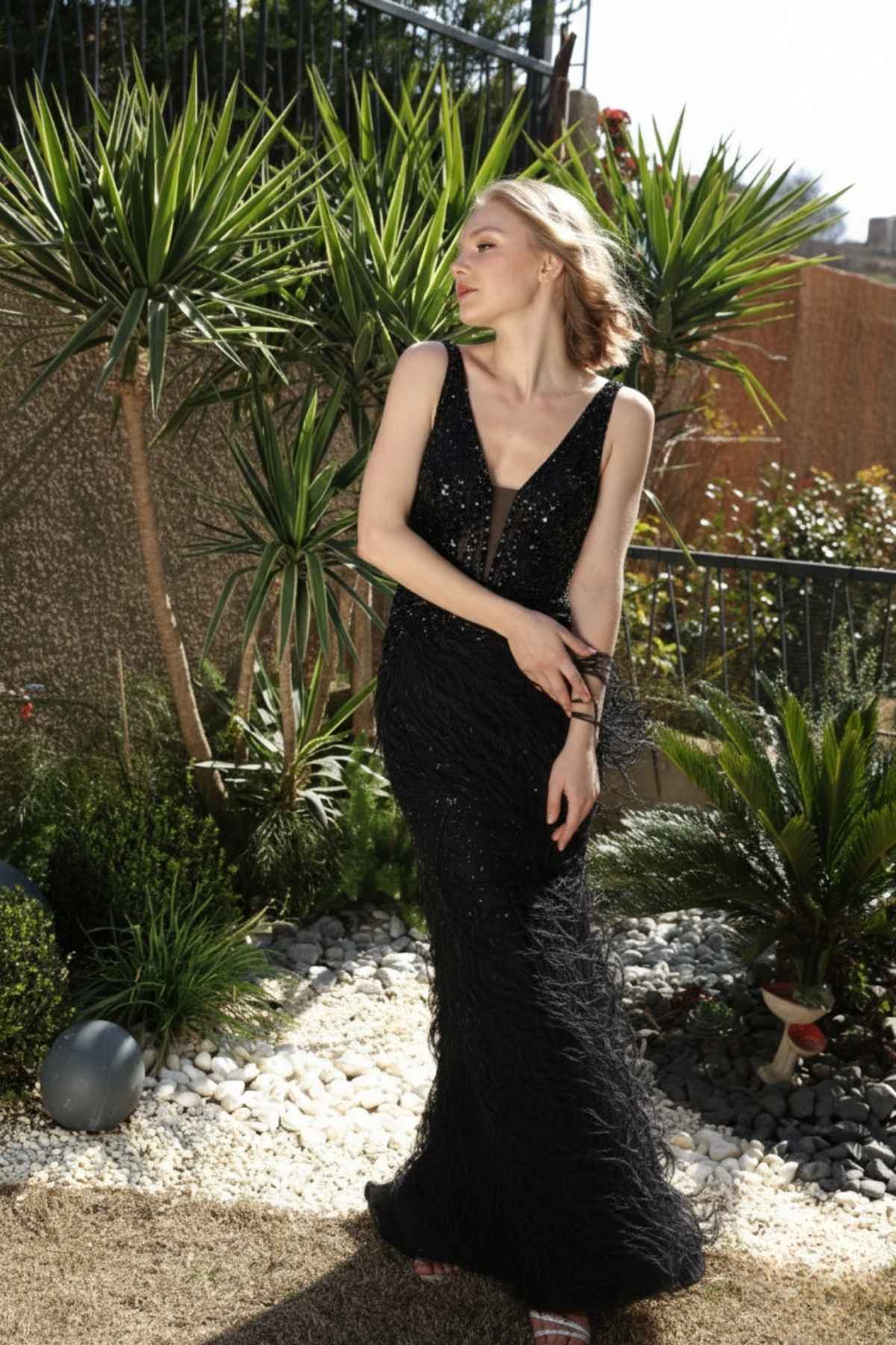 Siyah Derin V Tüy Detaylı Taşlı İthal Abiye Elbise