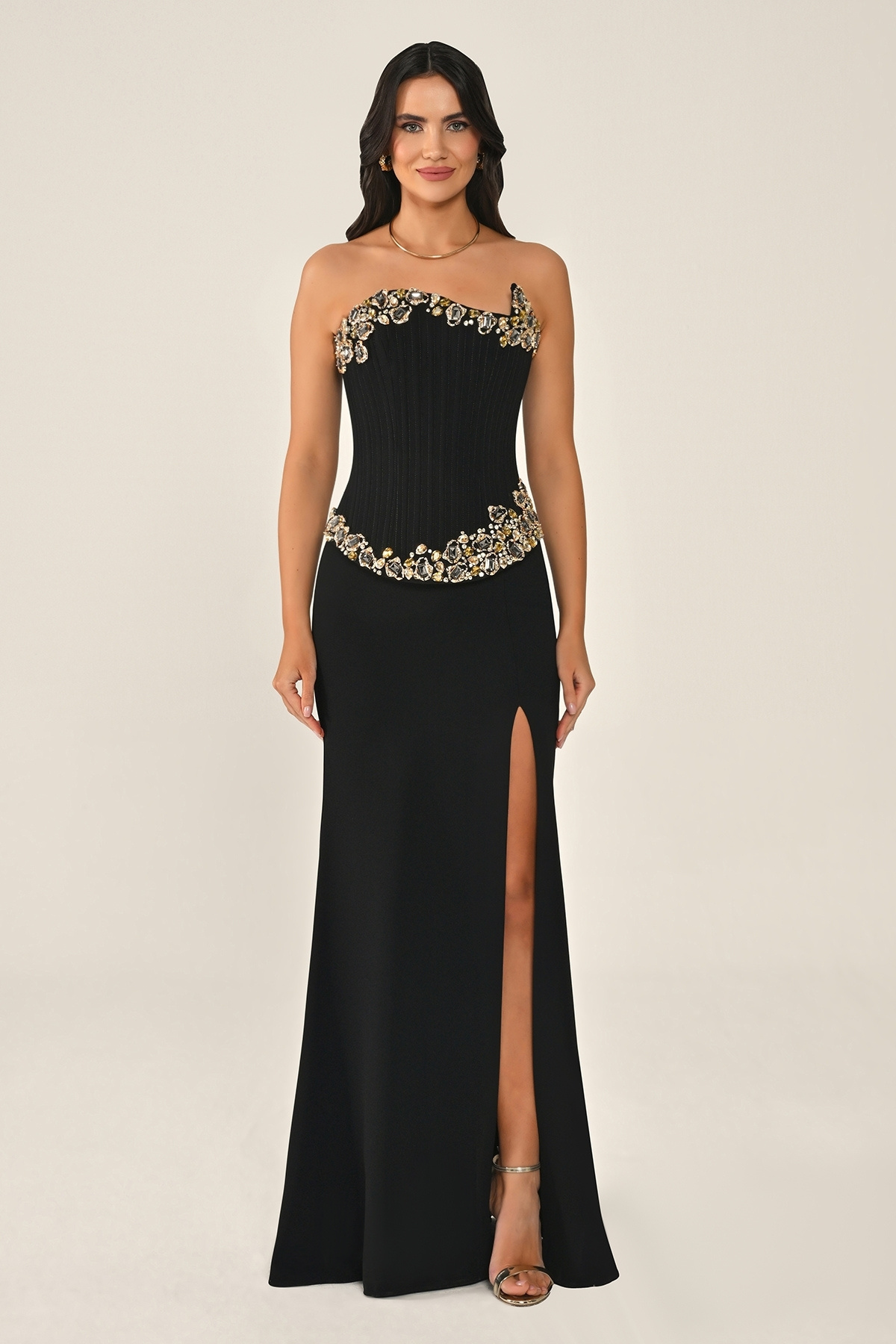 Siyah Gepiyerli Asimetrik Yaka Taşlıı Abiye Elbise 81