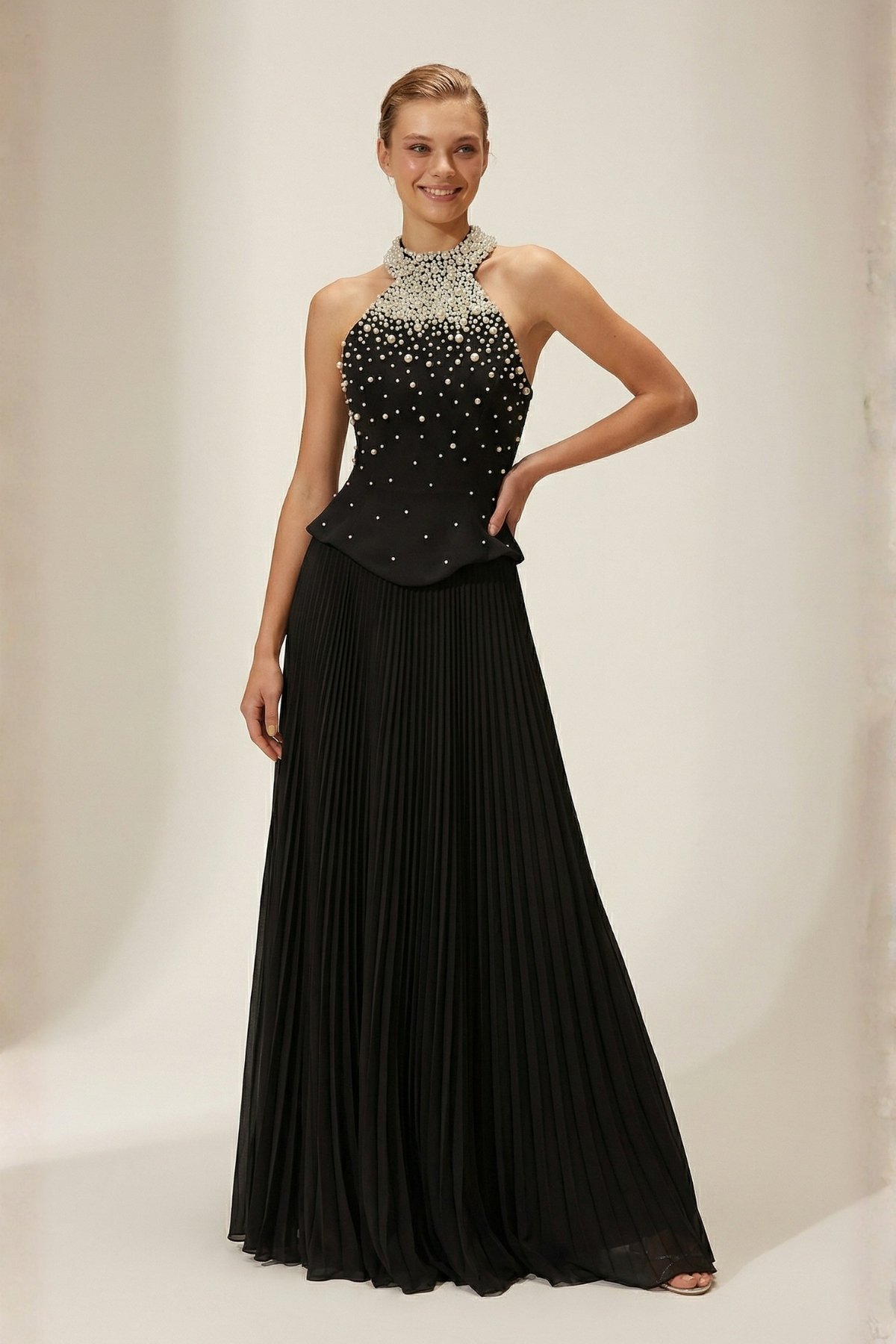 Siyah Halter Yaka İnci İşlemeli Plise Etek Abiye Elbise 39