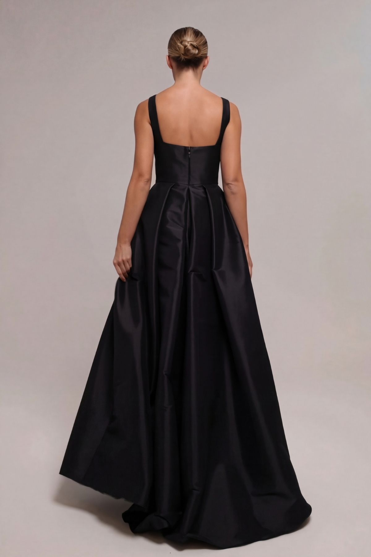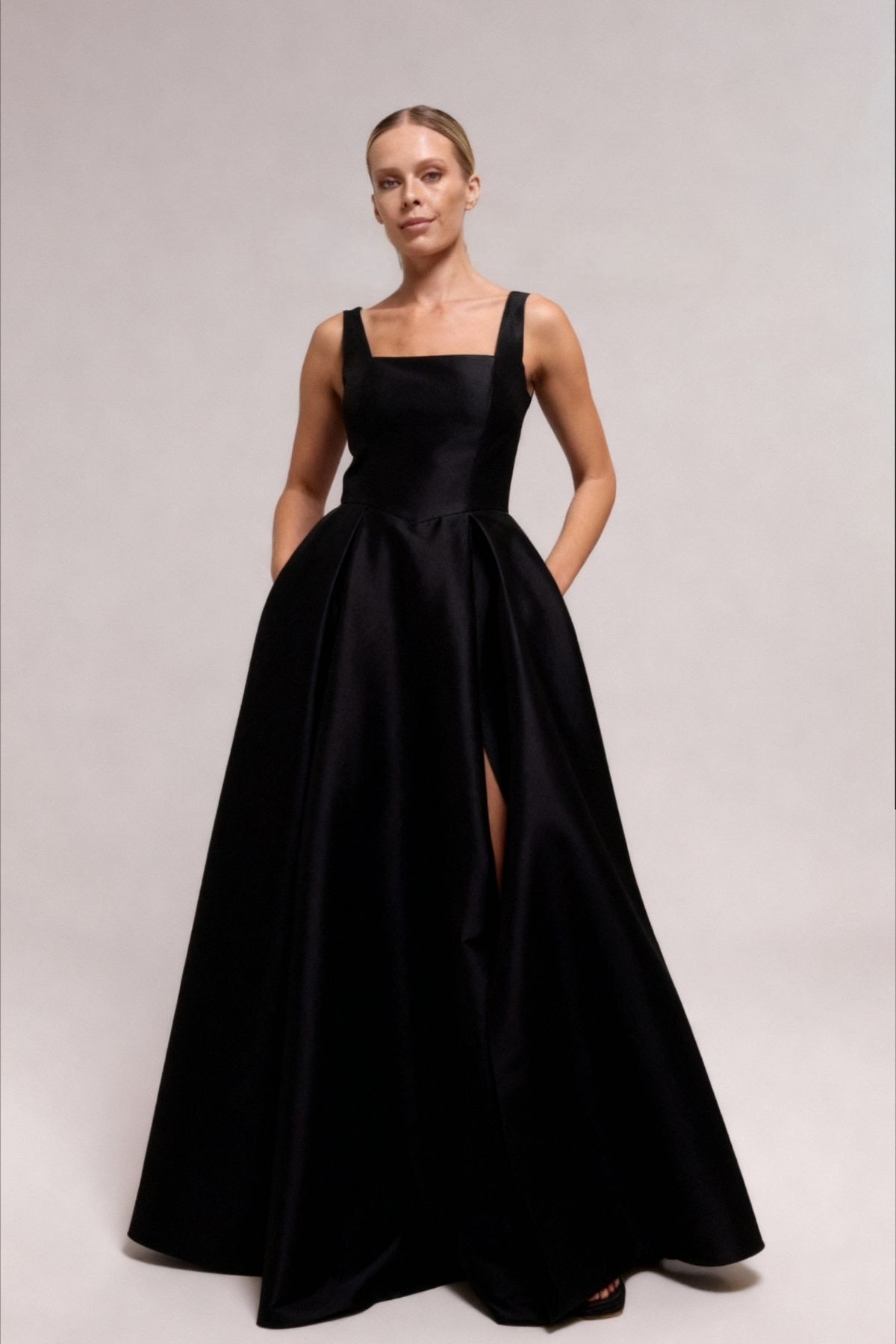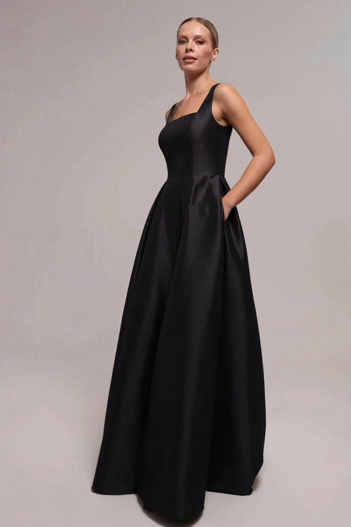 Siyah Kare Yaka Kalın Askılı Cepli Yırtmaçlı Tafta Abiye Elbise 91
