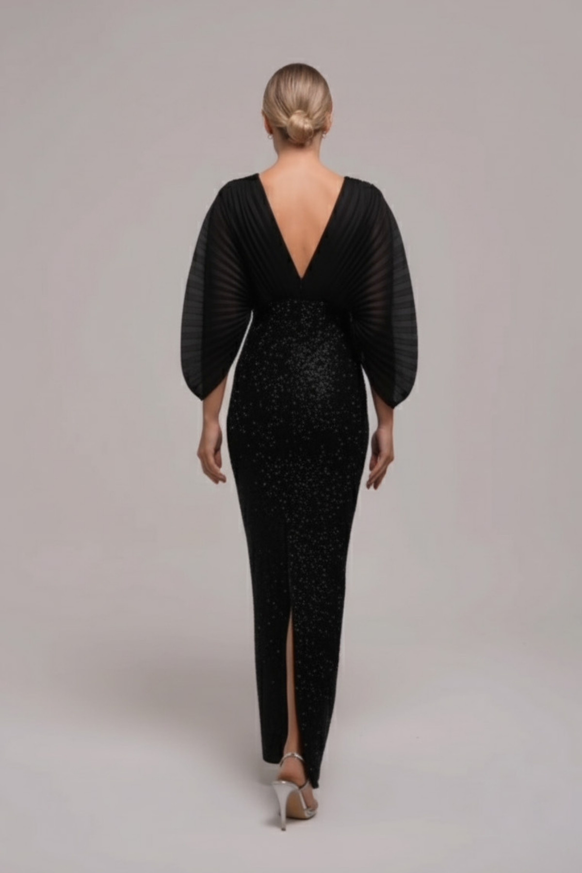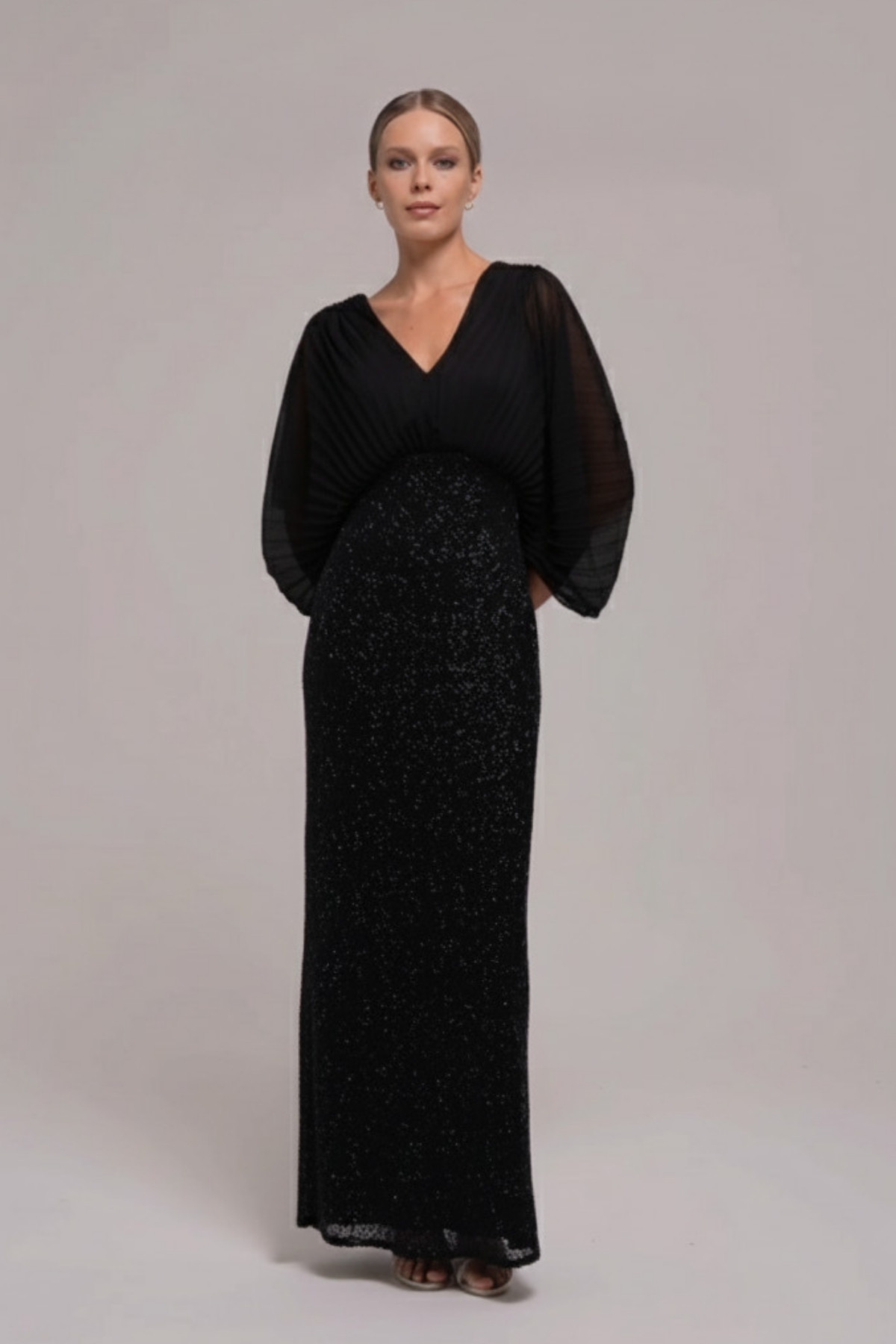 Siyah Ön Arka V Omzu Taşlı Pliseli Payetli Büyük Beden Abiye Elbise 29