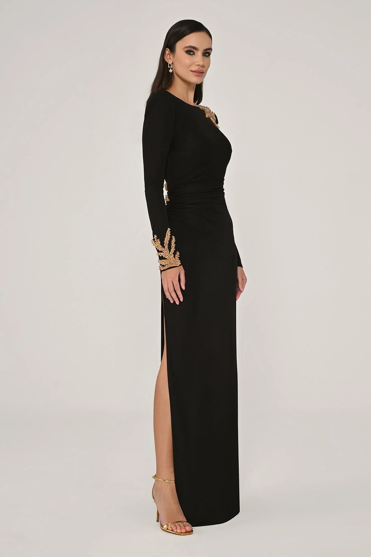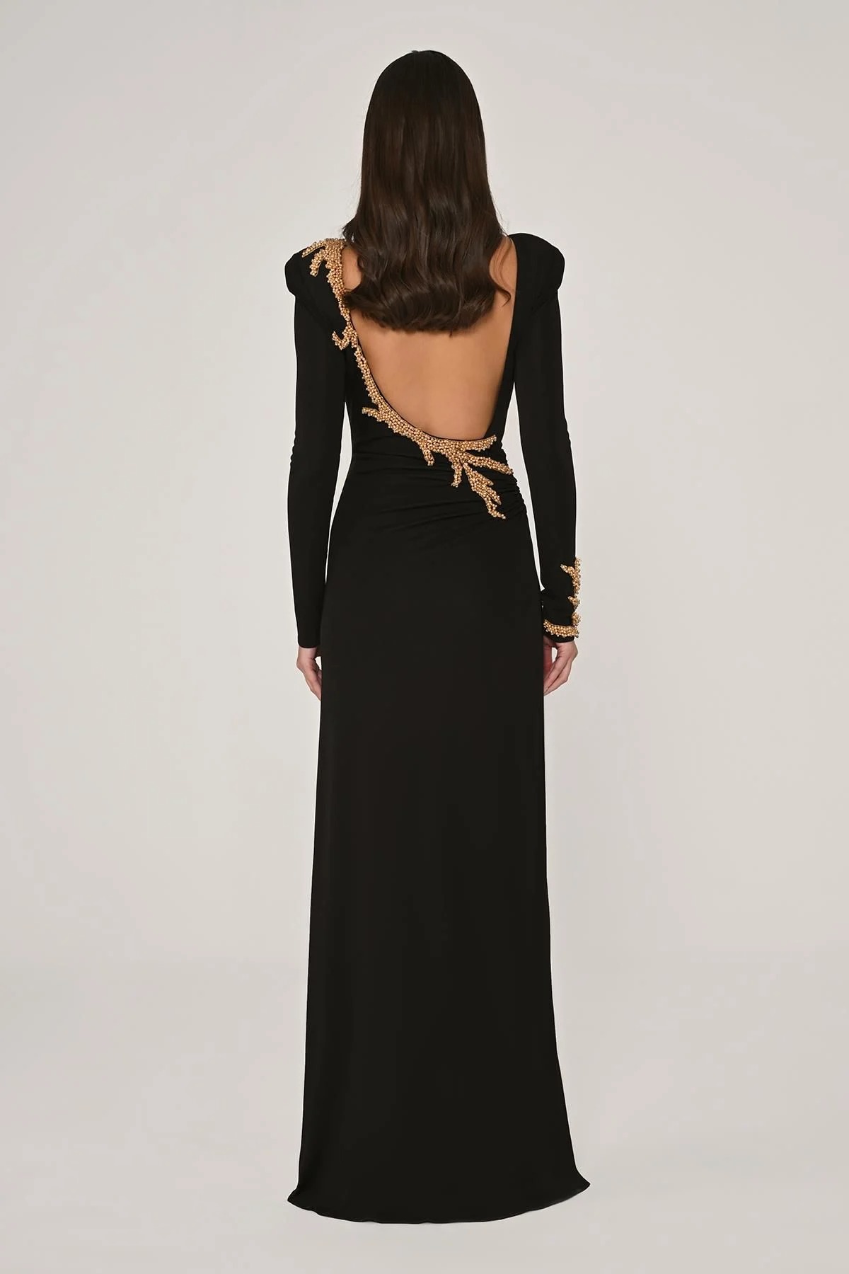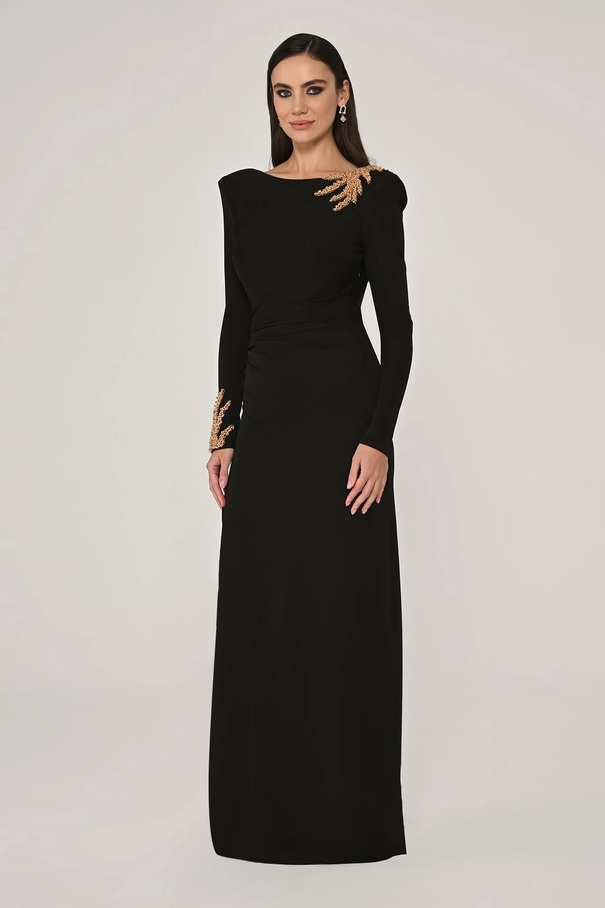 Siyah Sırt Dekolteli İşlemeli Vatkalı Abiye Elbise 49