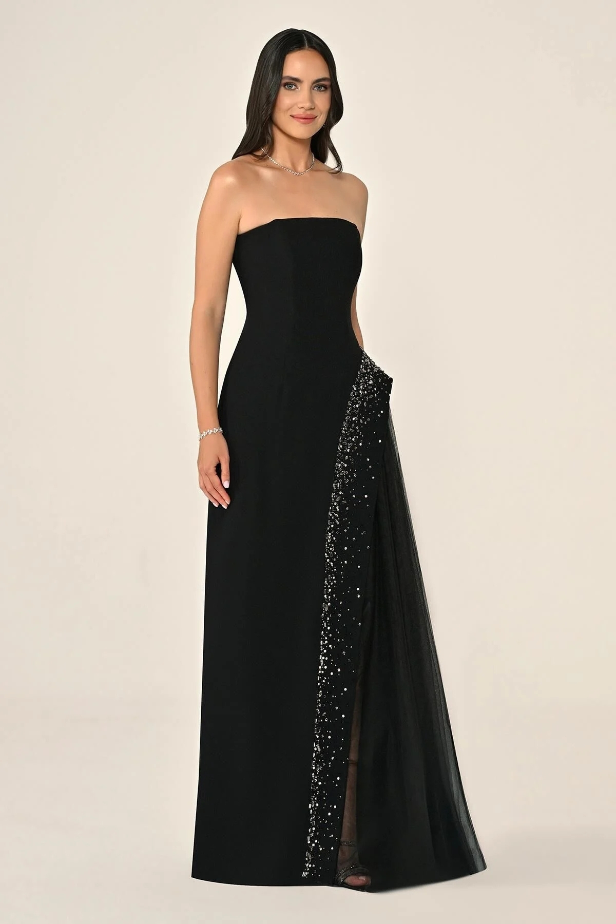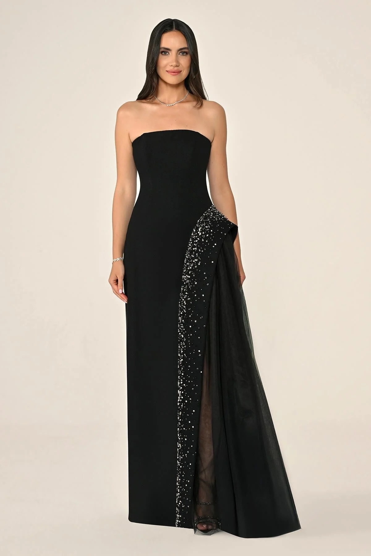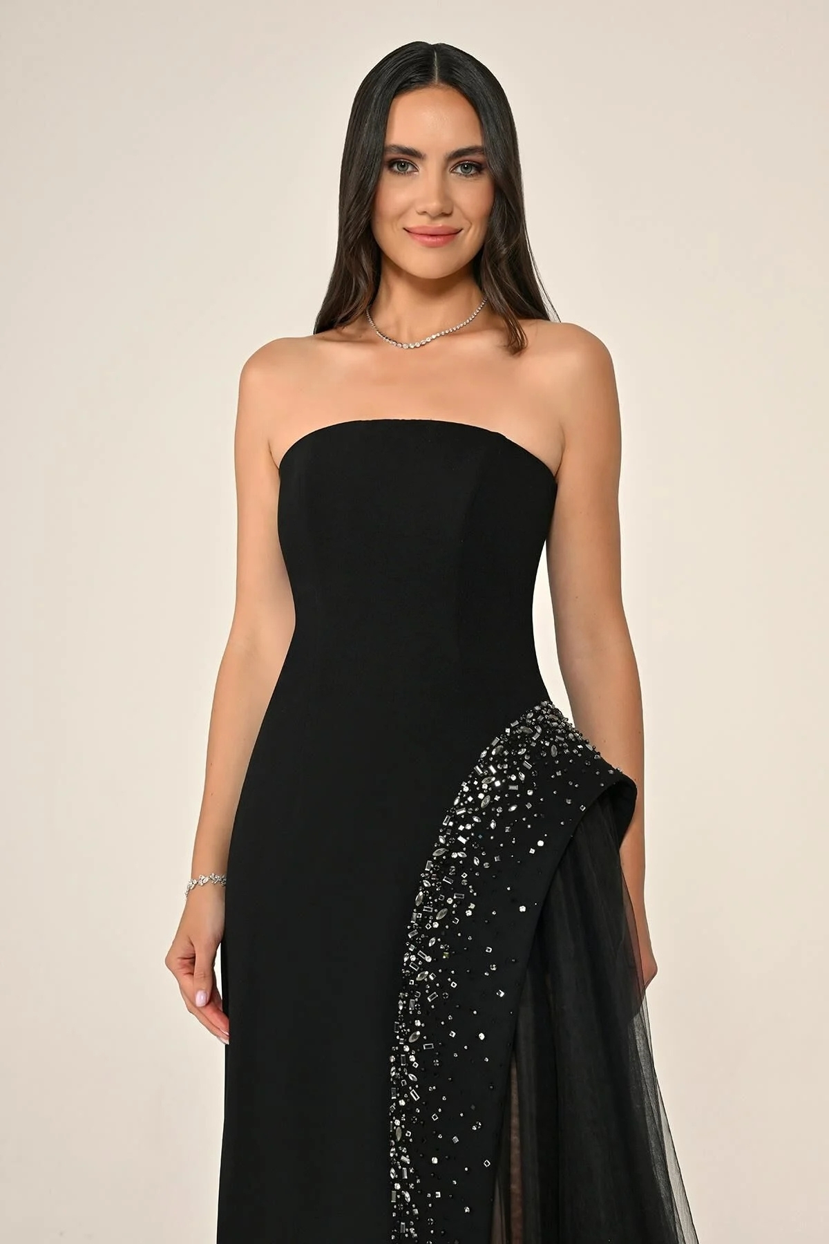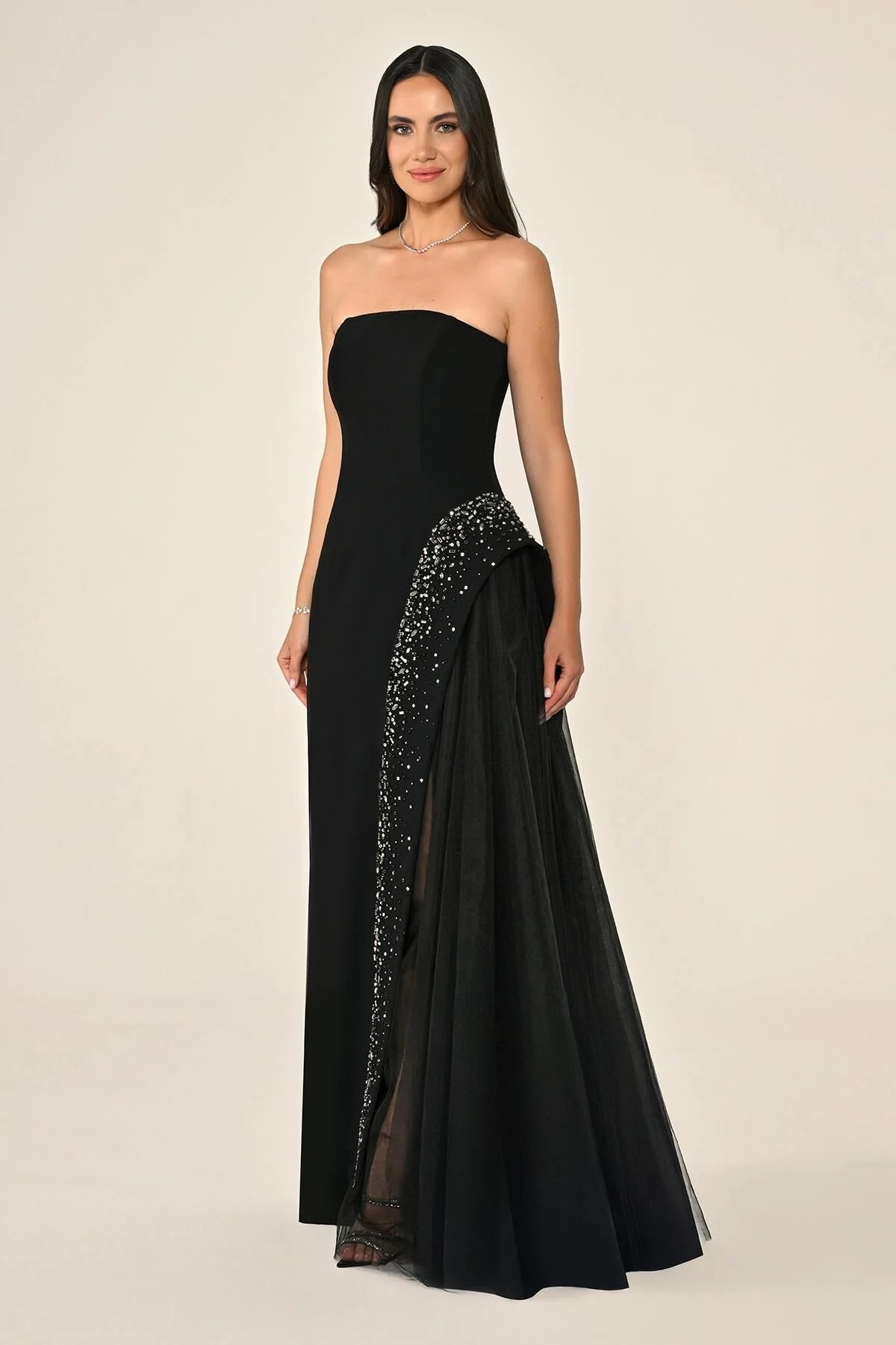 Siyah Straplez Eteği Taşlı Tüllü Krep Abiye Elbise 80