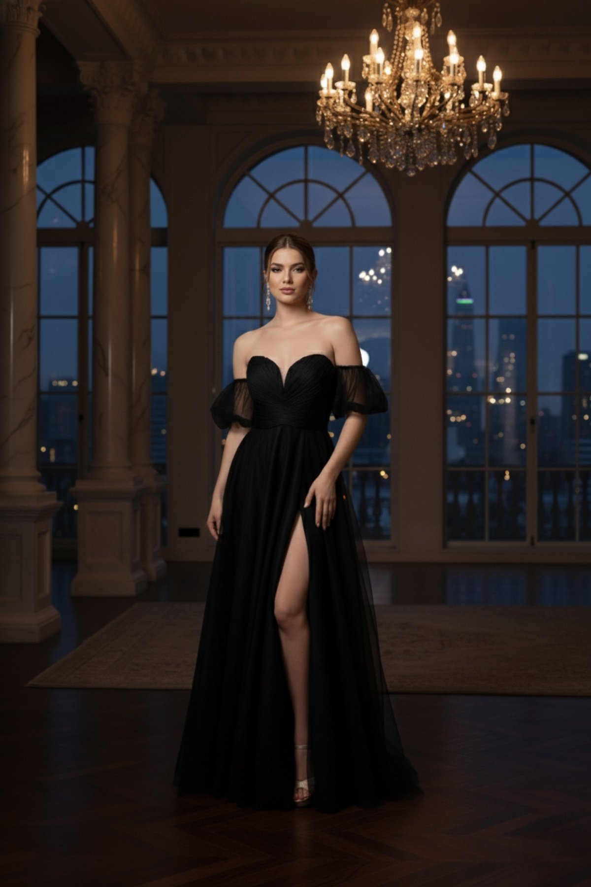 Siyah Straplez Göğsü Drapeli Balon Kol Yırtmaçlı Abiye Elbise 97